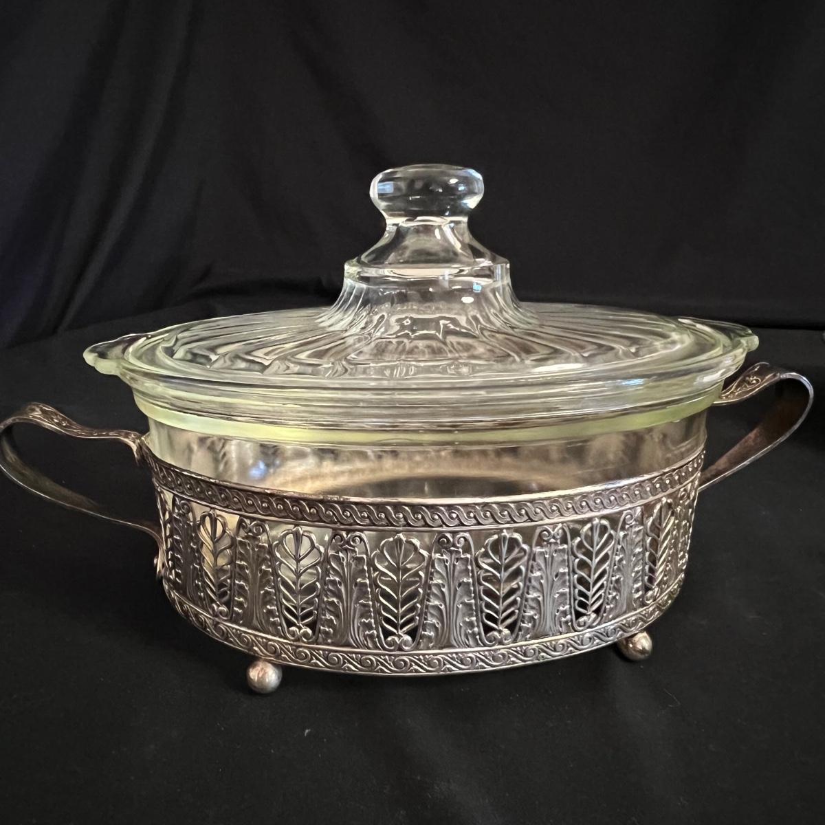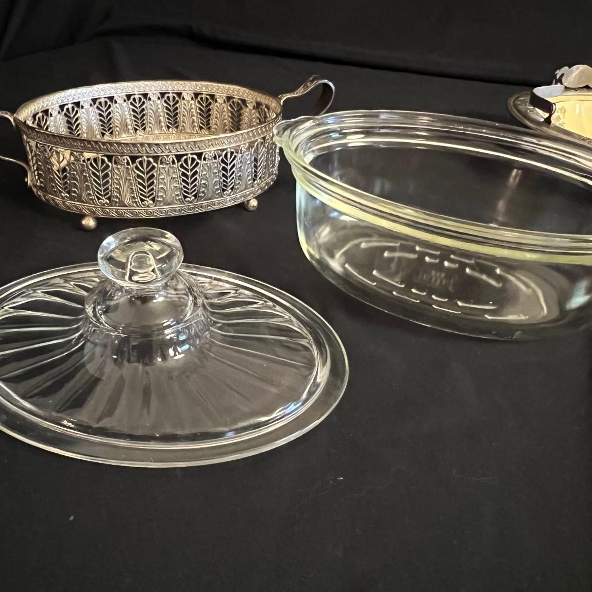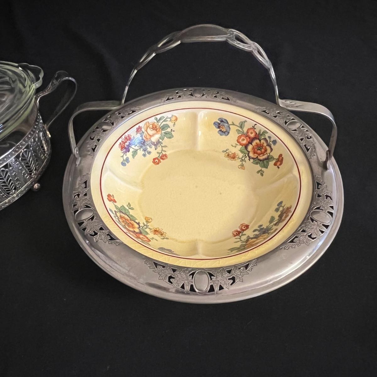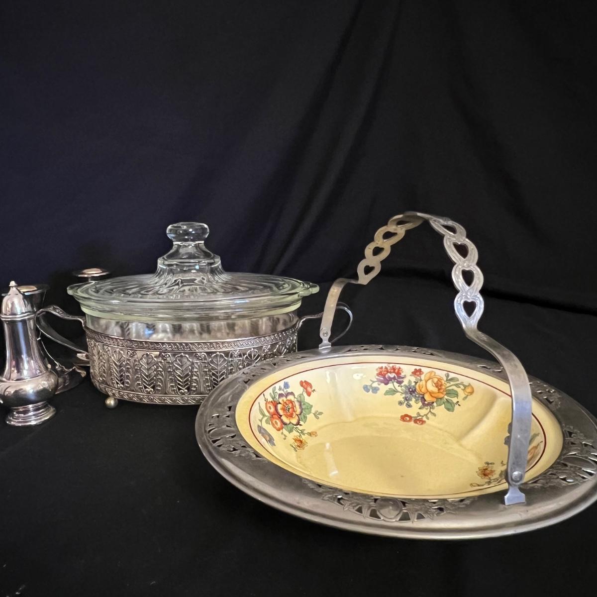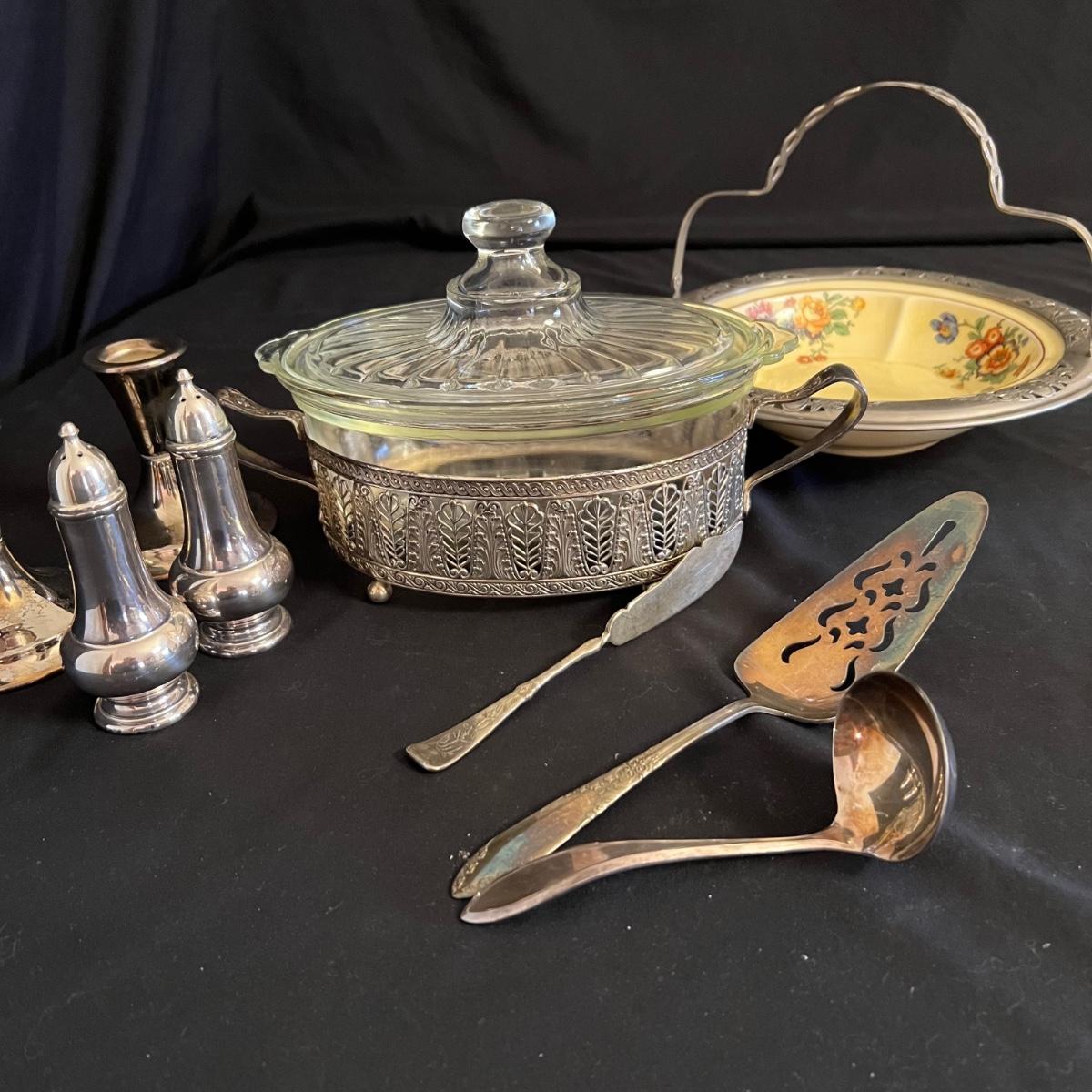 An assortment of silverplated items for fine dining here that includes salt and pepper shakers, 2 candlestick holders, 3 serving utensils as well as a lidded glass serving bowl that is housed in an ornate silverplated basket with handles and a pottery dish by Sebring Pottery that has a silver metal holder with handle. Note this ceramic dish has significant crazing in its glaze., it measures 9.5” D x 3” High.