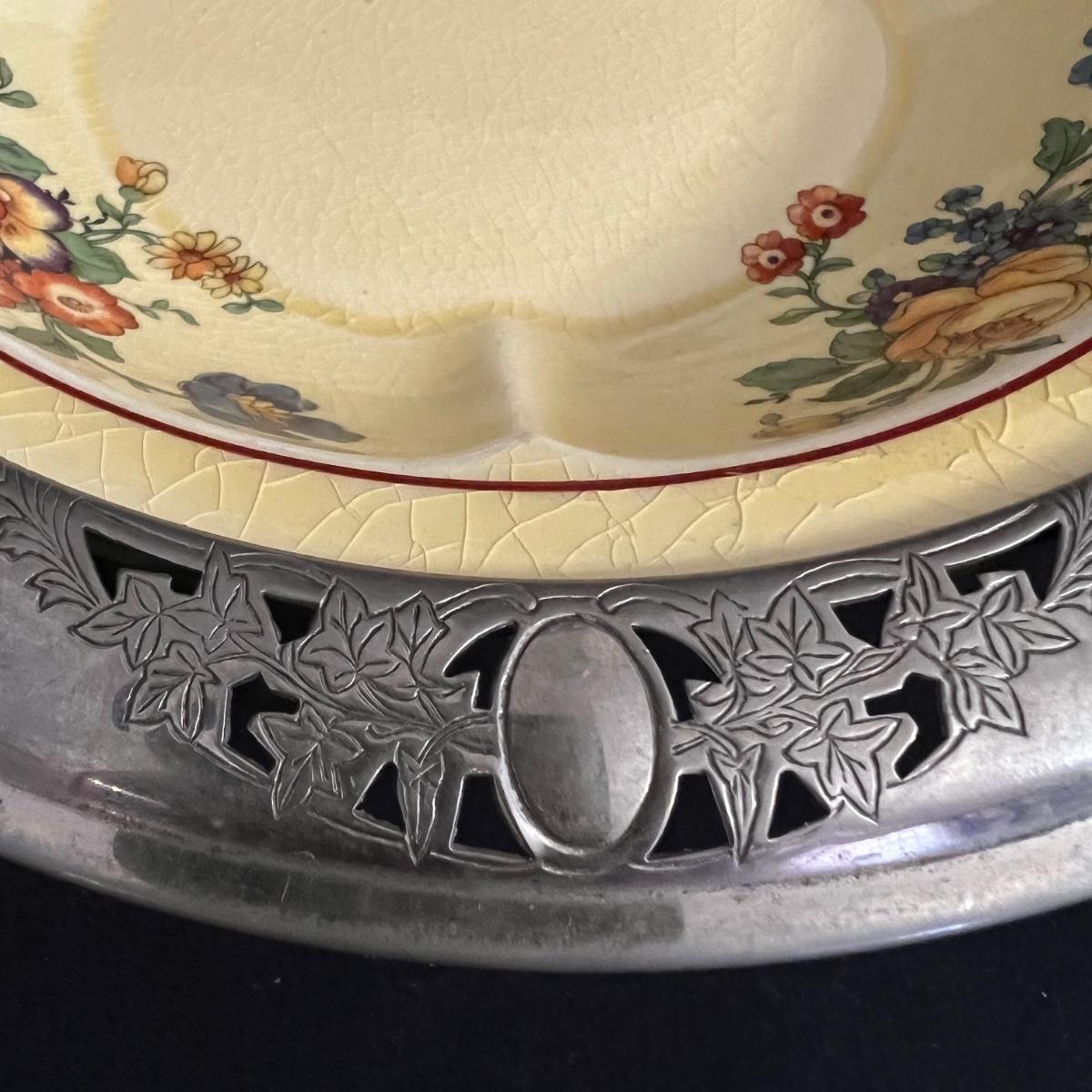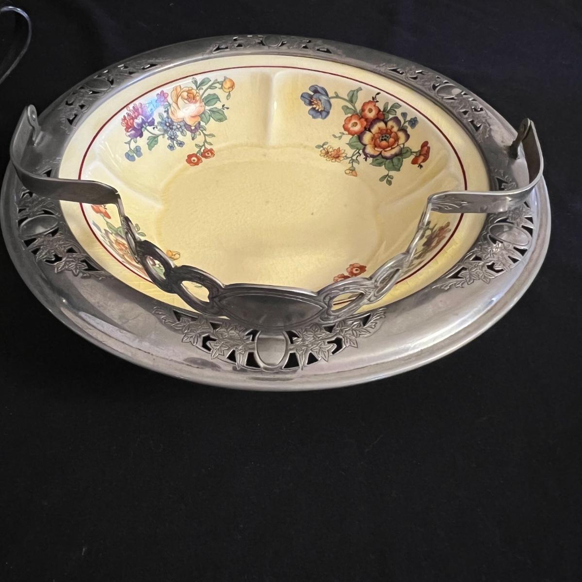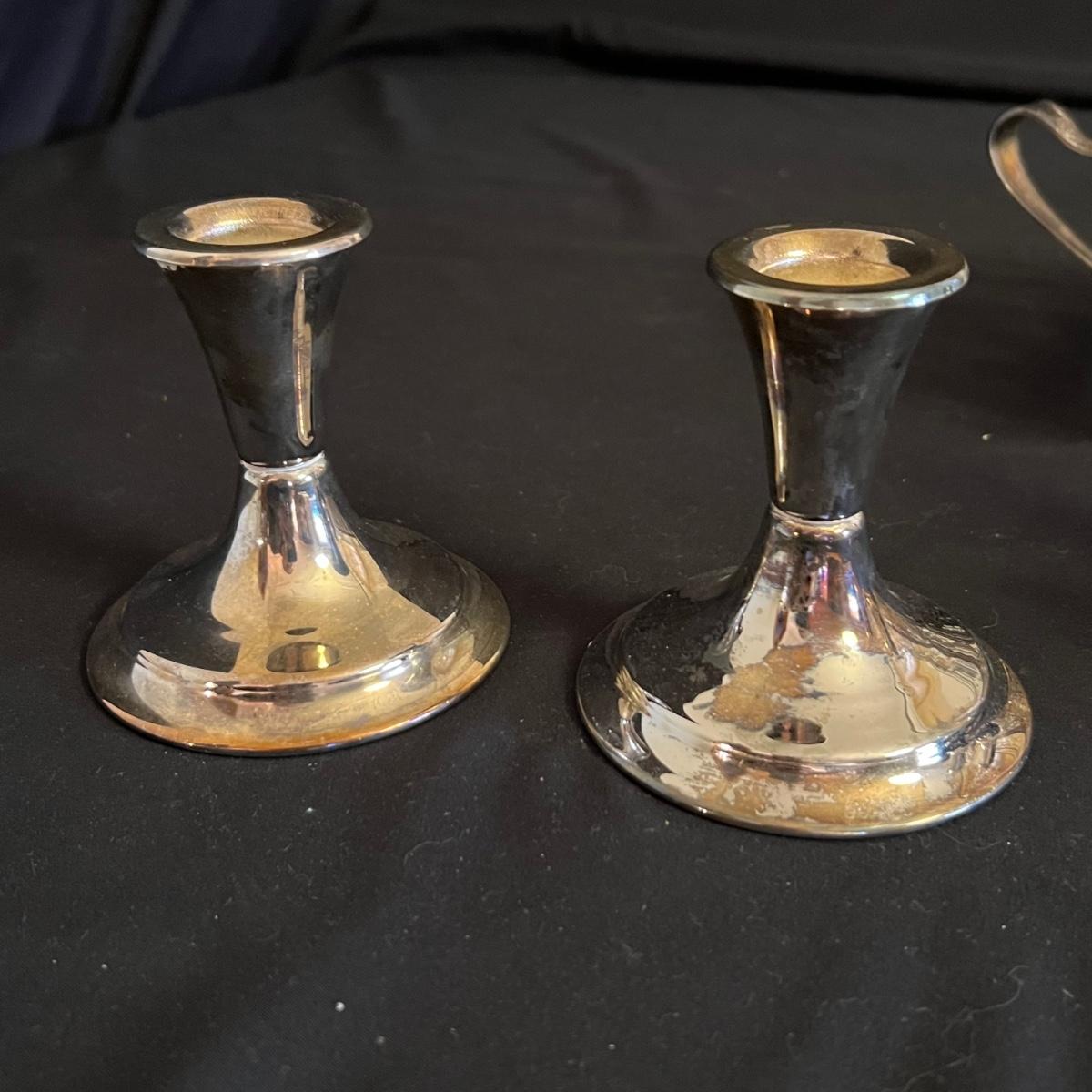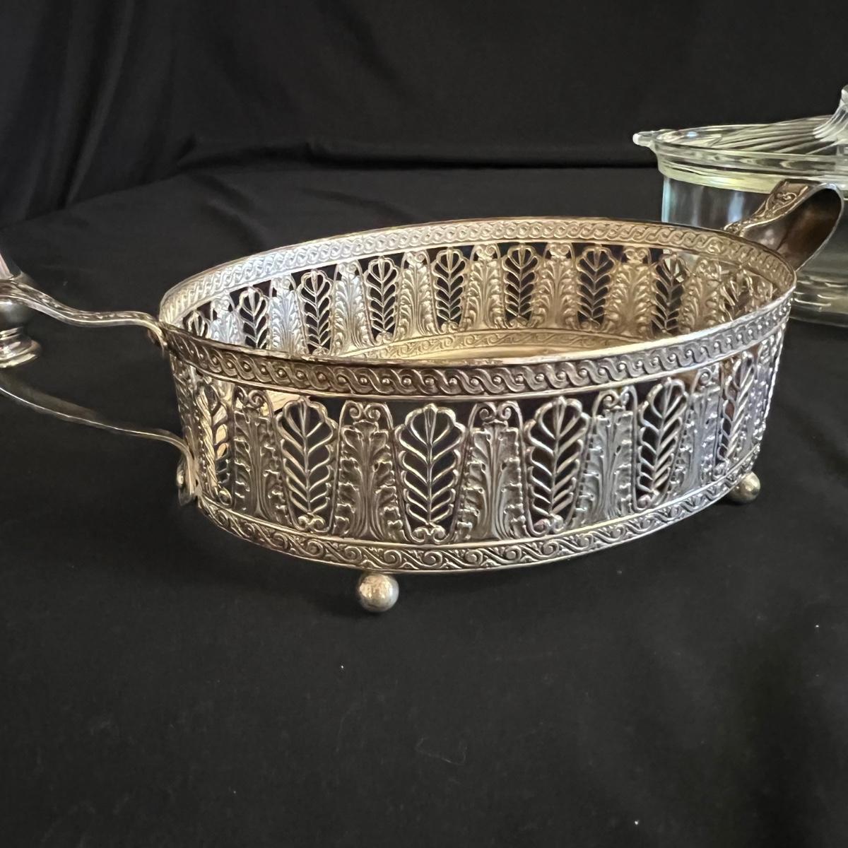 An assortment of silverplated items for fine dining here that includes salt and pepper shakers, 2 candlestick holders, 3 serving utensils as well as a lidded glass serving bowl that is housed in an ornate silverplated basket with handles and a pottery dish by Sebring Pottery that has a silver metal holder with handle. Note this ceramic dish has significant crazing in its glaze., it measures 9.5” D x 3” High.
