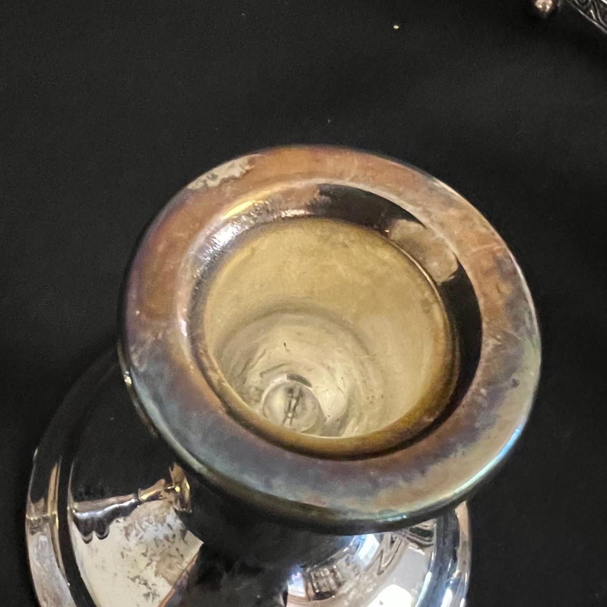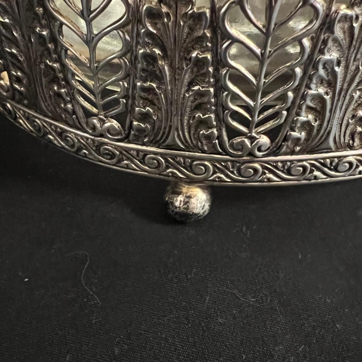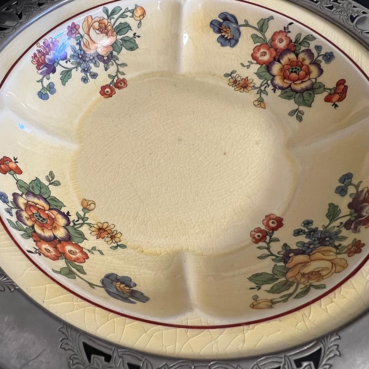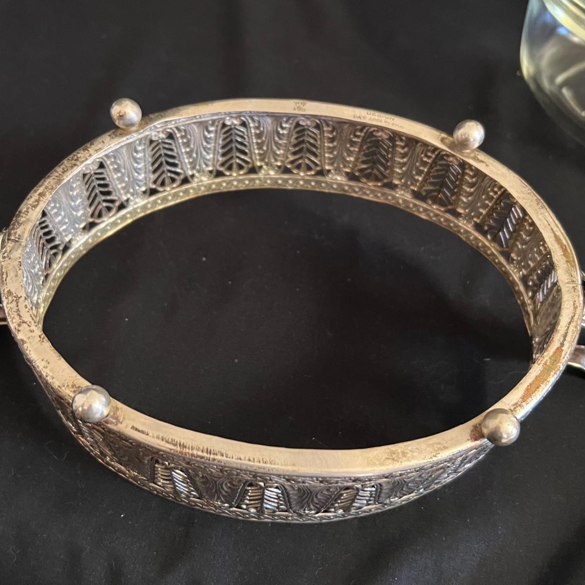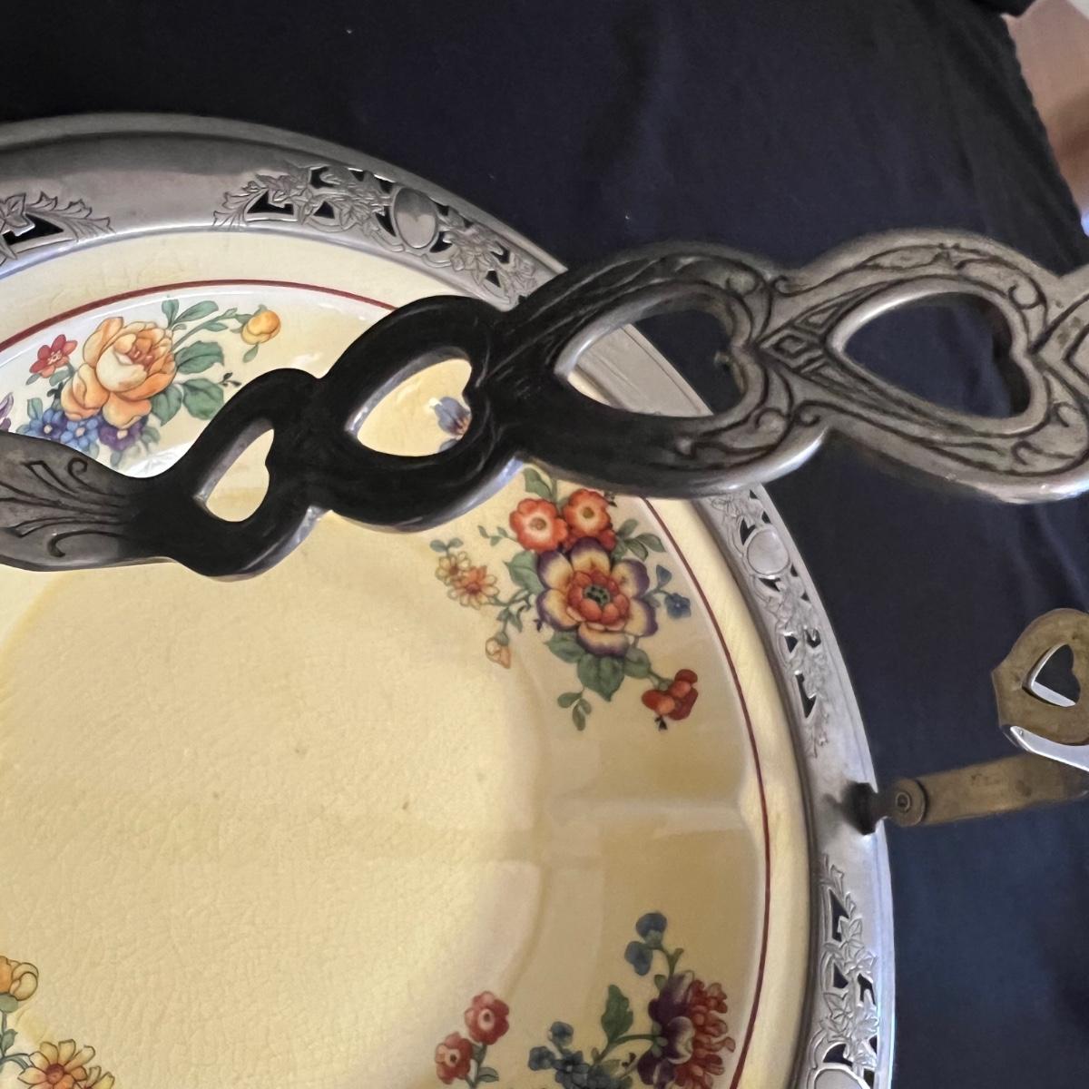 An assortment of silverplated items for fine dining here that includes salt and pepper shakers, 2 candlestick holders, 3 serving utensils as well as a lidded glass serving bowl that is housed in an ornate silverplated basket with handles and a pottery dish by Sebring Pottery that has a silver metal holder with handle. Note this ceramic dish has significant crazing in its glaze., it measures 9.5” D x 3” High.