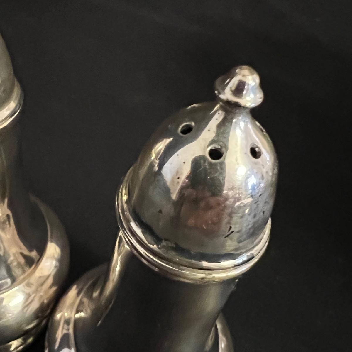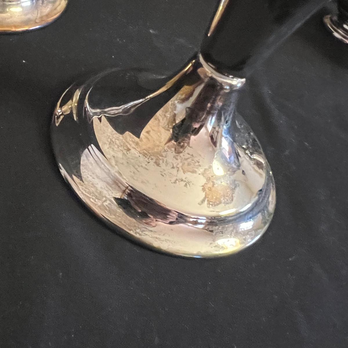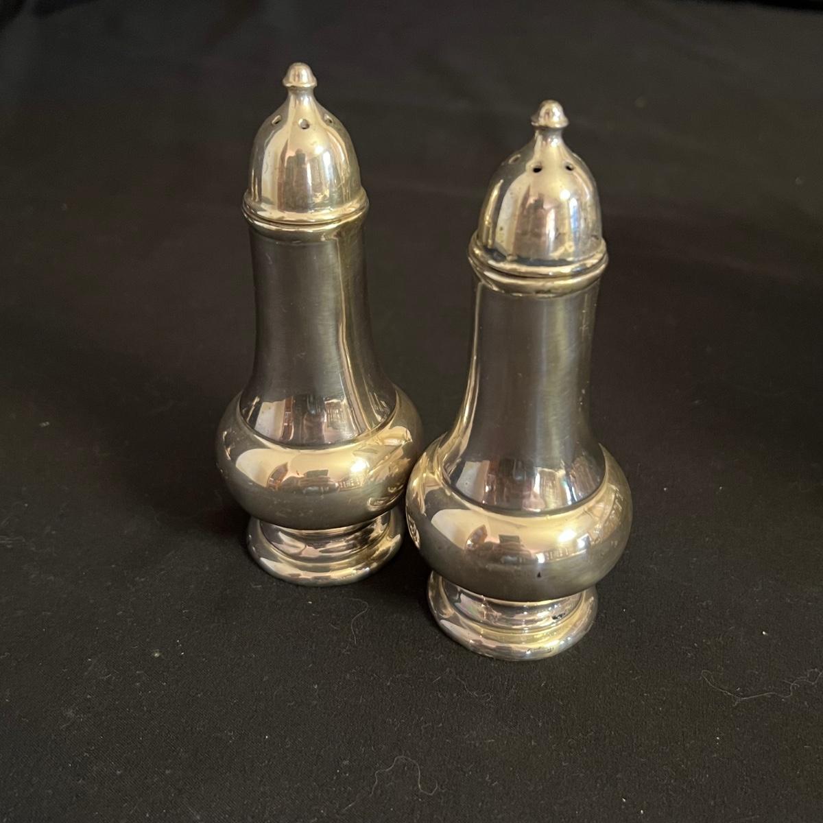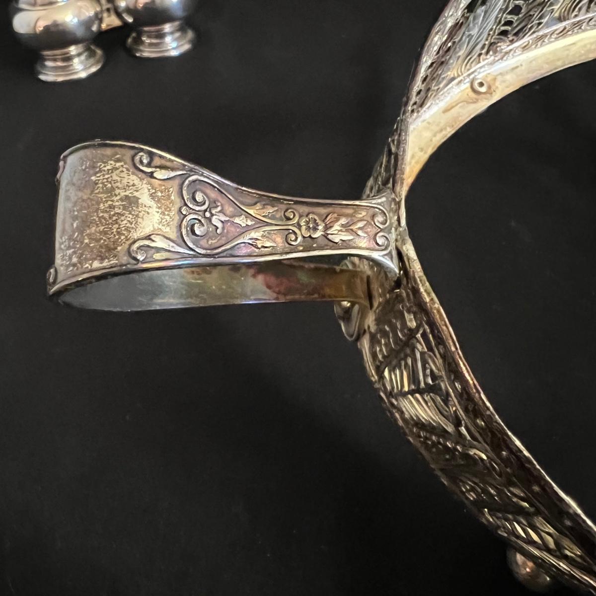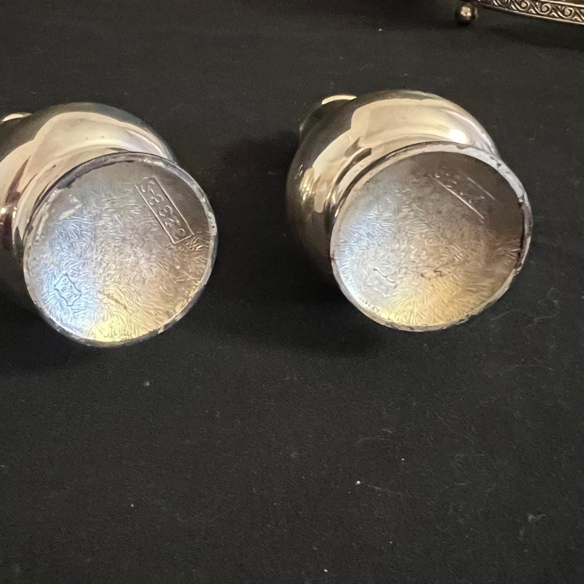 An assortment of silverplated items for fine dining here that includes salt and pepper shakers, 2 candlestick holders, 3 serving utensils as well as a lidded glass serving bowl that is housed in an ornate silverplated basket with handles and a pottery dish by Sebring Pottery that has a silver metal holder with handle. Note this ceramic dish has significant crazing in its glaze., it measures 9.5” D x 3” High.