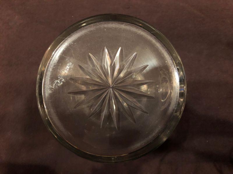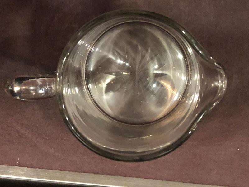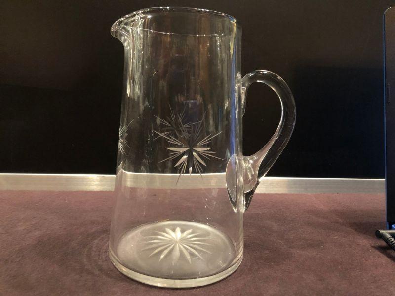 VINTAGE ORIGINAL MID CENTURY HAND BLOWN GLASS, THIS IS A STUNNING MID CENTURY HAND BLOWN PITCHER WHICH WAS HAND BLOWN OF DELICATE CRYSTAL CLEAR GLASS AND THEN HAND CUT WITH A DEEP STAR PATTERN IN THE CENTER OF THE BOTTOM OF THE PITCHER. PITCHER HAS A SMALL SPOUT AND THICK PULLED GLASS HANDLE. NO CHIPS, NICKS OR CRACKS. 8 1/4" T X 6 1/2"W
