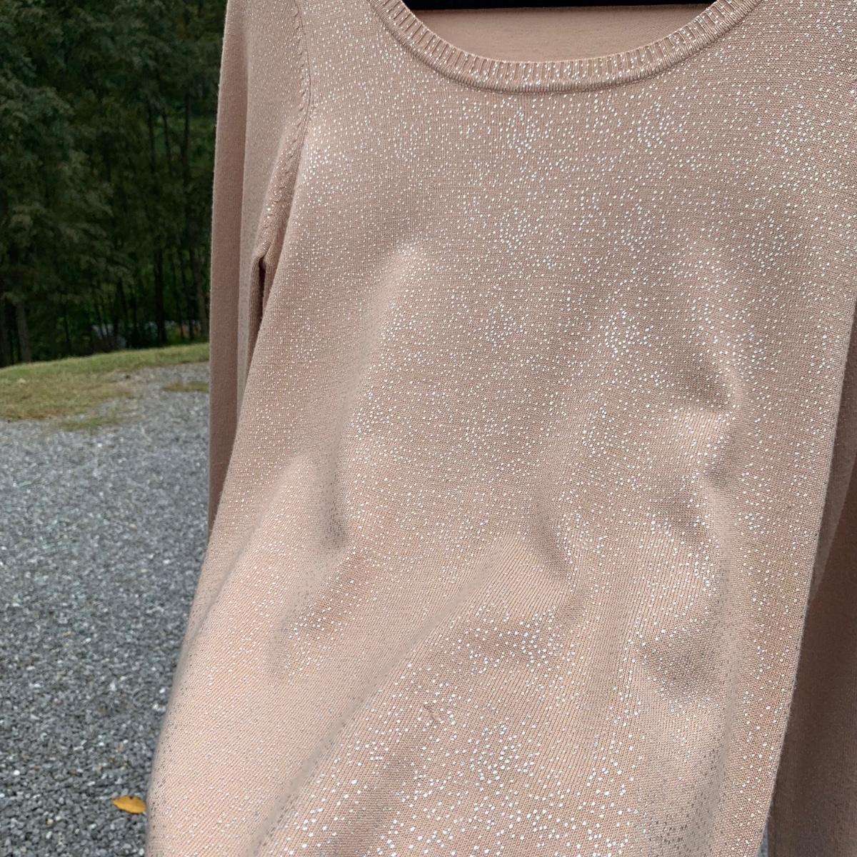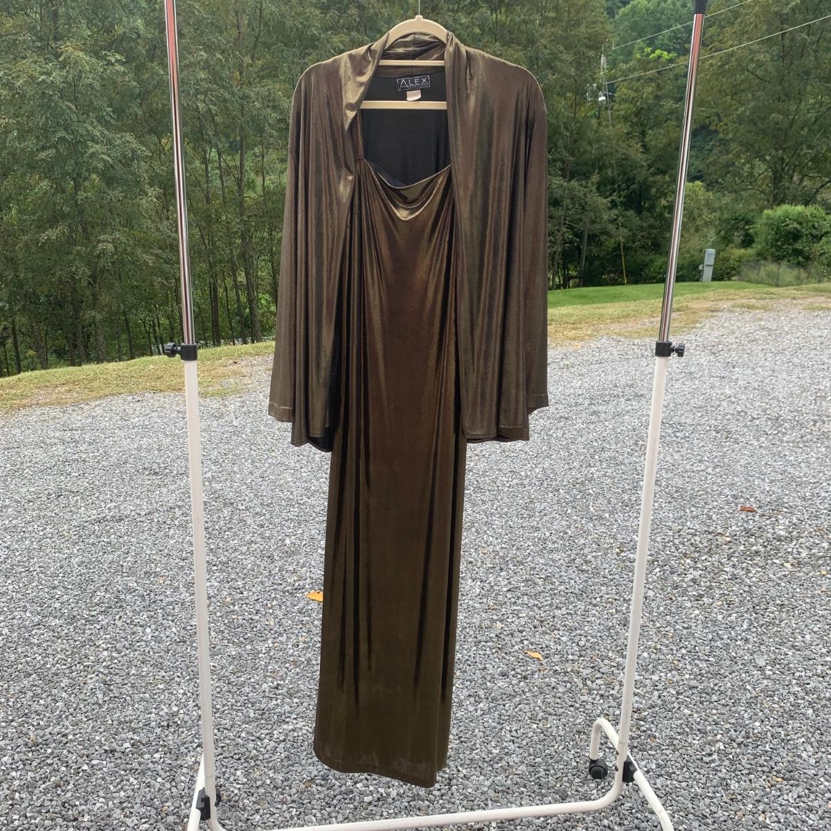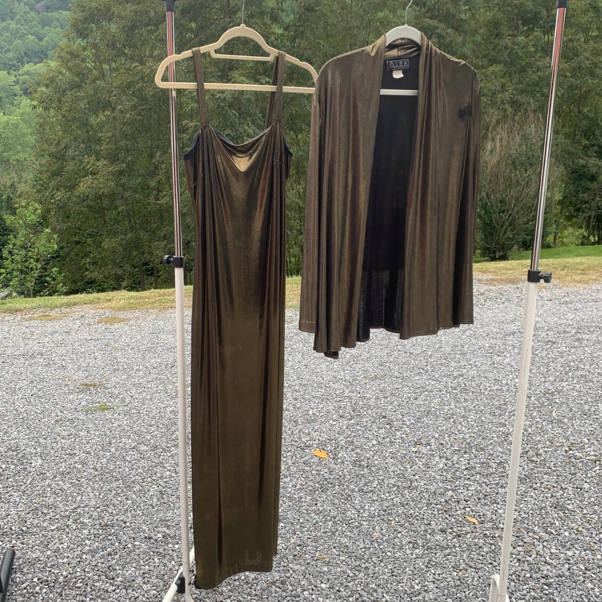 Approximately 40 items in this collection of nice quality women’s clothing. Included are sweaters, sleeveless tops, dresses, skirts, pants, an evening wear gown, a three-piece suit set, and more. There are multiple silk garments, some velvet, and sparkling sweaters with golden threads woven throughout. Sizes are mostly S and M. A couple items have small stains. Please see photos for inventory and details. Hangers are not included.