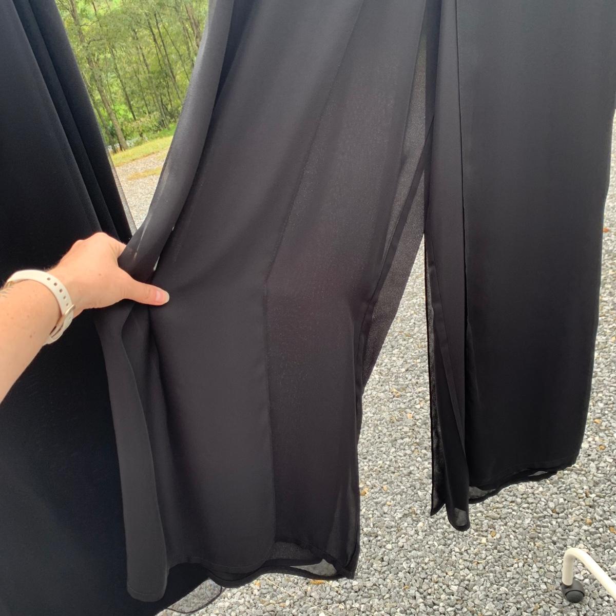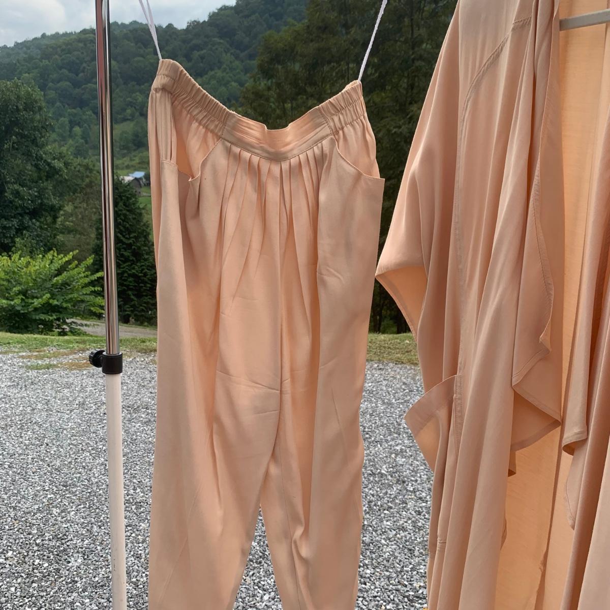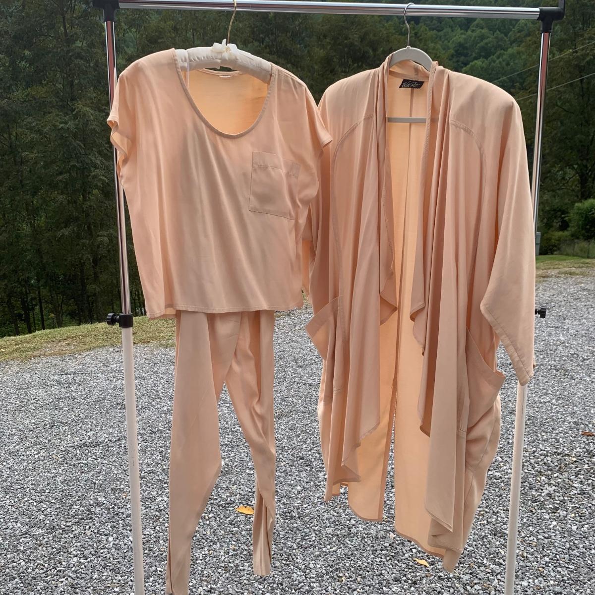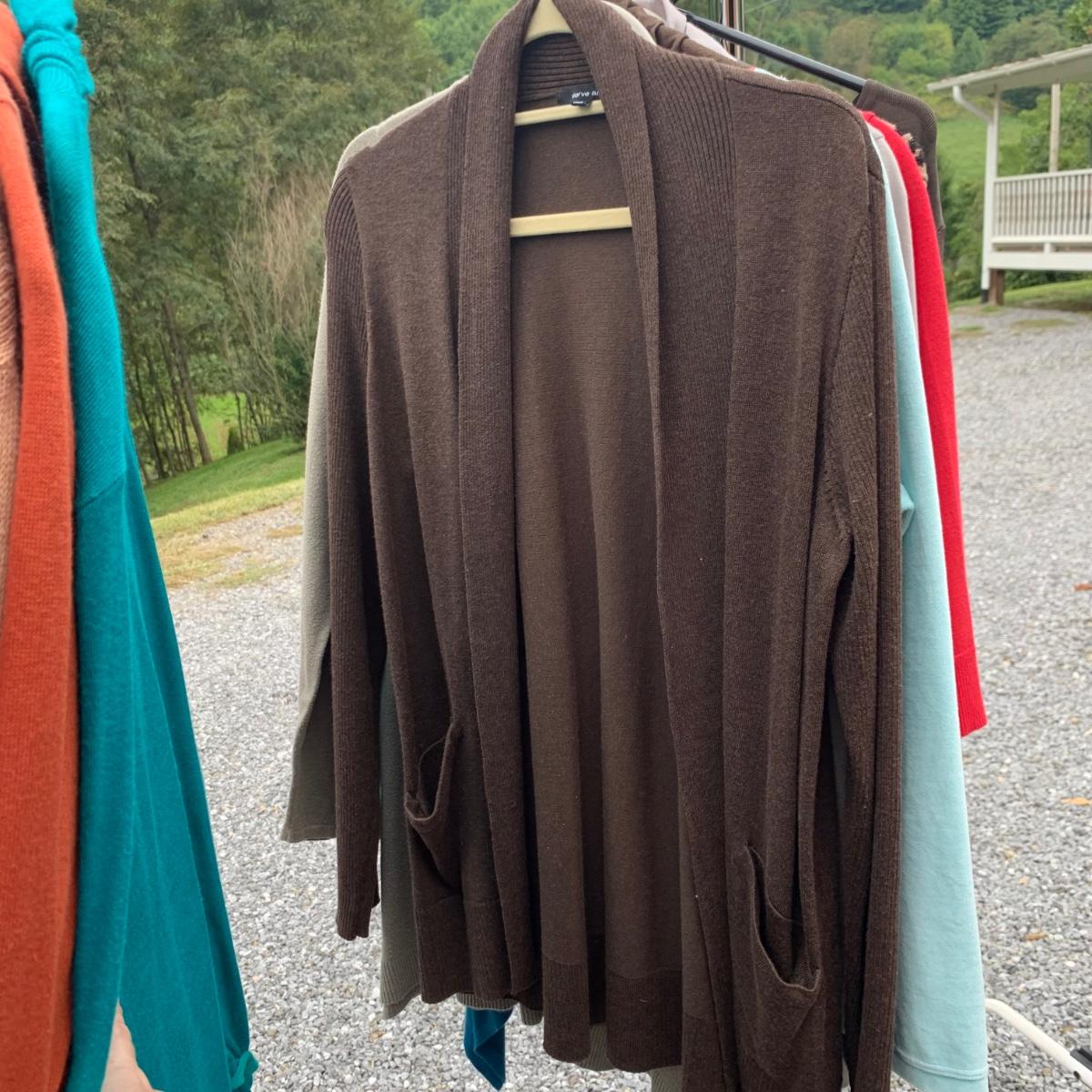 Approximately 40 items in this collection of nice quality women’s clothing. Included are sweaters, sleeveless tops, dresses, skirts, pants, an evening wear gown, a three-piece suit set, and more. There are multiple silk garments, some velvet, and sparkling sweaters with golden threads woven throughout. Sizes are mostly S and M. A couple items have small stains. Please see photos for inventory and details. Hangers are not included.
