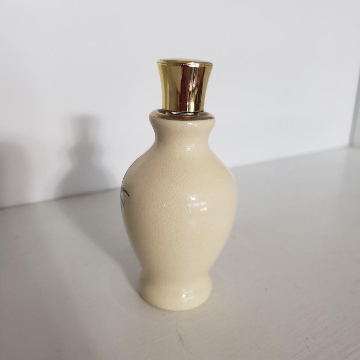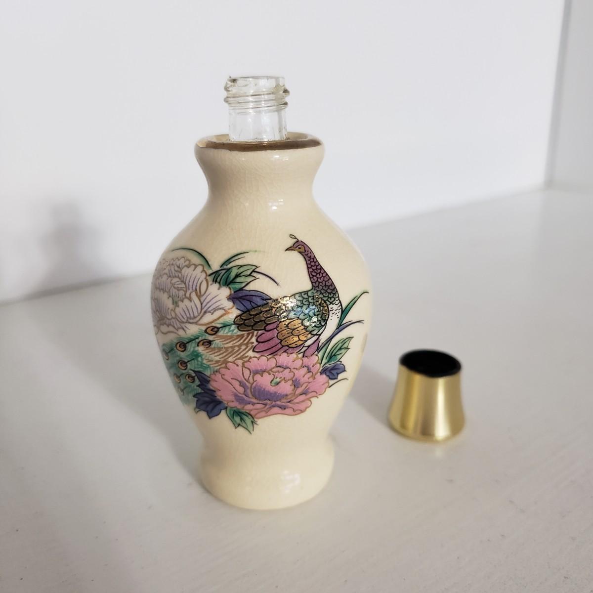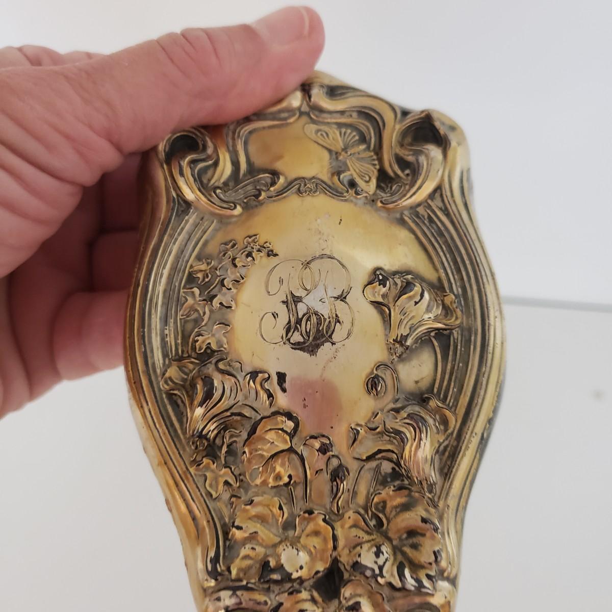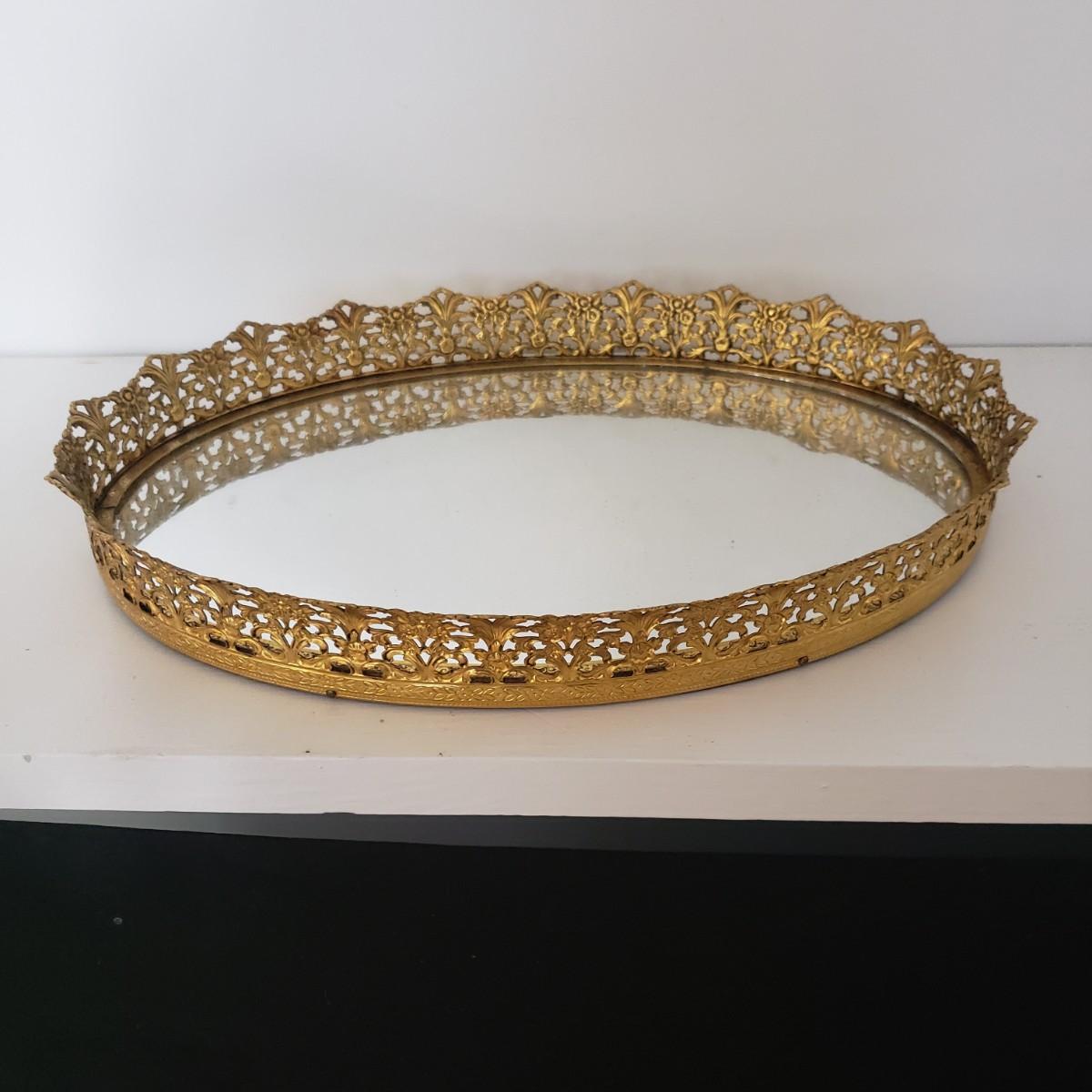 This elegant vanity collection has a mirrored, gold colored tray measuring 12" x 9" x 1"H. The tray has a material covered bottom. The hand painted metal peacock can hold earrings and rings. The sterling silver mirror is missing the mirror piece and measures approximately 9" x 3". The mirror is engraved with a "BB" monogram. The Maui Rain perfume bottle with a floral and peacock picture, still has some perfume in it. The dried flower arrangement in a plastic frame was made in Austria and measures 4" x 4". The ornate plate with a clear plastic holder has green and gold like paint of a hut and water scene.