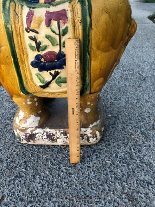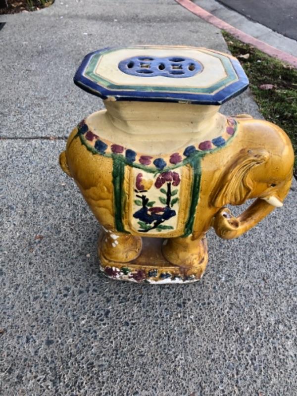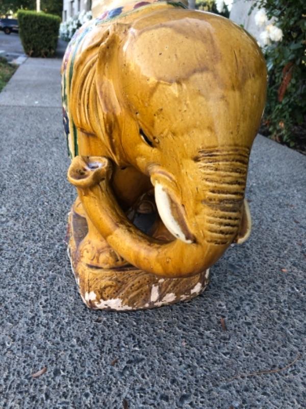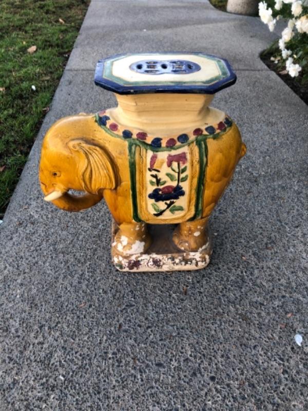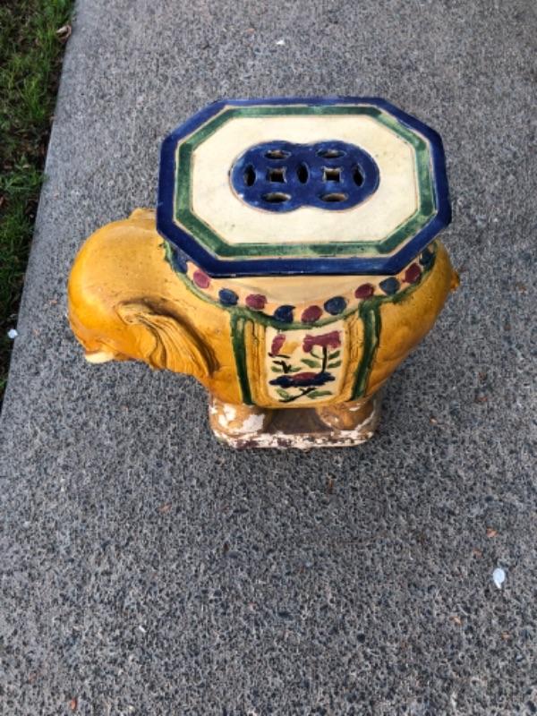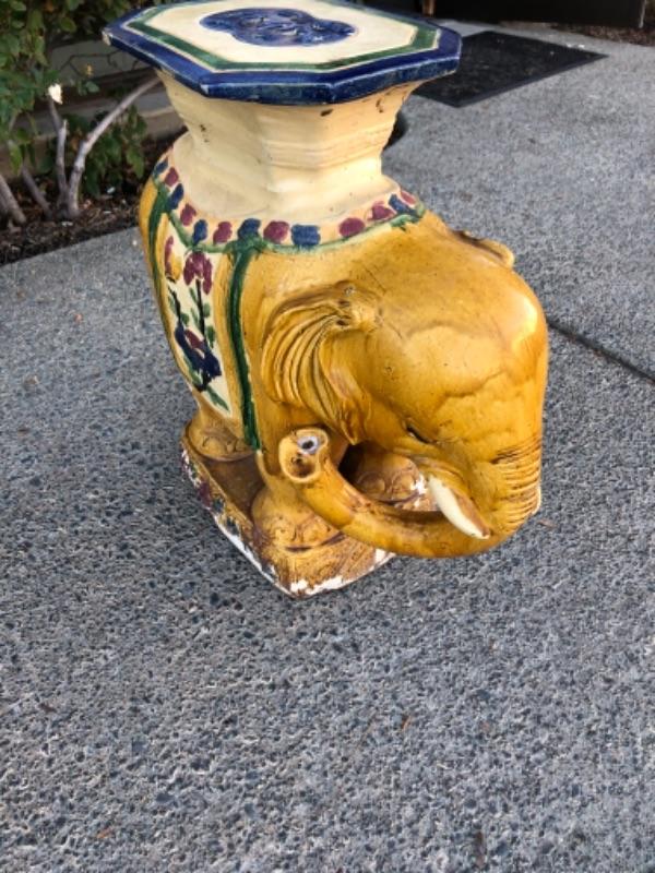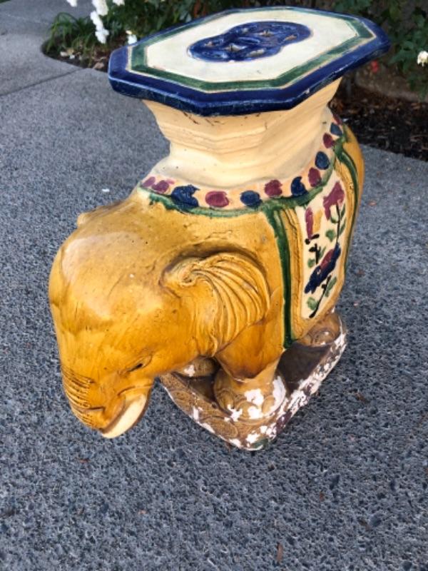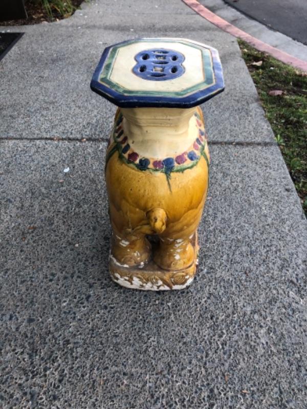 Colorful ceramic elephant plant stand. Ceramic statue great for indoor or outdoor decor. About 24” size. There is signs of age and wear, more towards the bottom.
