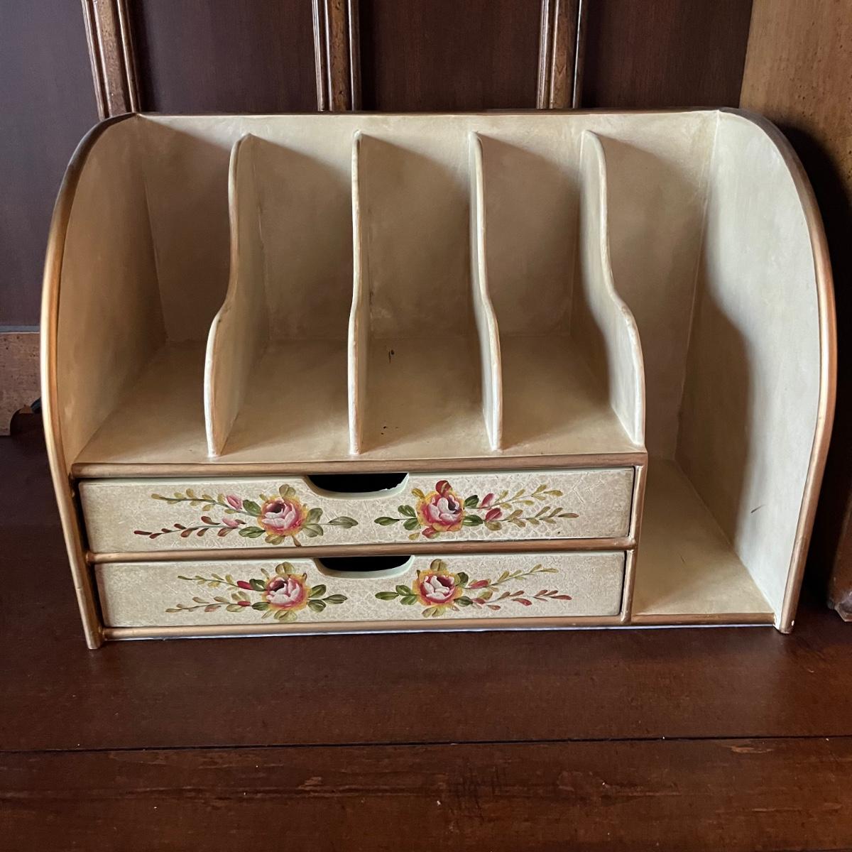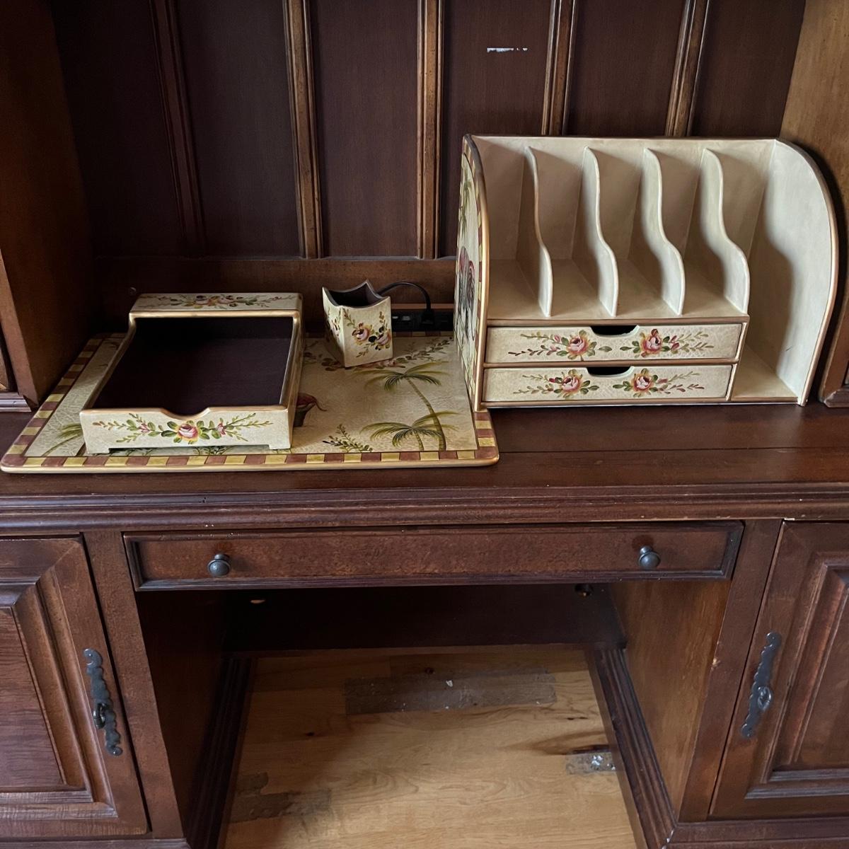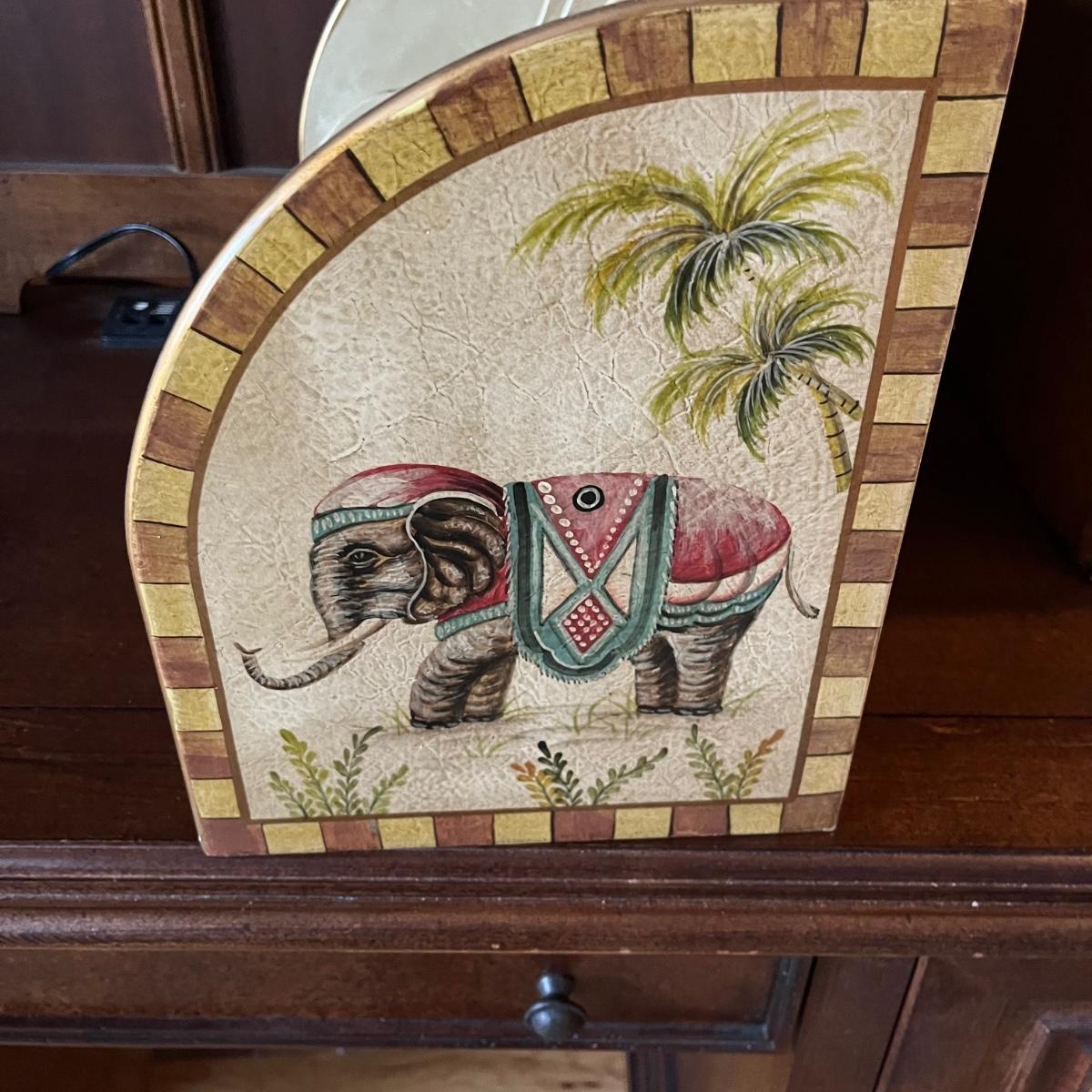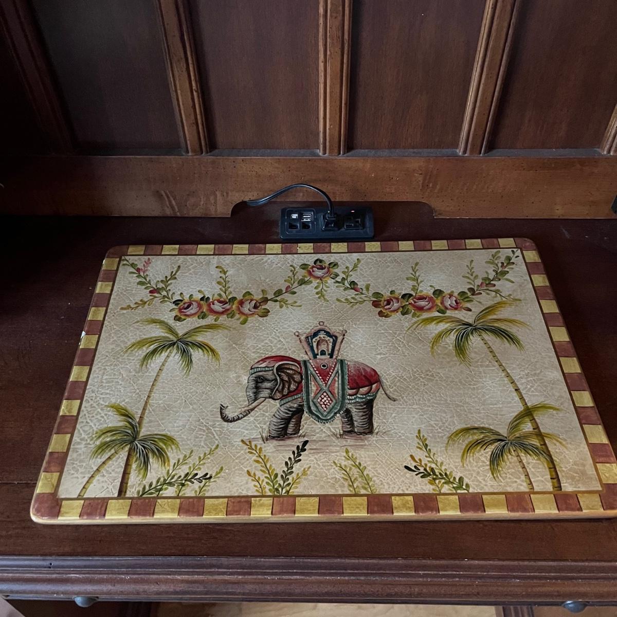 Lot contains an elephant design desk set that includes file holder with two drawers, paper holder, pen holder and a writing board. Pieces appear to be made of MDF. File holder measures 18.5” x 10” x 12.5”. Credenza not included.