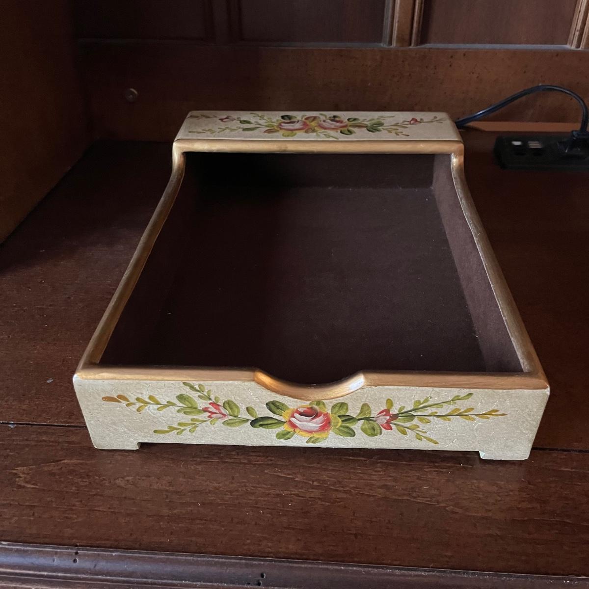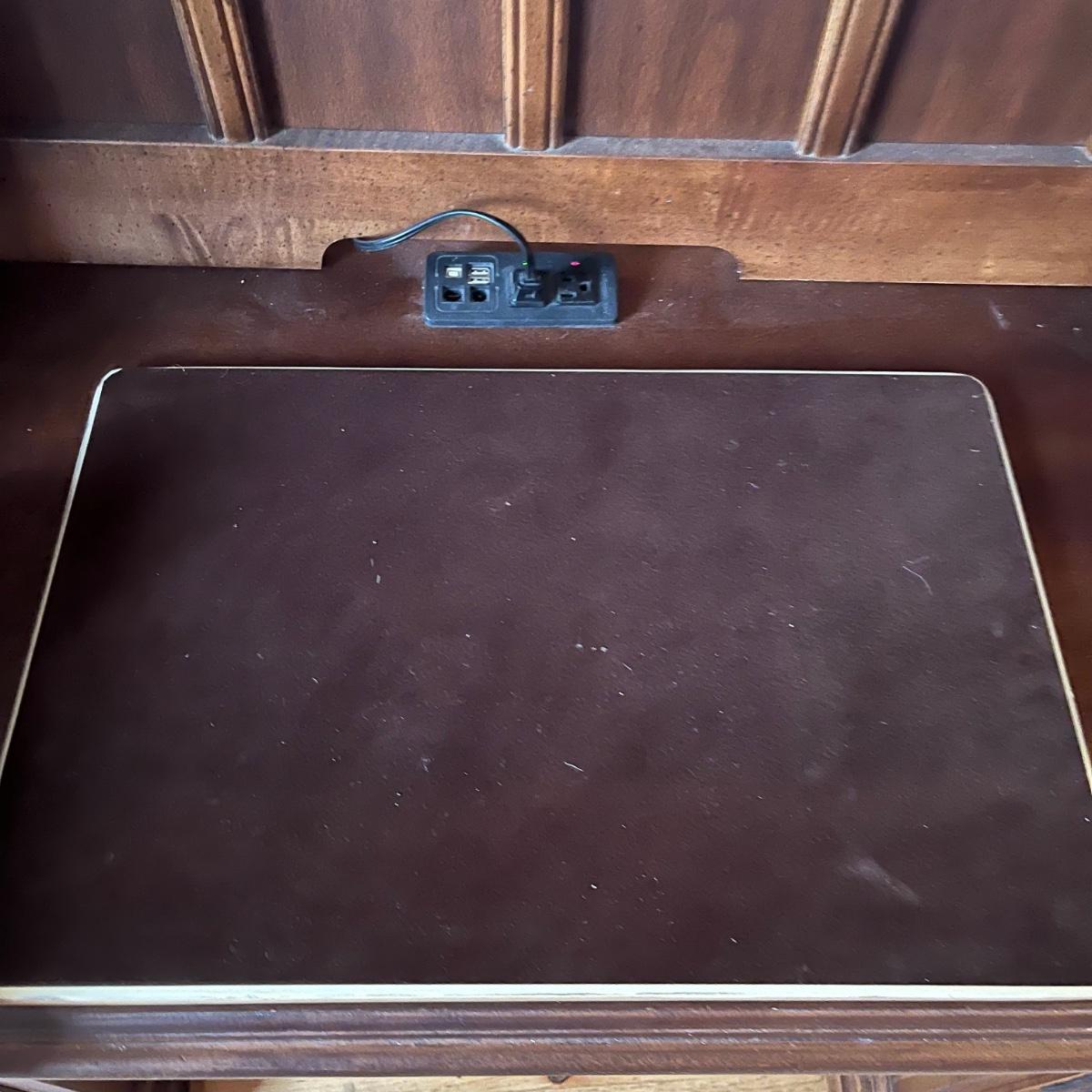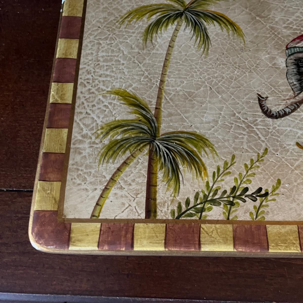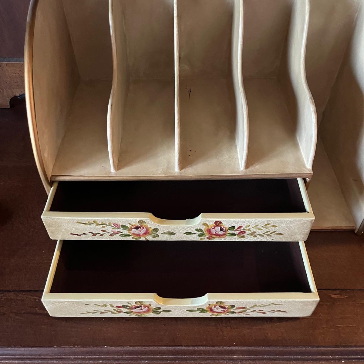 Lot contains an elephant design desk set that includes file holder with two drawers, paper holder, pen holder and a writing board. Pieces appear to be made of MDF. File holder measures 18.5” x 10” x 12.5”. Credenza not included.