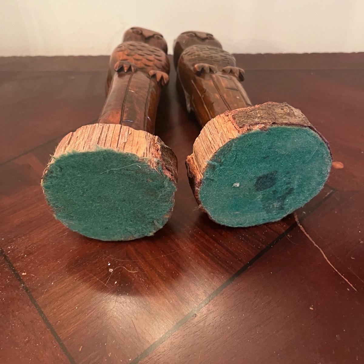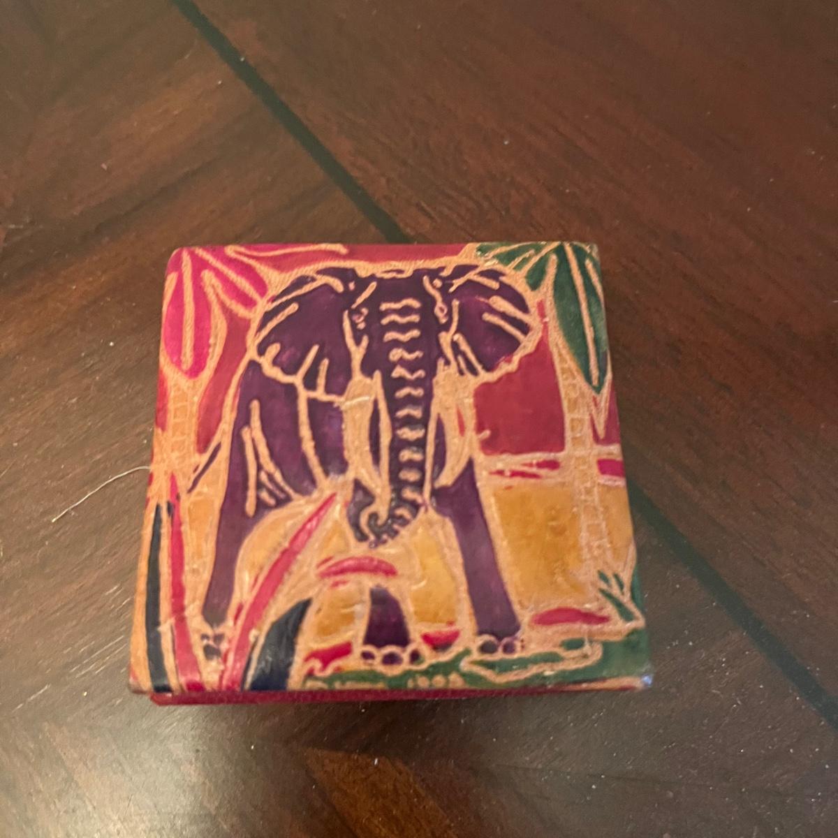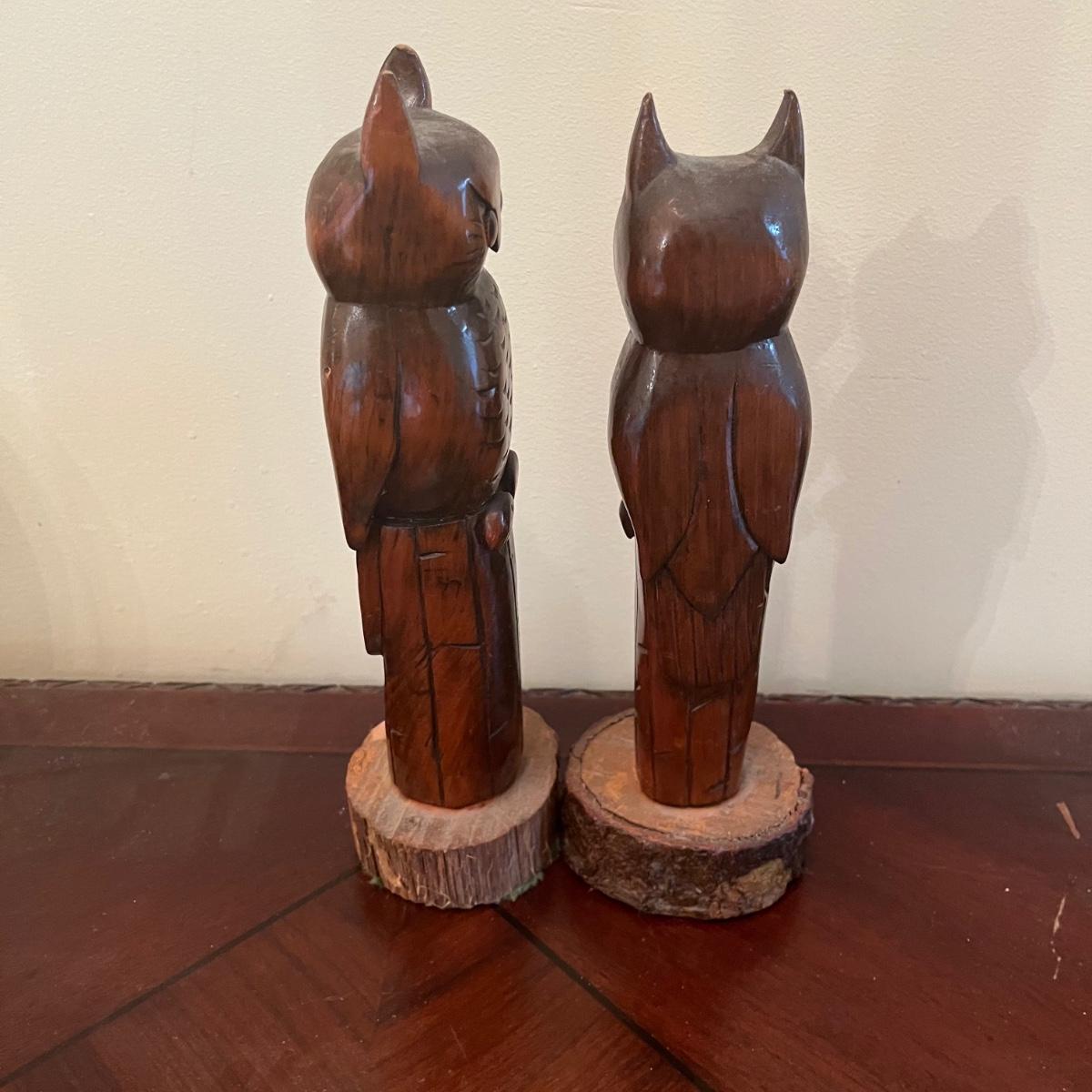 Lot includes two carved wooden owls, ceramic elephant, carved wooden elephant wall art and a leather elephant motif coin purse. Owls measure 3.5”D x 10” tall.