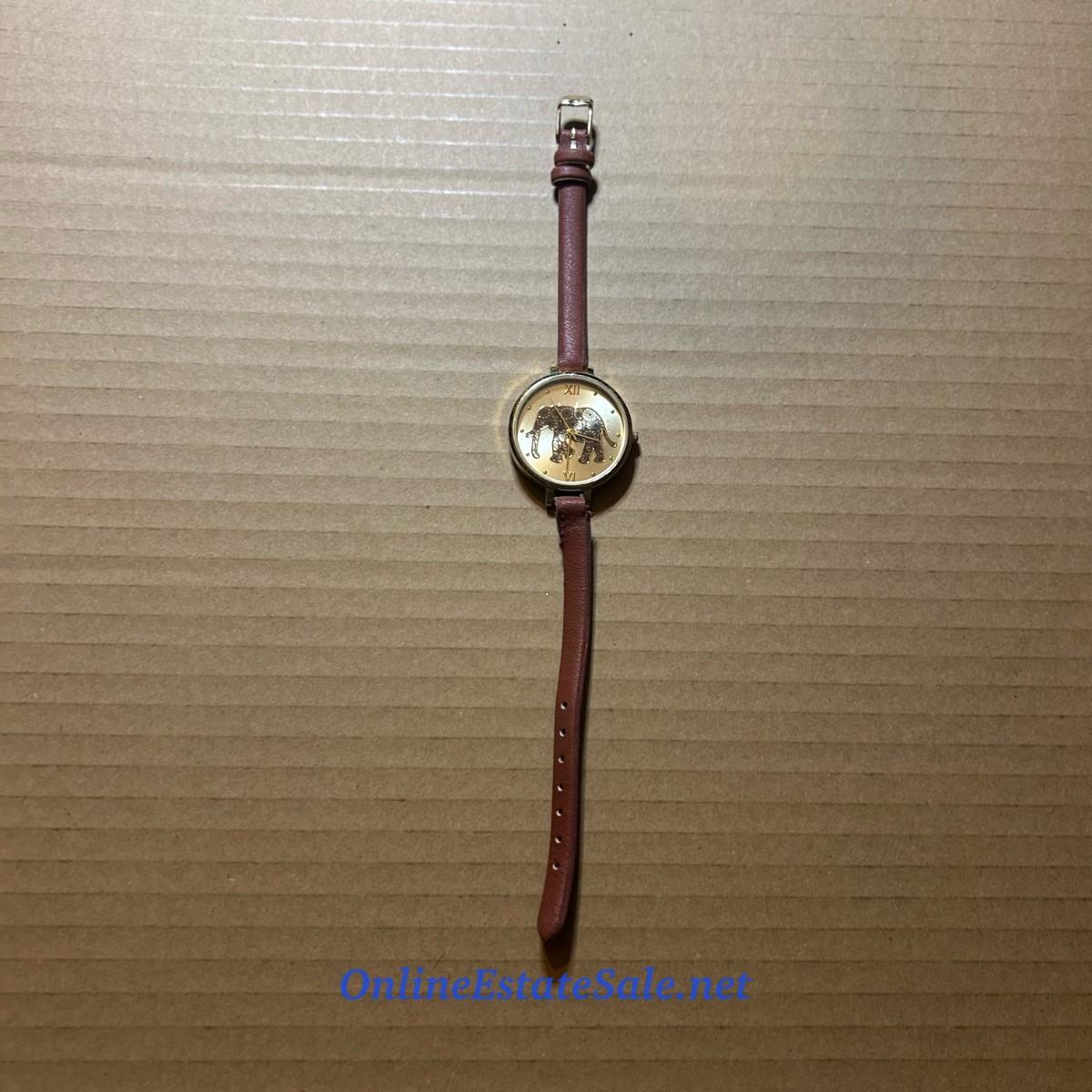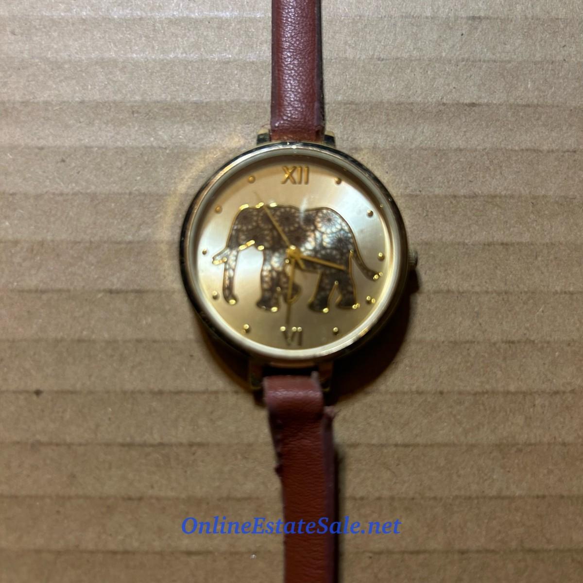 9in Brown Leather Band Watch with Gold Colored Elephant Detailed Face
