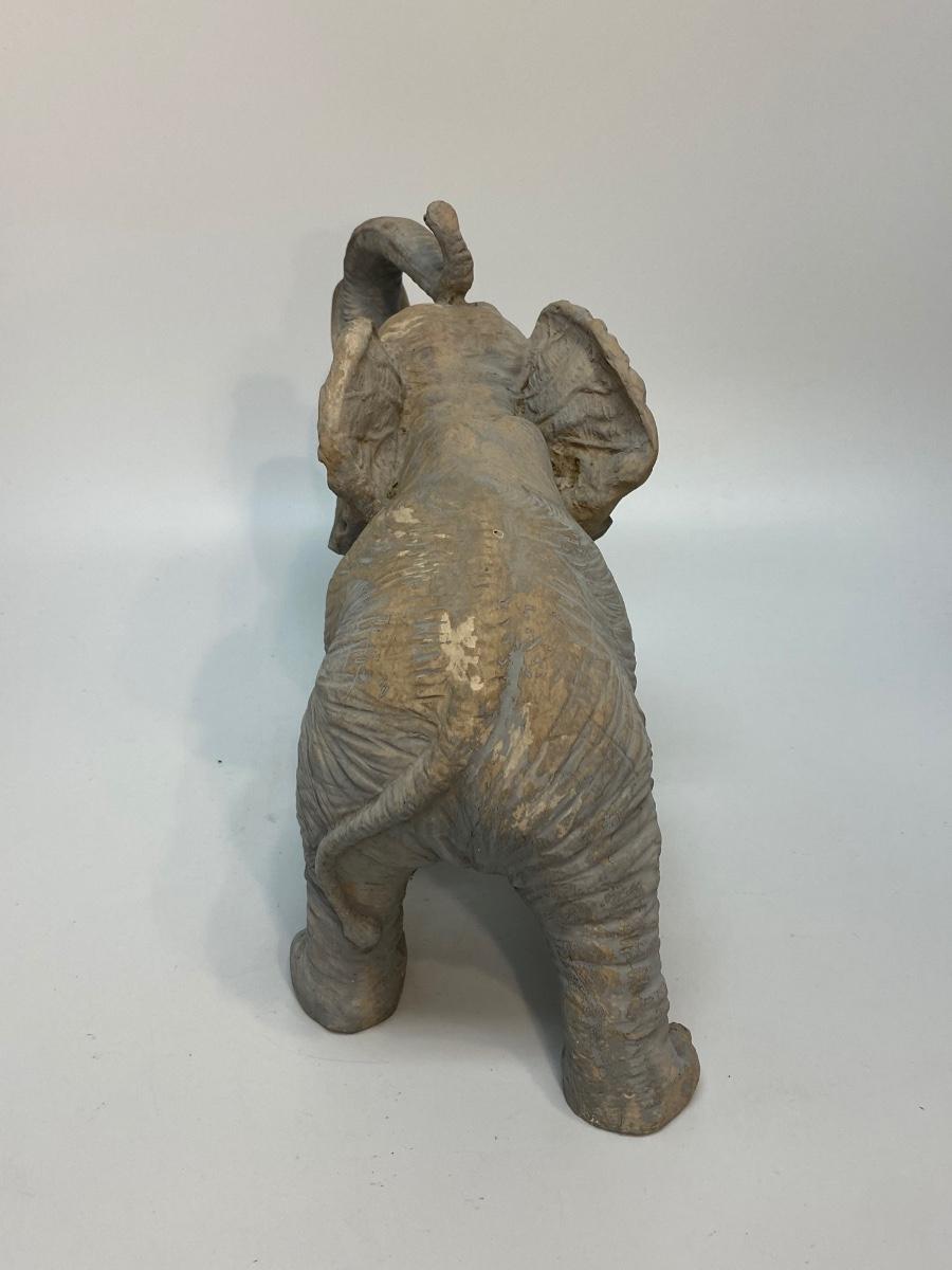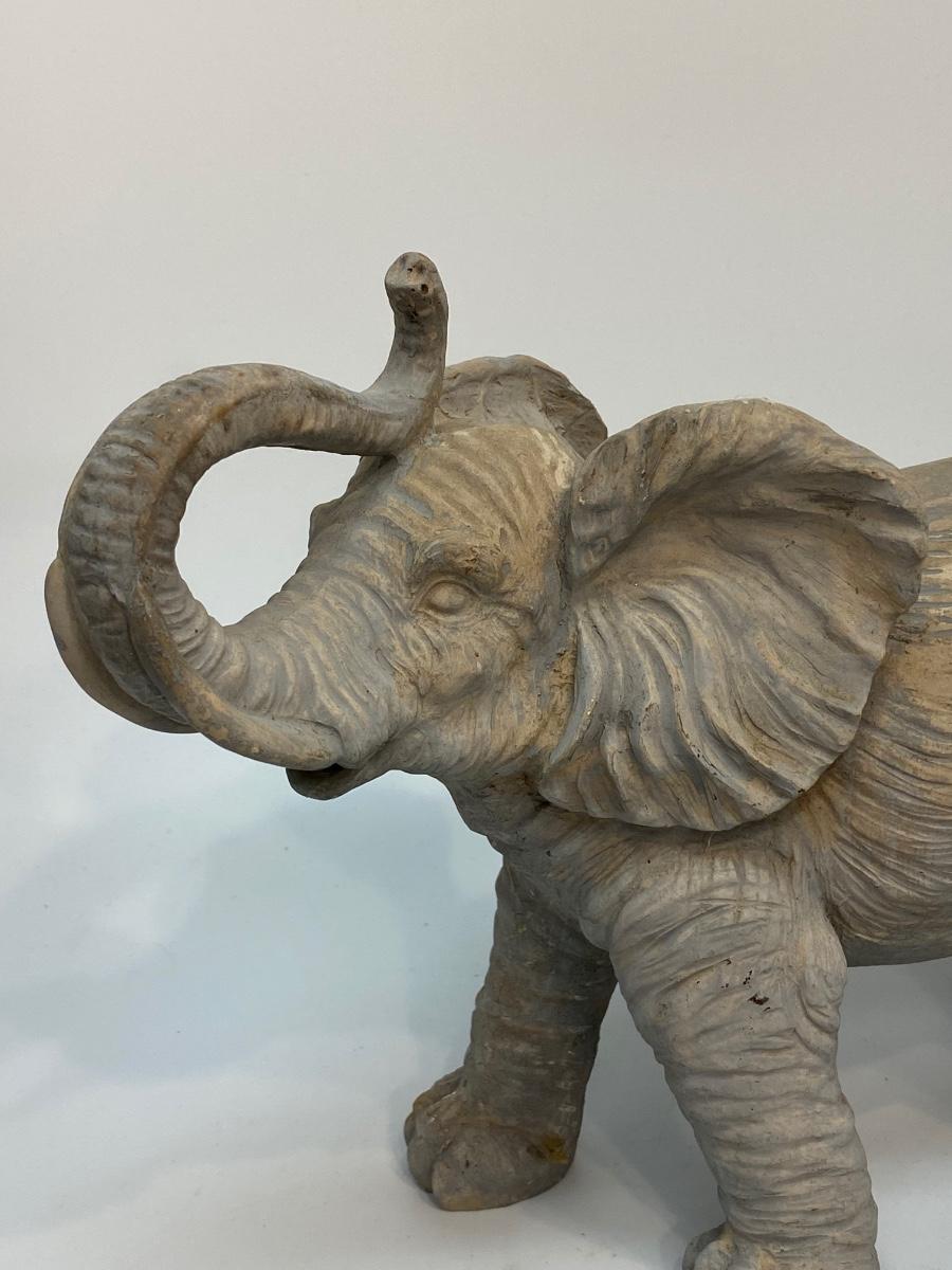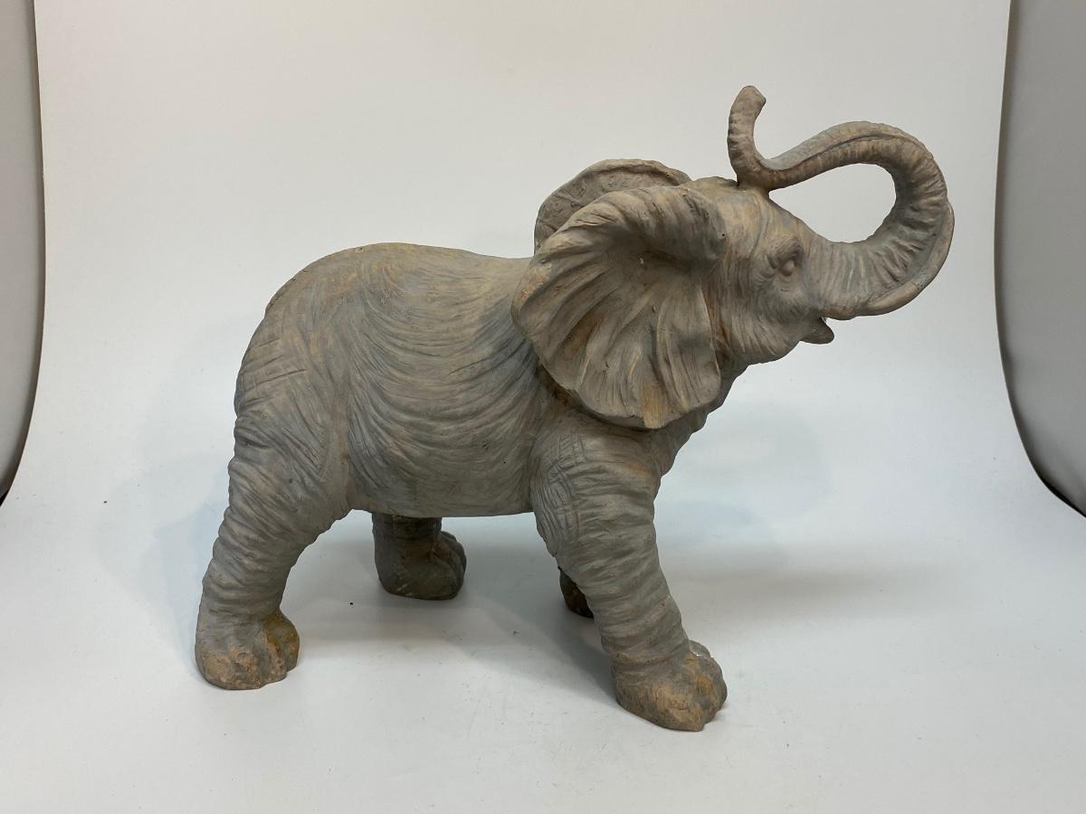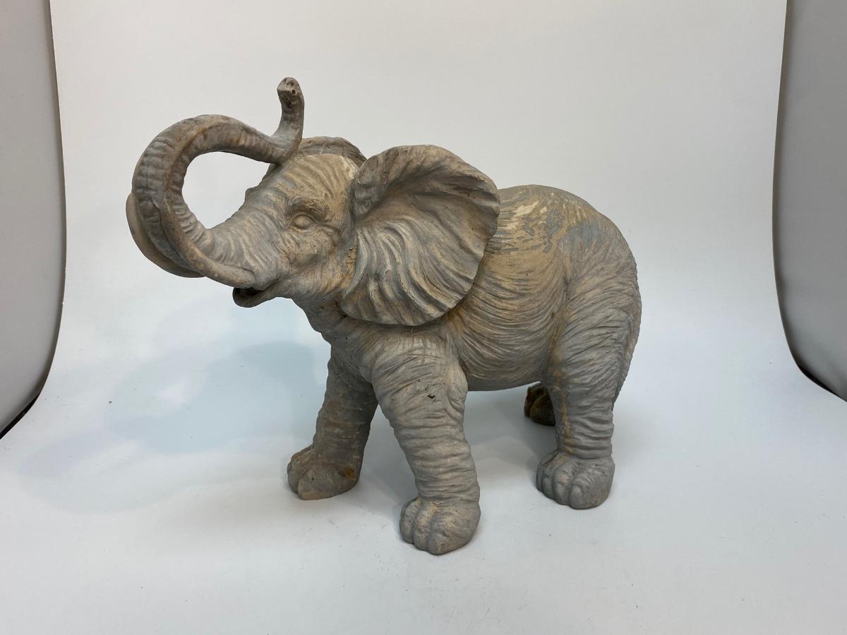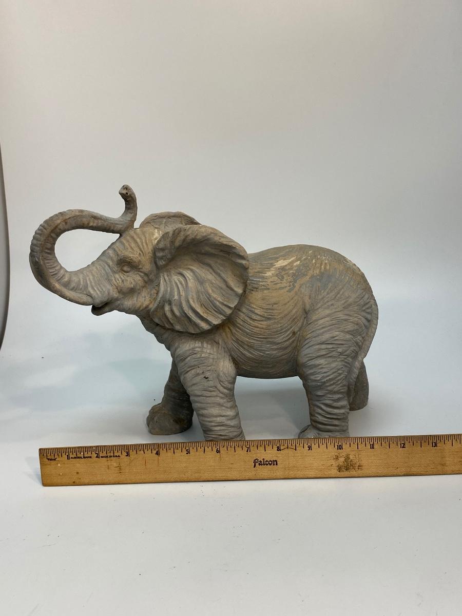 Grey elephant with trunk up garden statue. Made from a resin or composite material. Good condition. About 12" size.