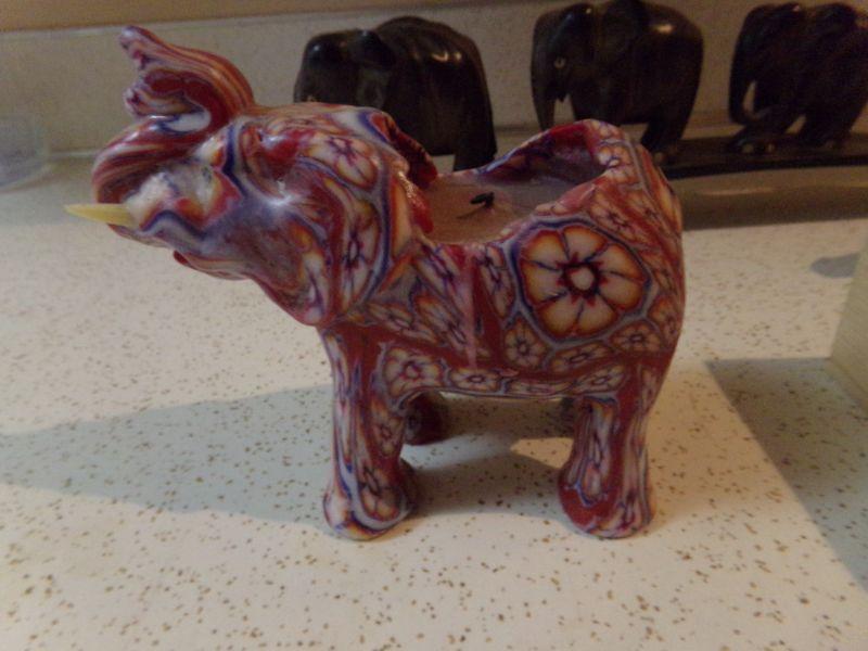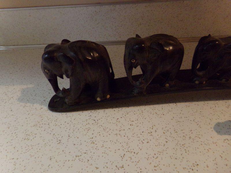 LINE OF WOODEN ELEPHANTS, CANDLE, BOX, ETC