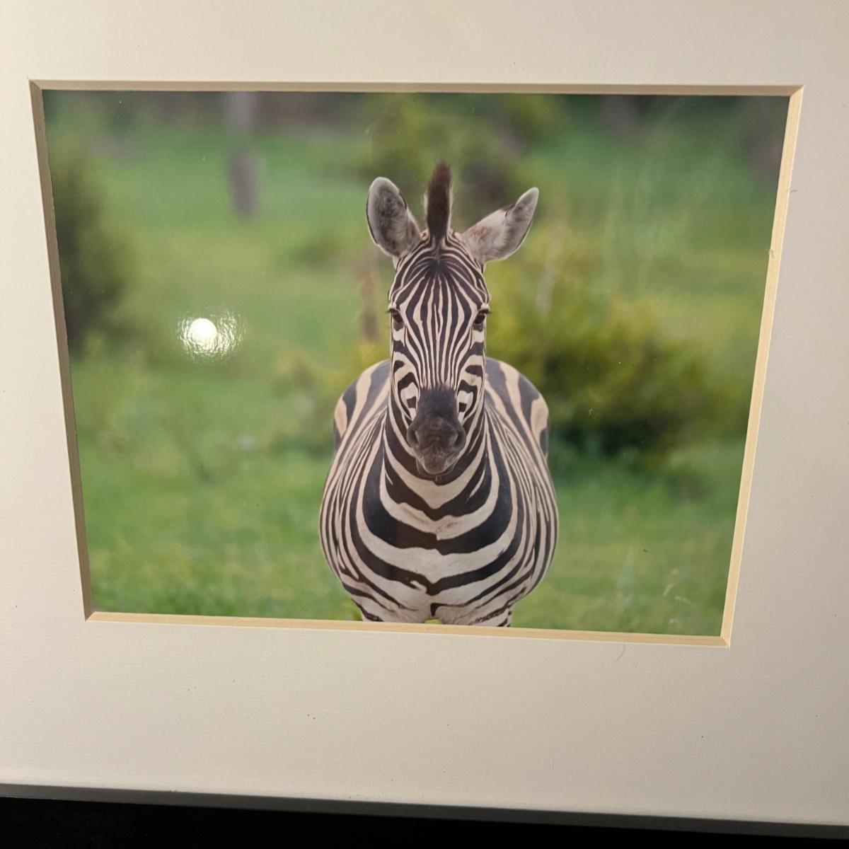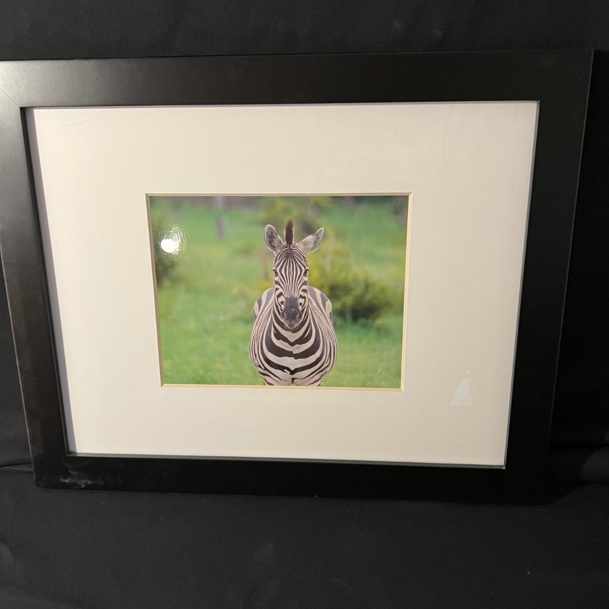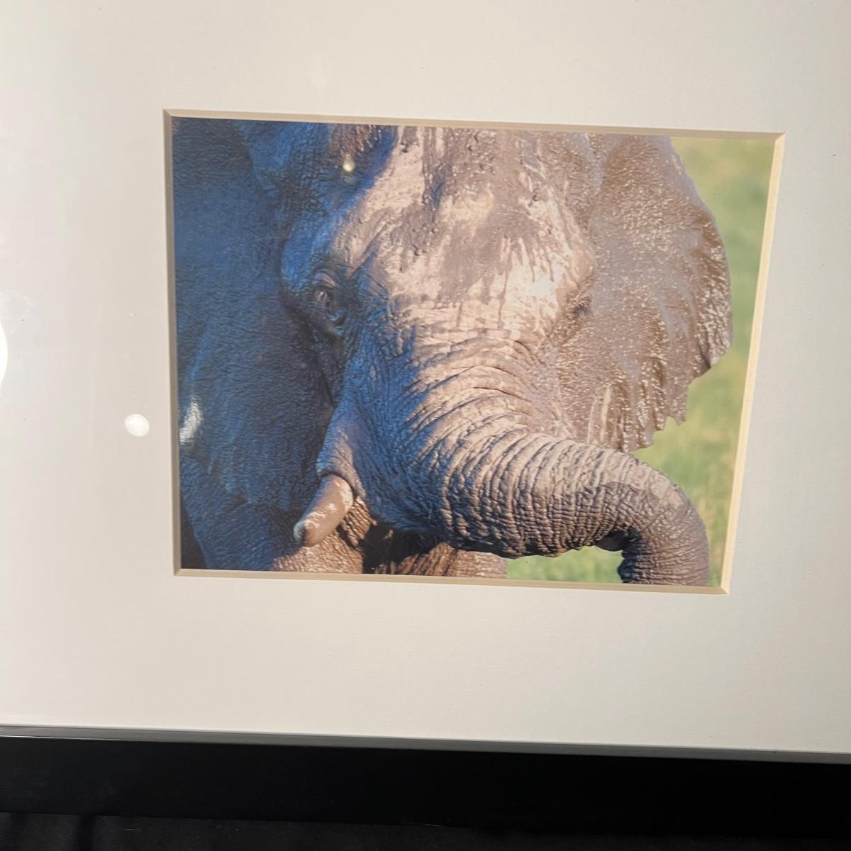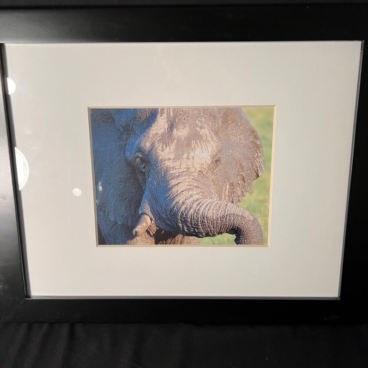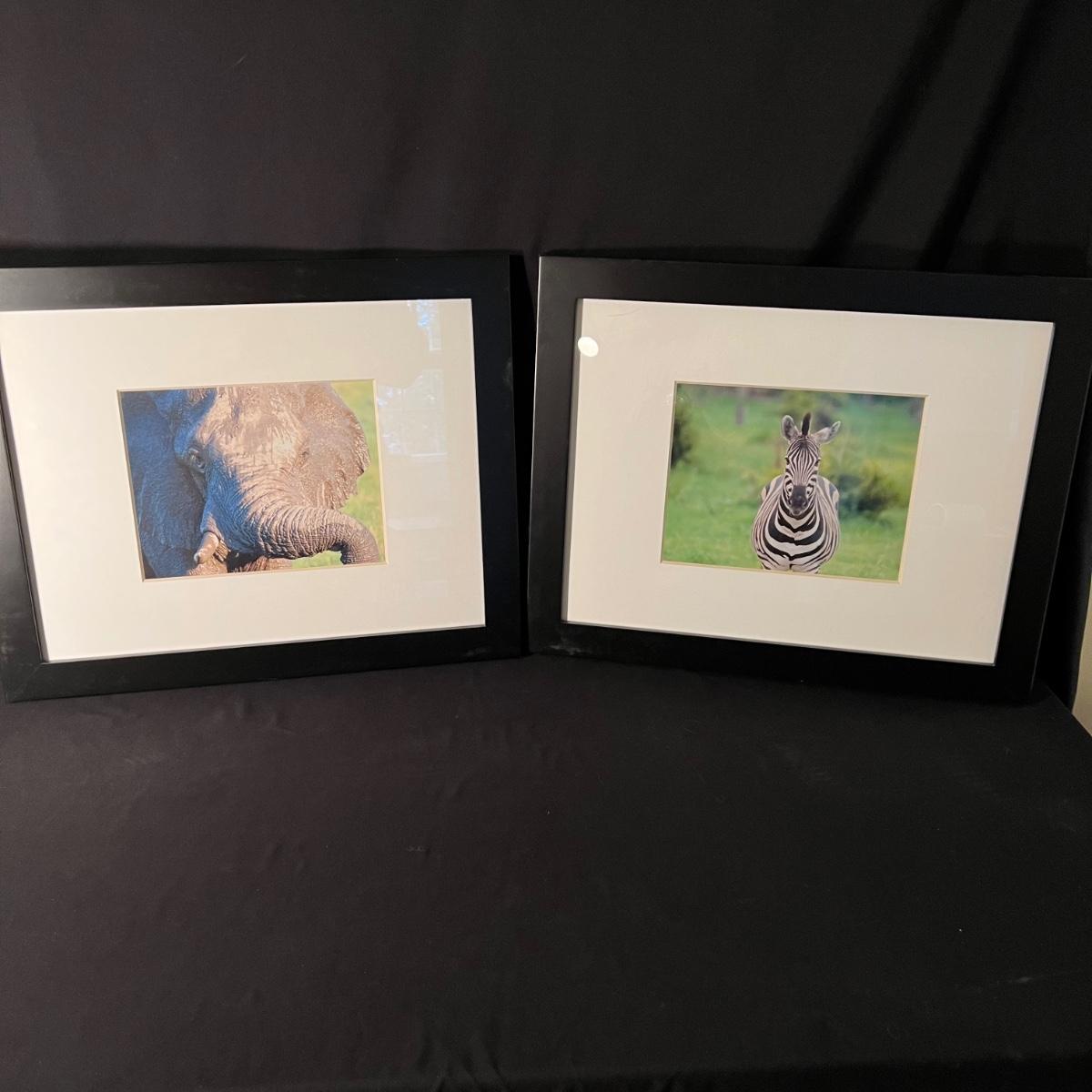 A photo of a zebra in the whole and an elephant (muddy!) in the wild. Both pictures are framed in a black wood like frame and measure 20.5”W x 17”H. Images are behind glass. Shipping available. Shipping art can be costly. We suggest calling our local UPS with dimensions and getting an estimate before bidding: (828) 252-6930.