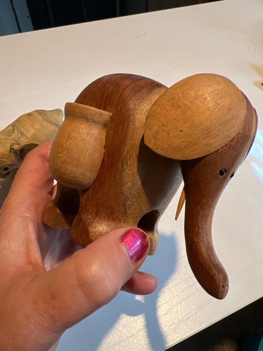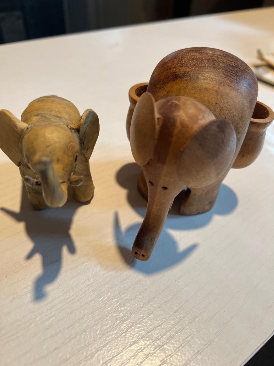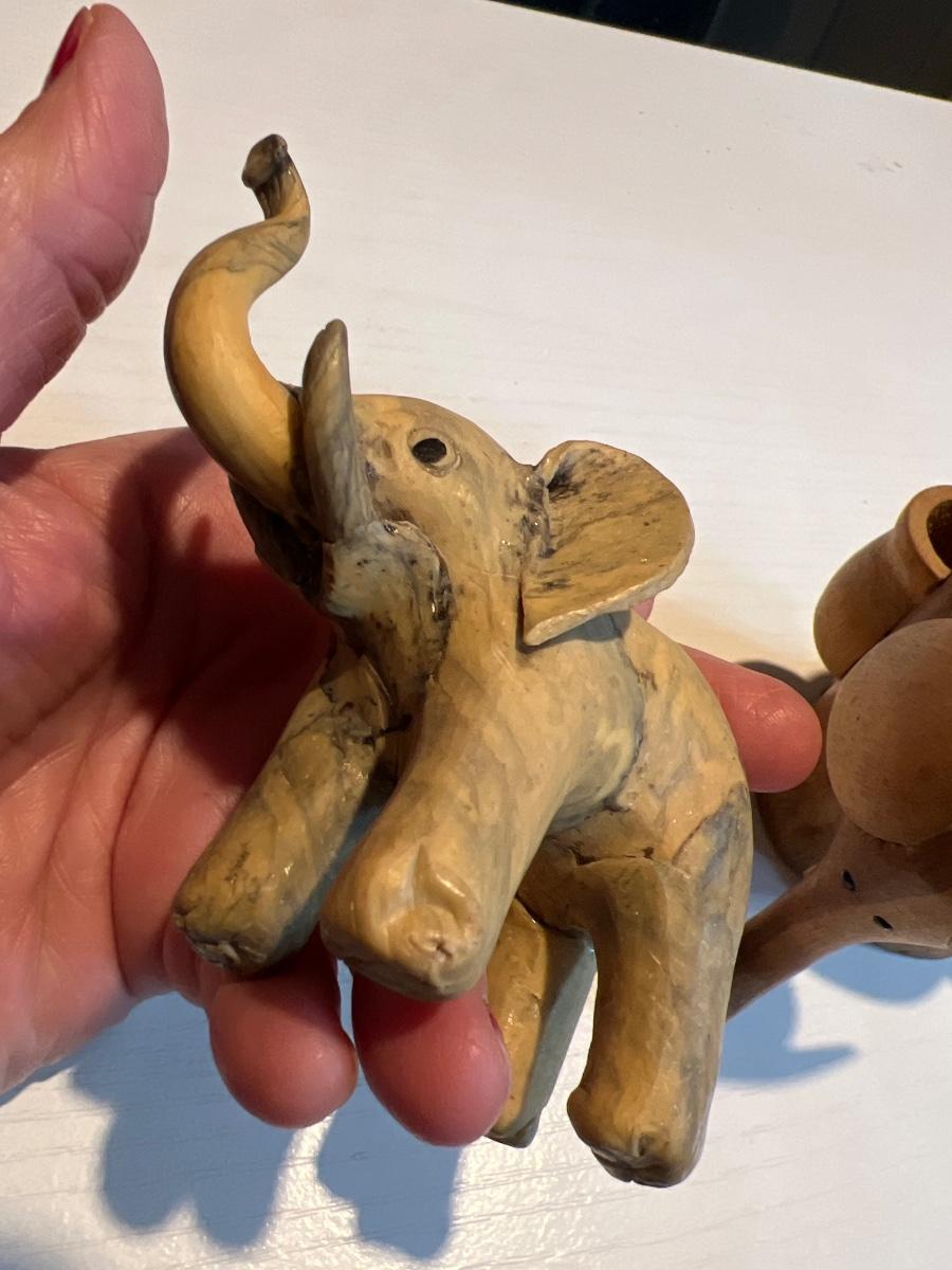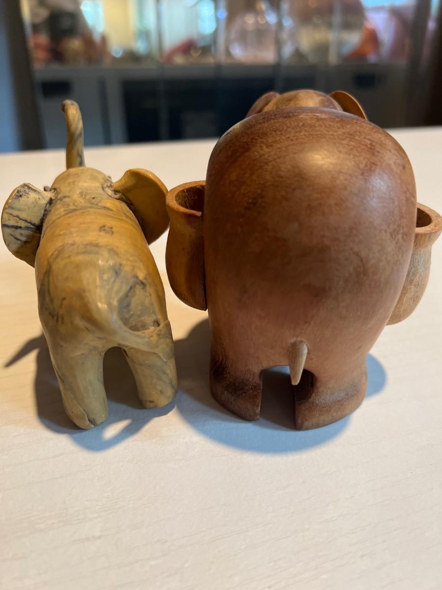 2 elephants 1 clay figurine the other vintage wooden toothpick holder