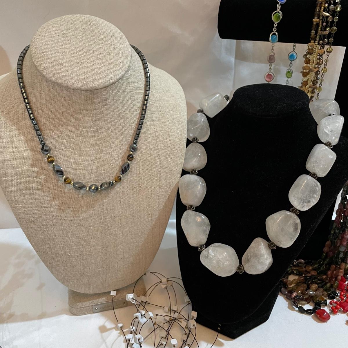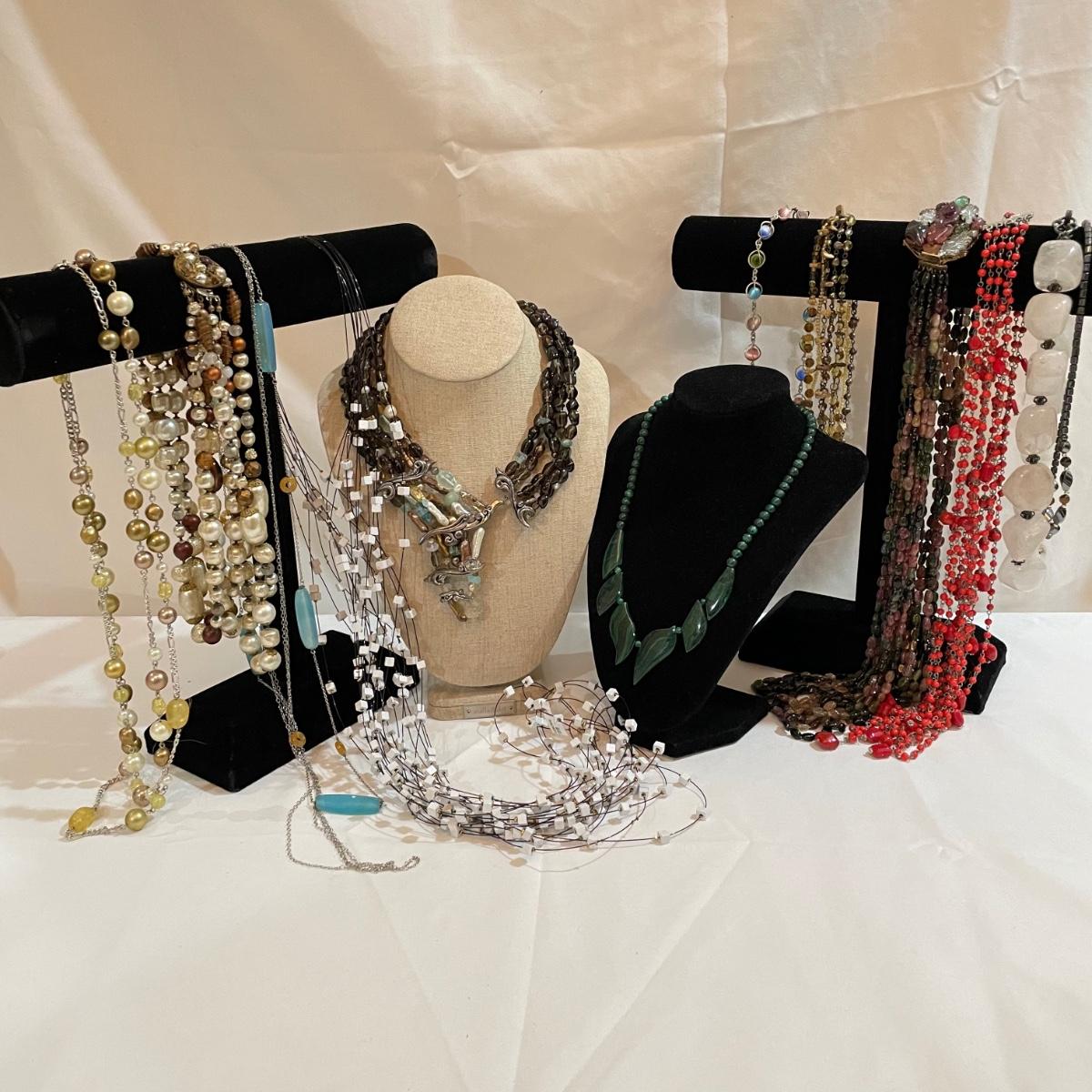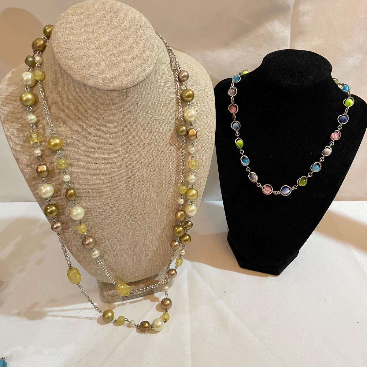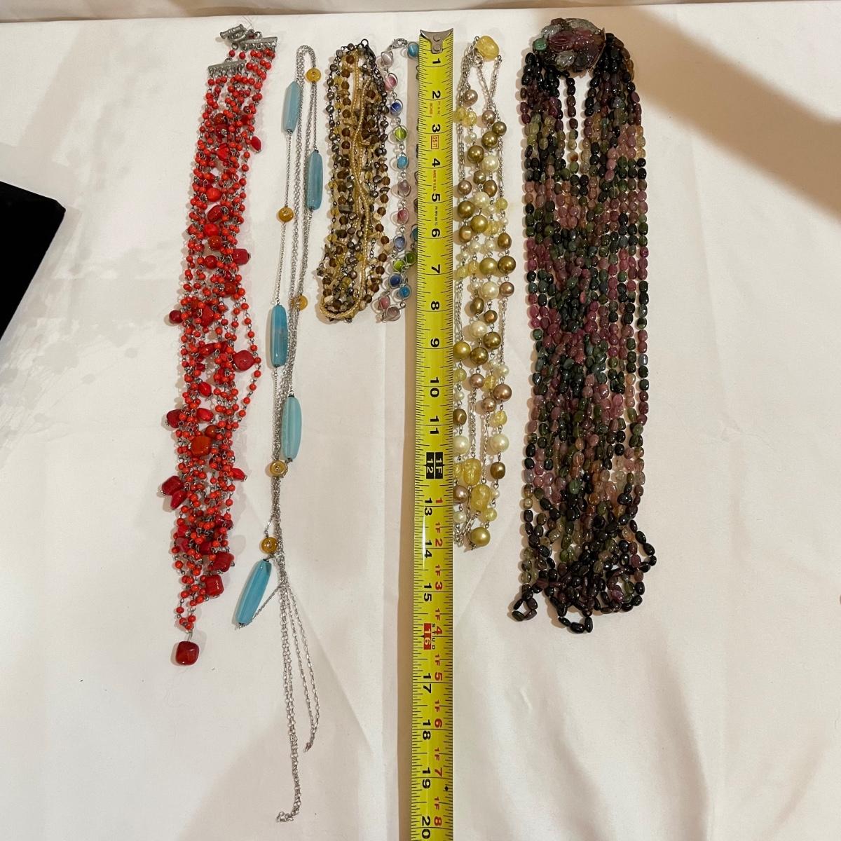 A nice variety of 11 beaded necklaces ranging from dark and elegant to bold and funky. There were no markings found and materials appear to be a mix of stones and resin beads. The emerald green colored necklace appears to be polymer, it closes with a hook, but it may have originally had a more traditional clasp. There are ten separate strands with golden beads and white resin beads, with price tag still attached, these strands range slightly in size from one another and would hang down onto the abdomen. Many necklaces are heavy in weight, see photos. Shipping available. All sales are final. No returns or refunds. Please bid accordingly.