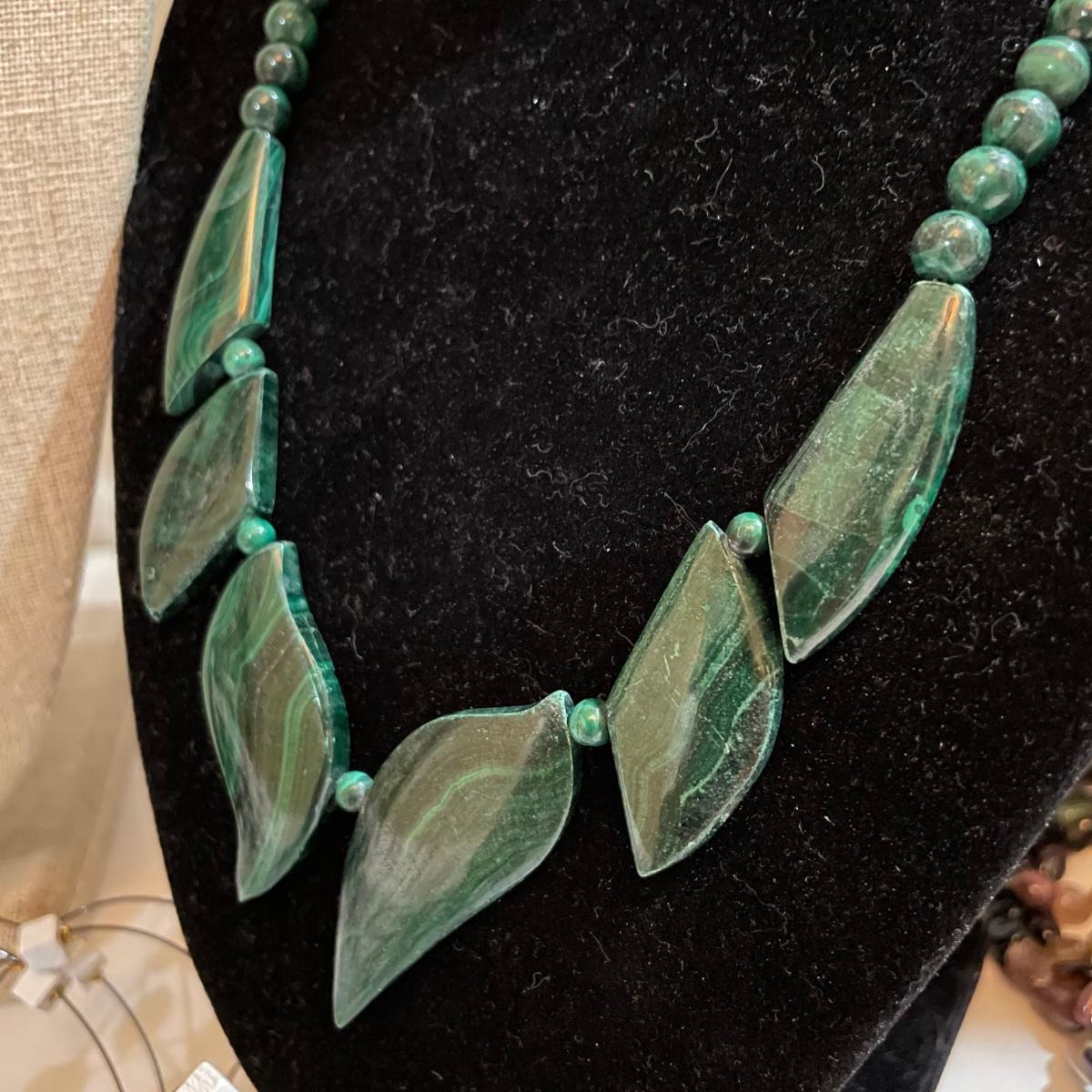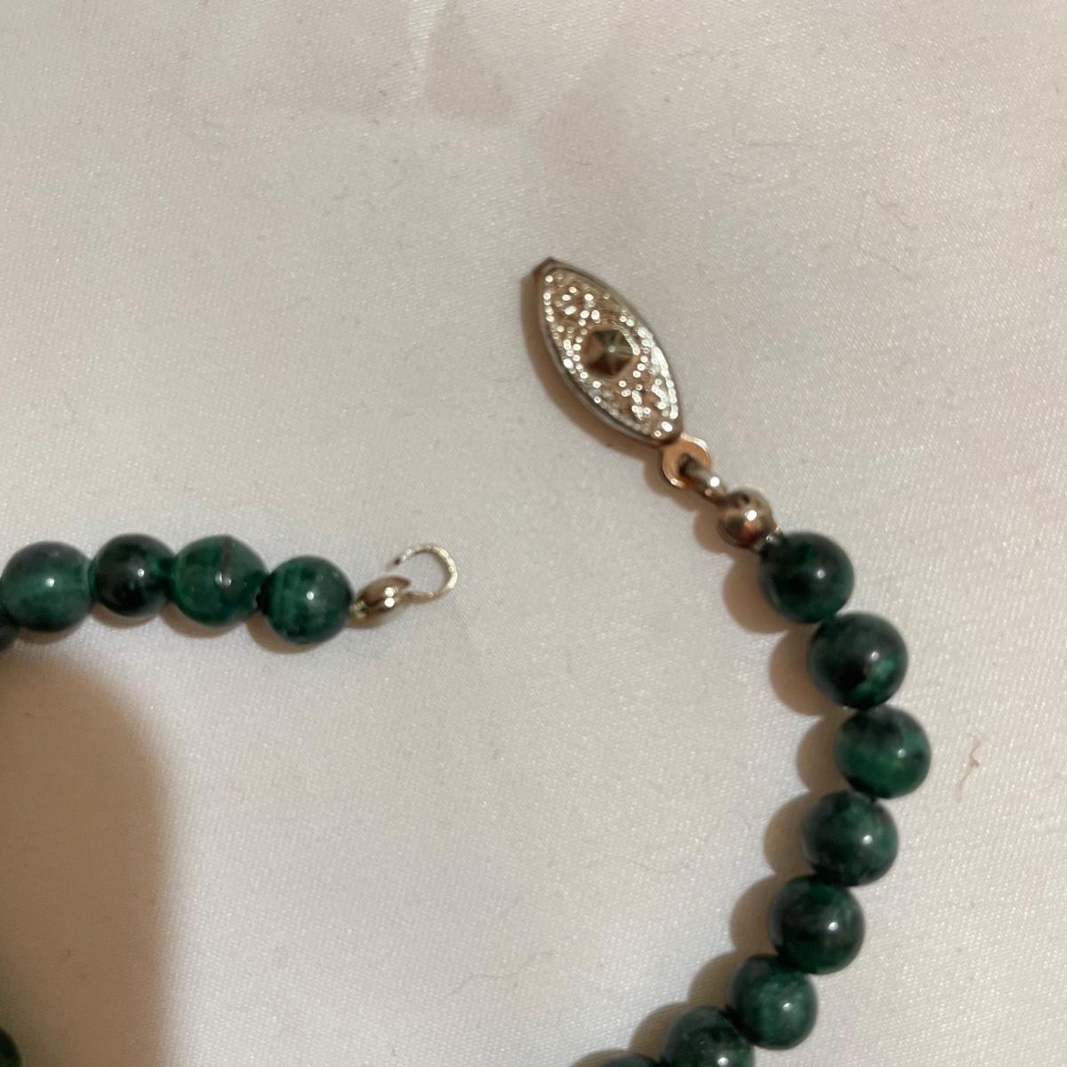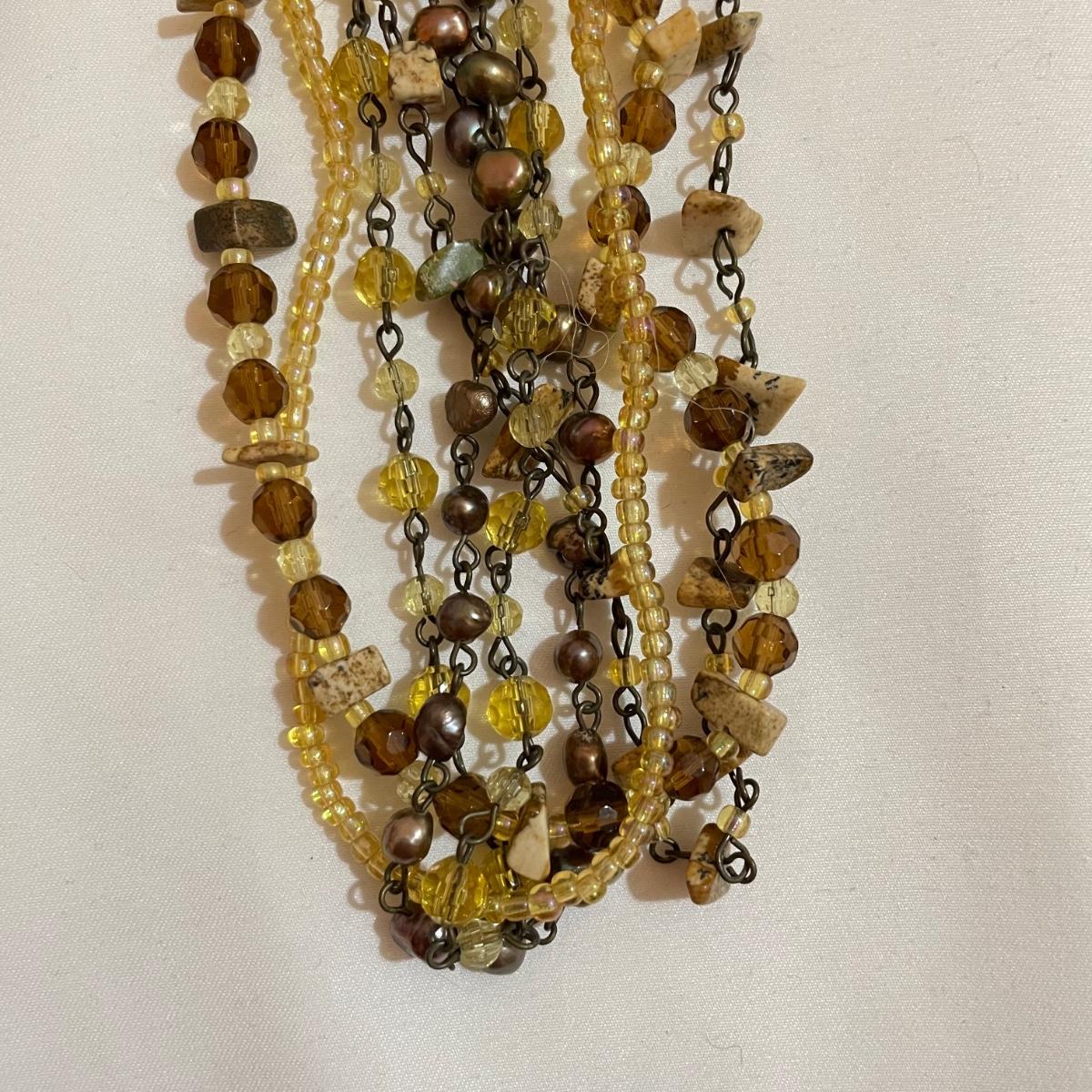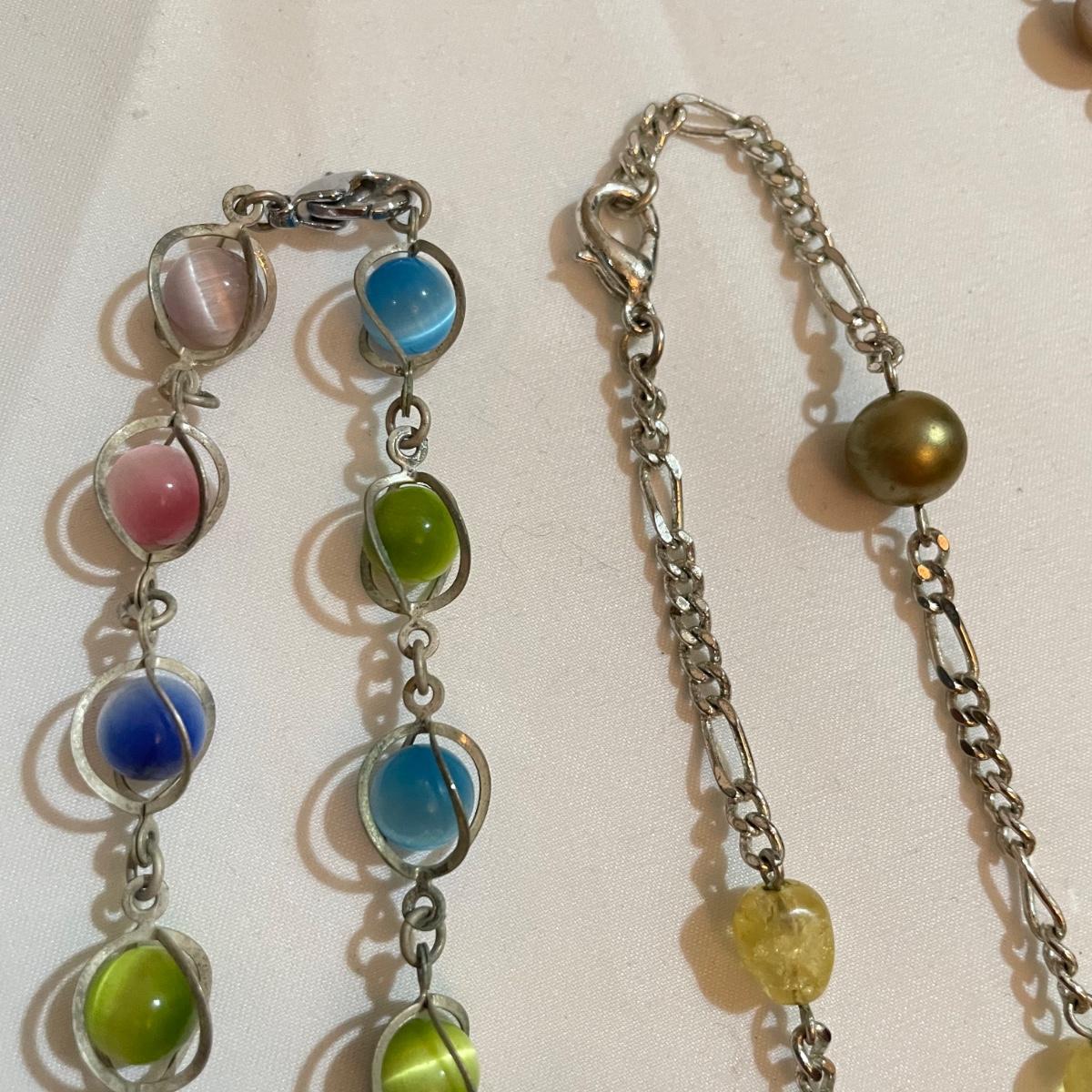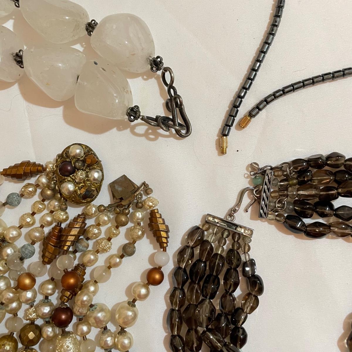 A nice variety of 11 beaded necklaces ranging from dark and elegant to bold and funky. There were no markings found and materials appear to be a mix of stones and resin beads. The emerald green colored necklace appears to be polymer, it closes with a hook, but it may have originally had a more traditional clasp. There are ten separate strands with golden beads and white resin beads, with price tag still attached, these strands range slightly in size from one another and would hang down onto the abdomen. Many necklaces are heavy in weight, see photos. Shipping available. All sales are final. No returns or refunds. Please bid accordingly.