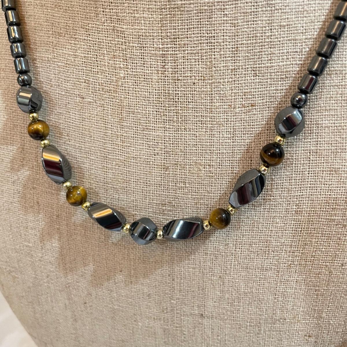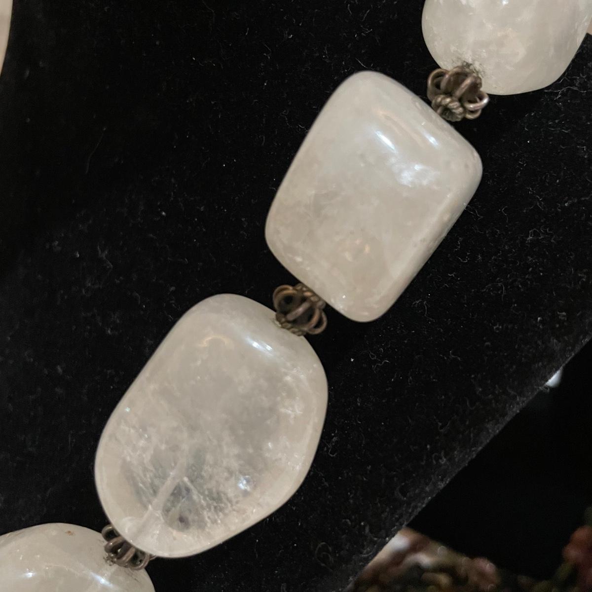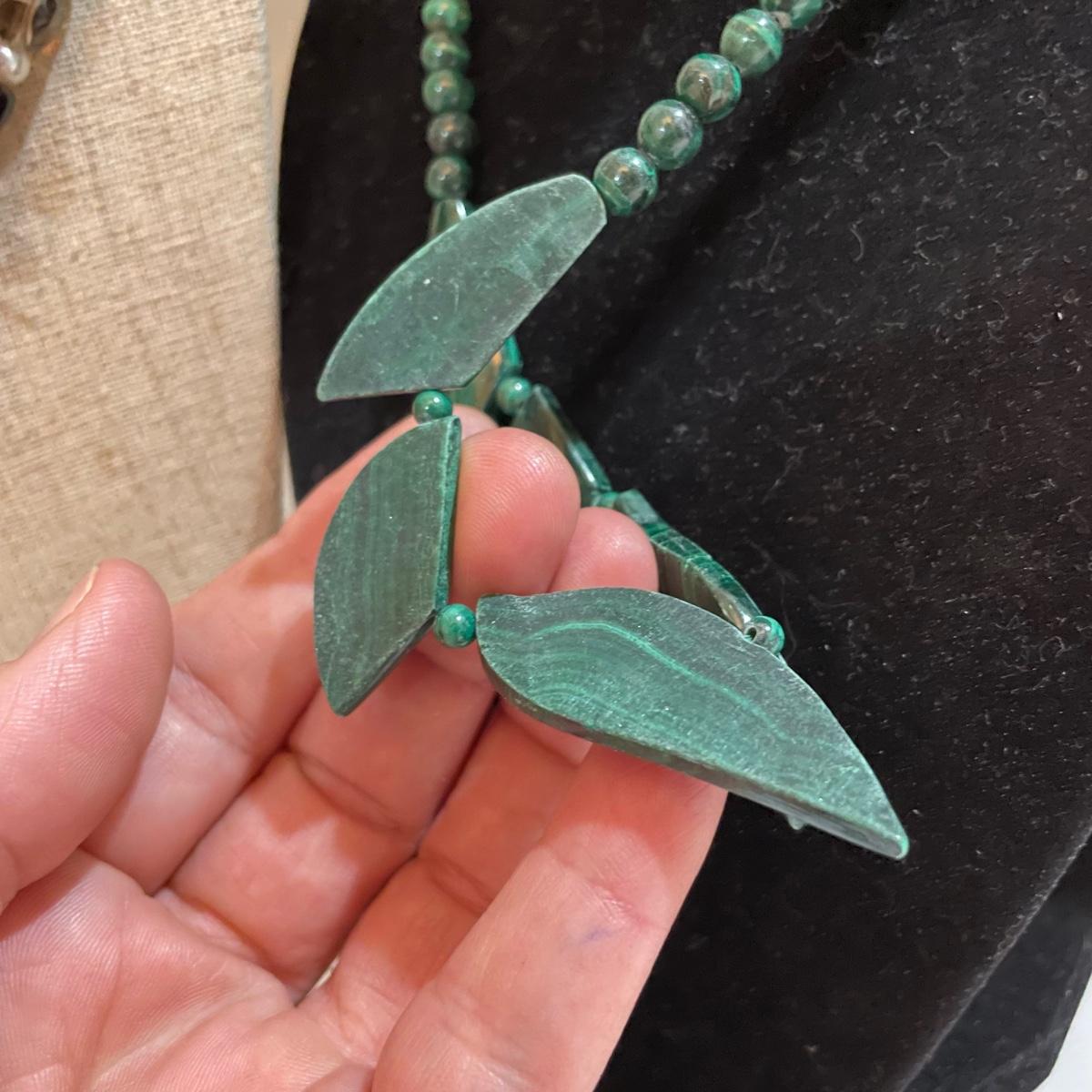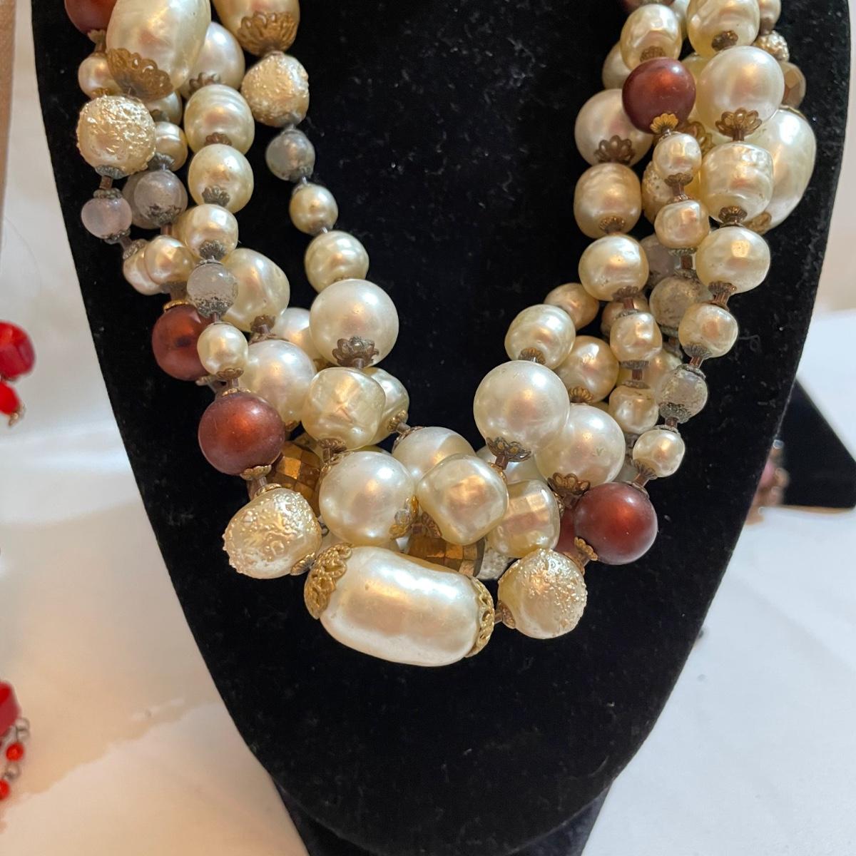 A nice variety of 11 beaded necklaces ranging from dark and elegant to bold and funky. There were no markings found and materials appear to be a mix of stones and resin beads. The emerald green colored necklace appears to be polymer, it closes with a hook, but it may have originally had a more traditional clasp. There are ten separate strands with golden beads and white resin beads, with price tag still attached, these strands range slightly in size from one another and would hang down onto the abdomen. Many necklaces are heavy in weight, see photos. Shipping available. All sales are final. No returns or refunds. Please bid accordingly.