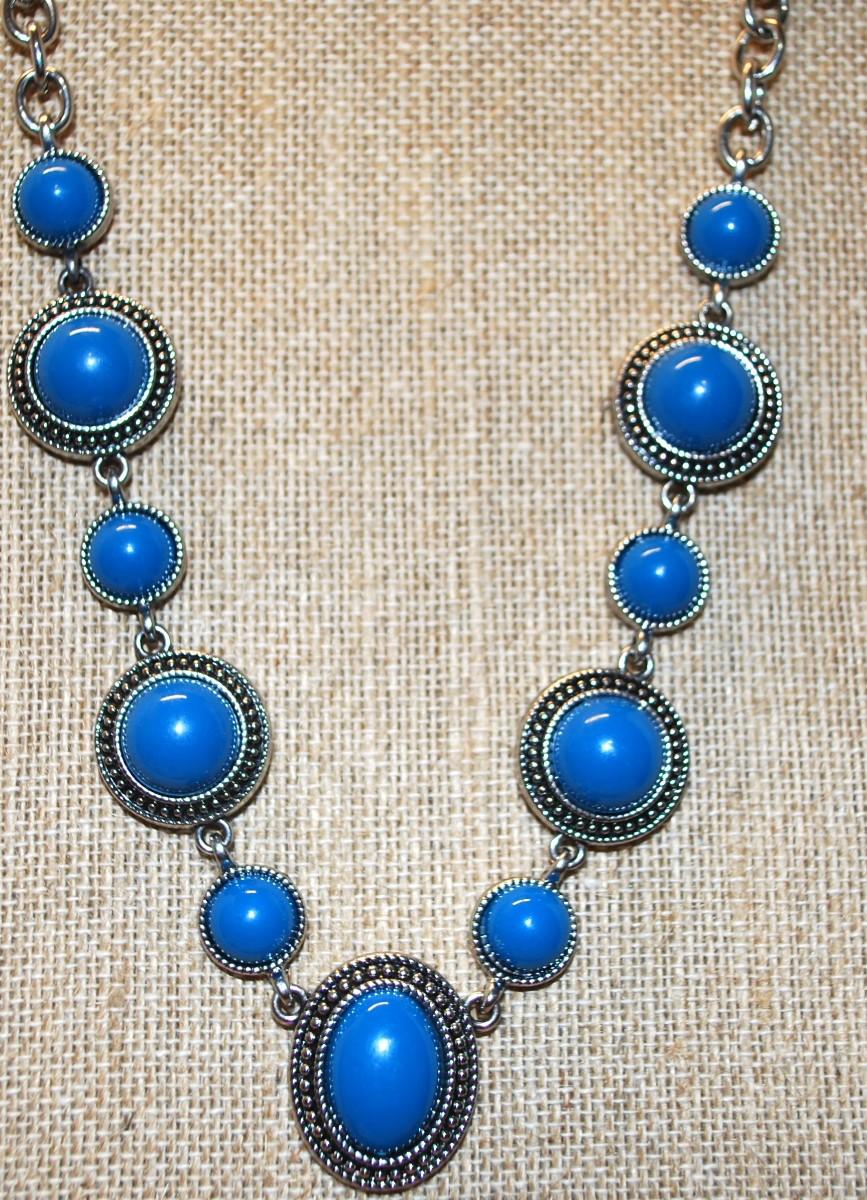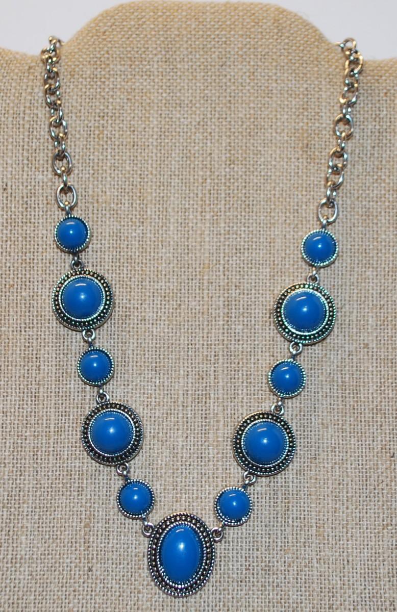 Eleven Ocean Blue Disc Stones Necklace on Silver Tone Chain 17" L