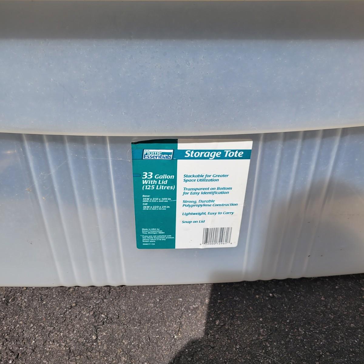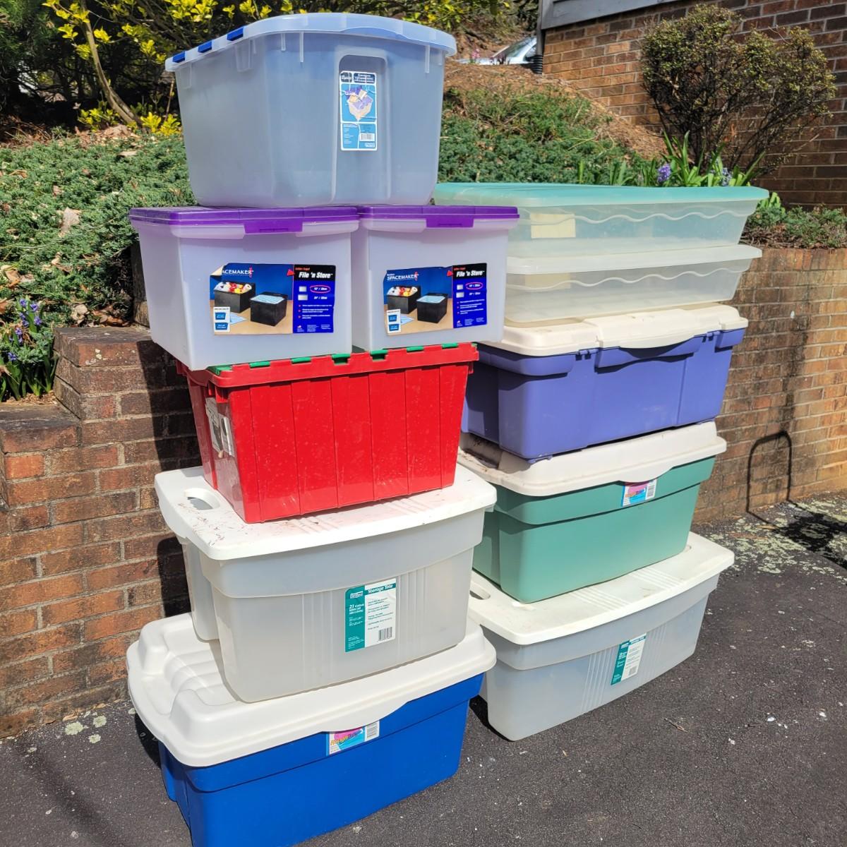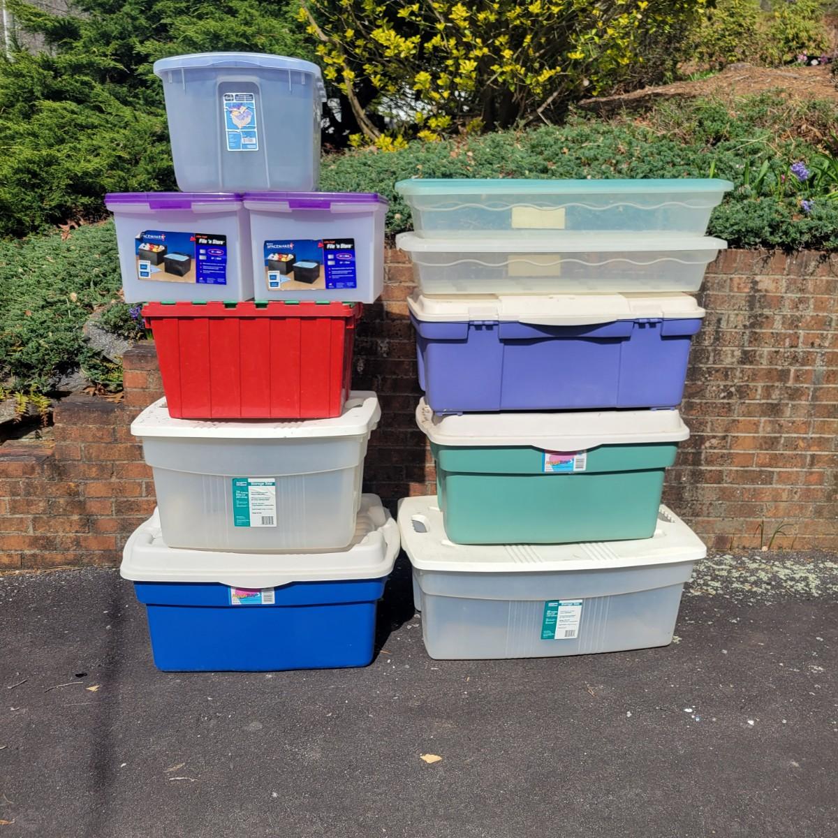 An assortment of storage totes, bins and other space saving containers. All bins have lids and the largest clear bin with the white lid is 33gal and measures approximately 35" x 26" x 14"H. Local pickup only