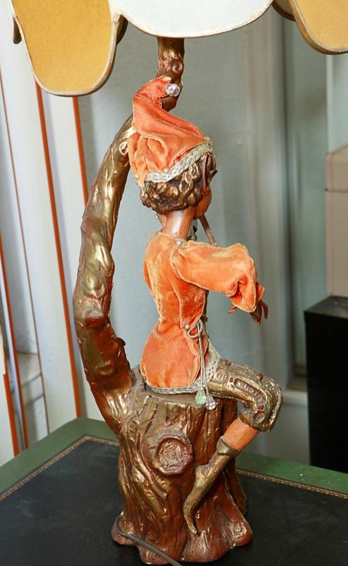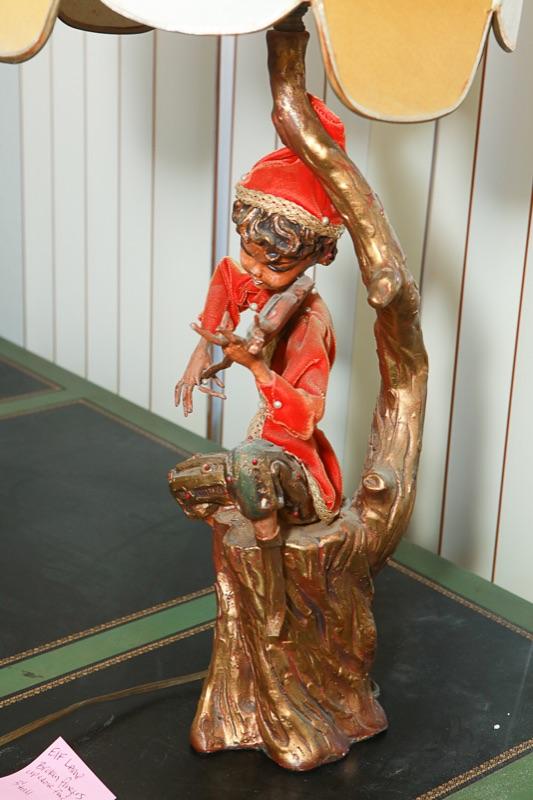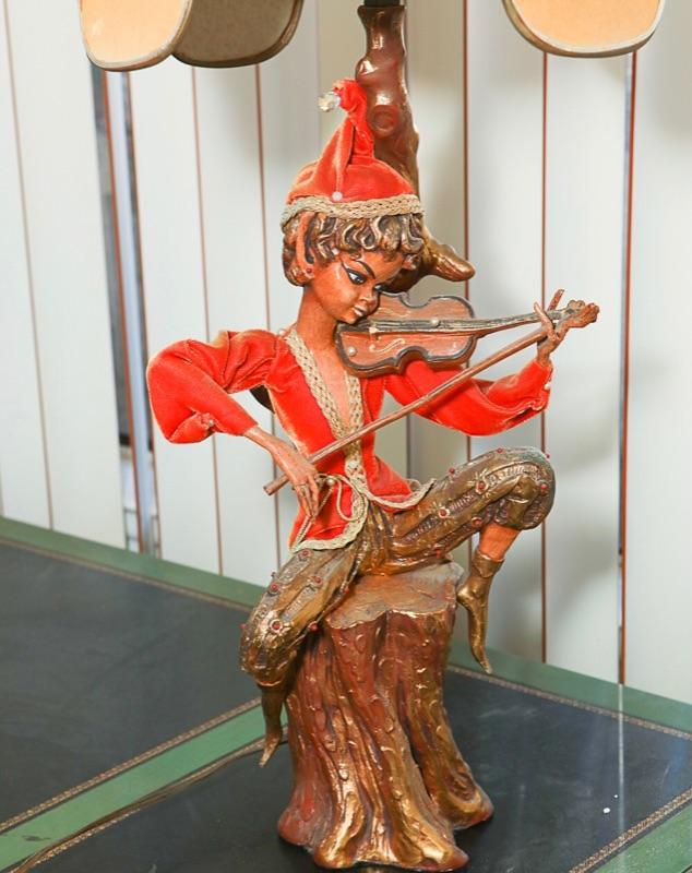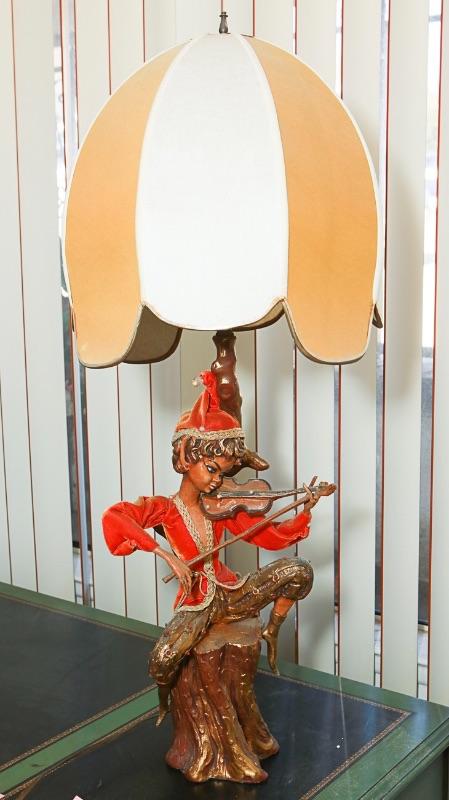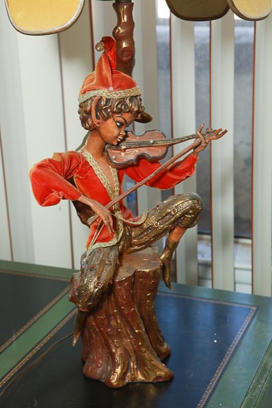 Unique mid century Pixie/elf sitting on tree stump playing the violin table lamp. Gold and red. Striped tulip shaped shade. Pixie has some damaged fingers but in otherwise good condition. Found similar lamps, not one with a shade like this.