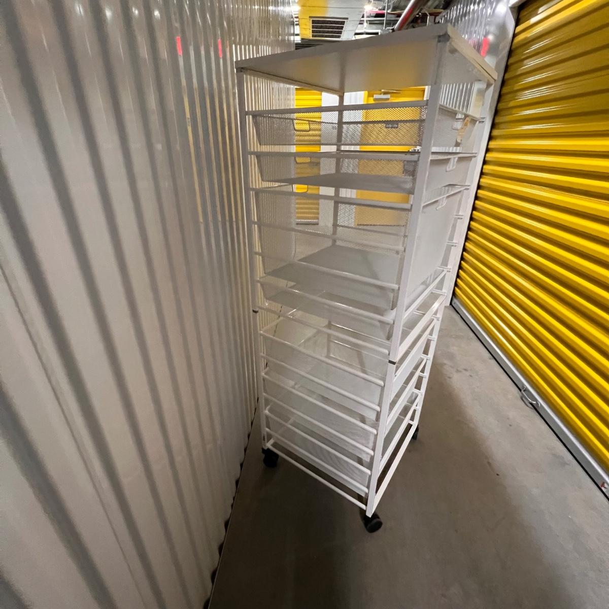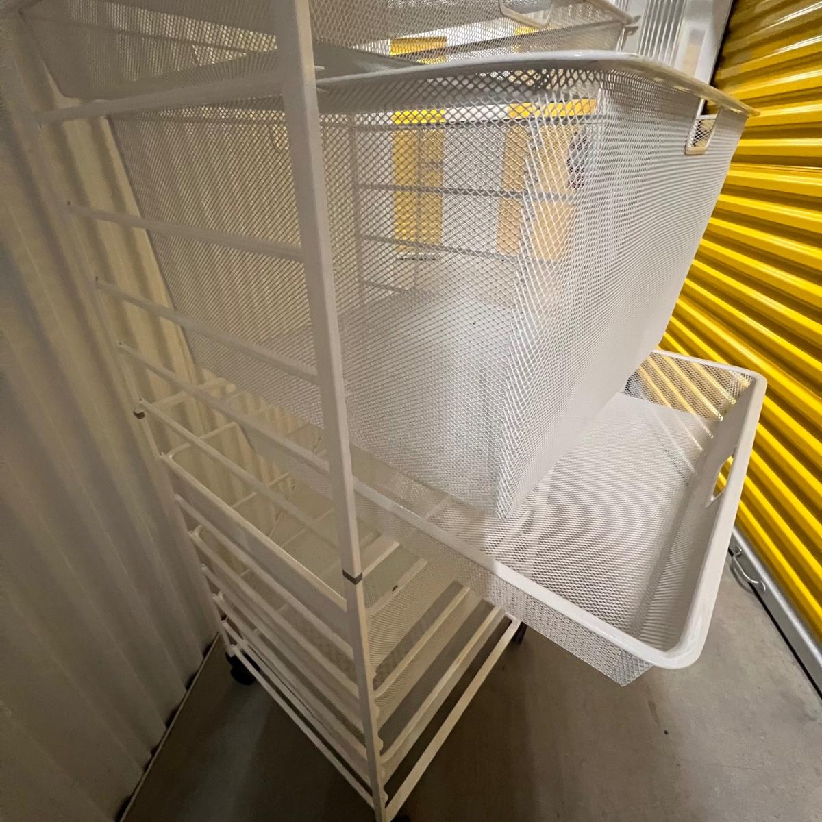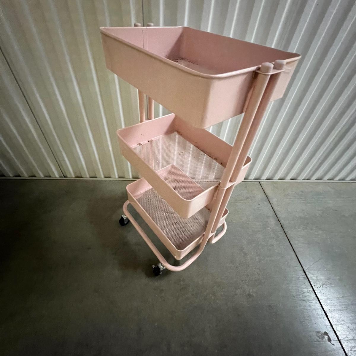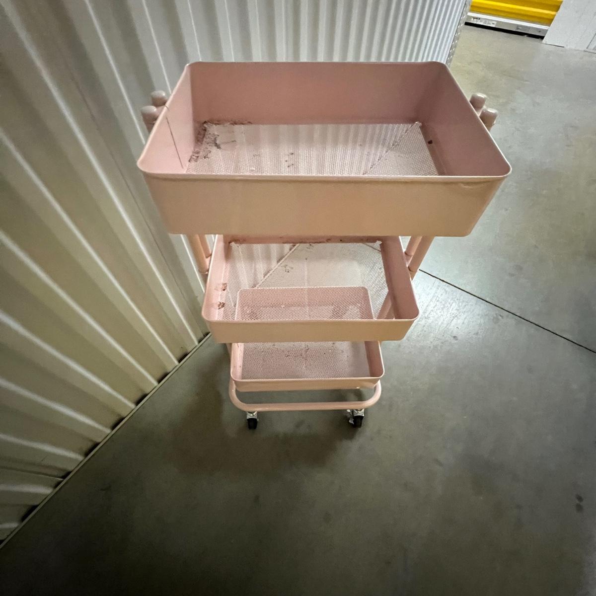 Two rolling units are both metal. The smaller unit is pink, has locking wheels and fixed drawers. The larger unit is white with pull out baskets in varying sizes; see image for measurement.