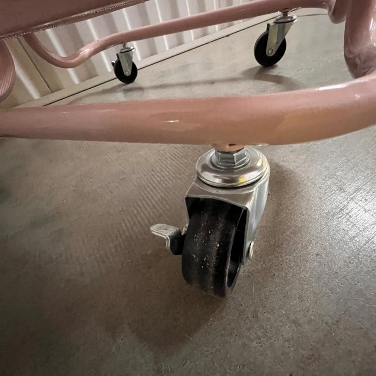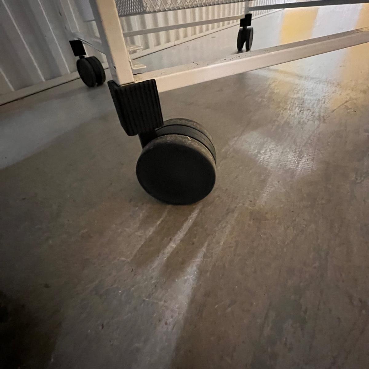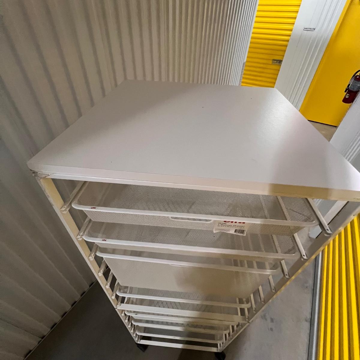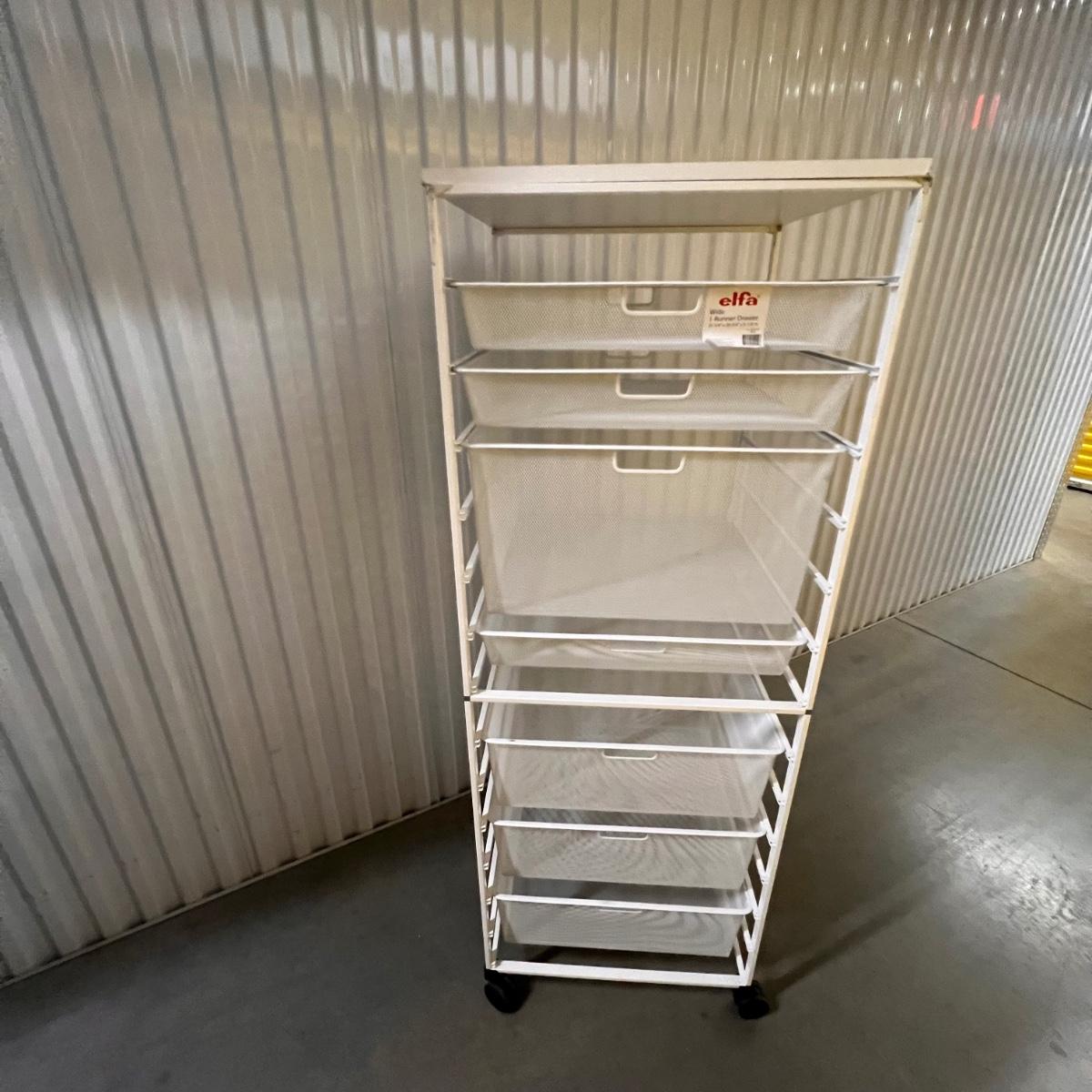 Two rolling units are both metal. The smaller unit is pink, has locking wheels and fixed drawers. The larger unit is white with pull out baskets in varying sizes; see image for measurement.