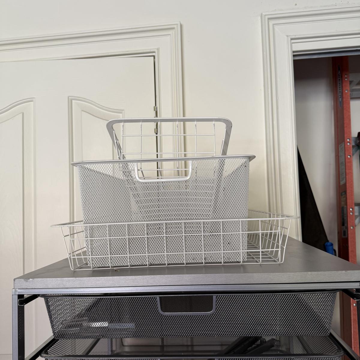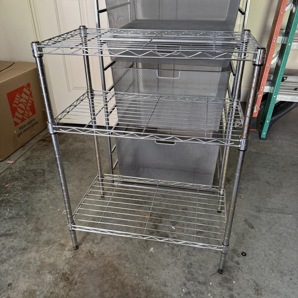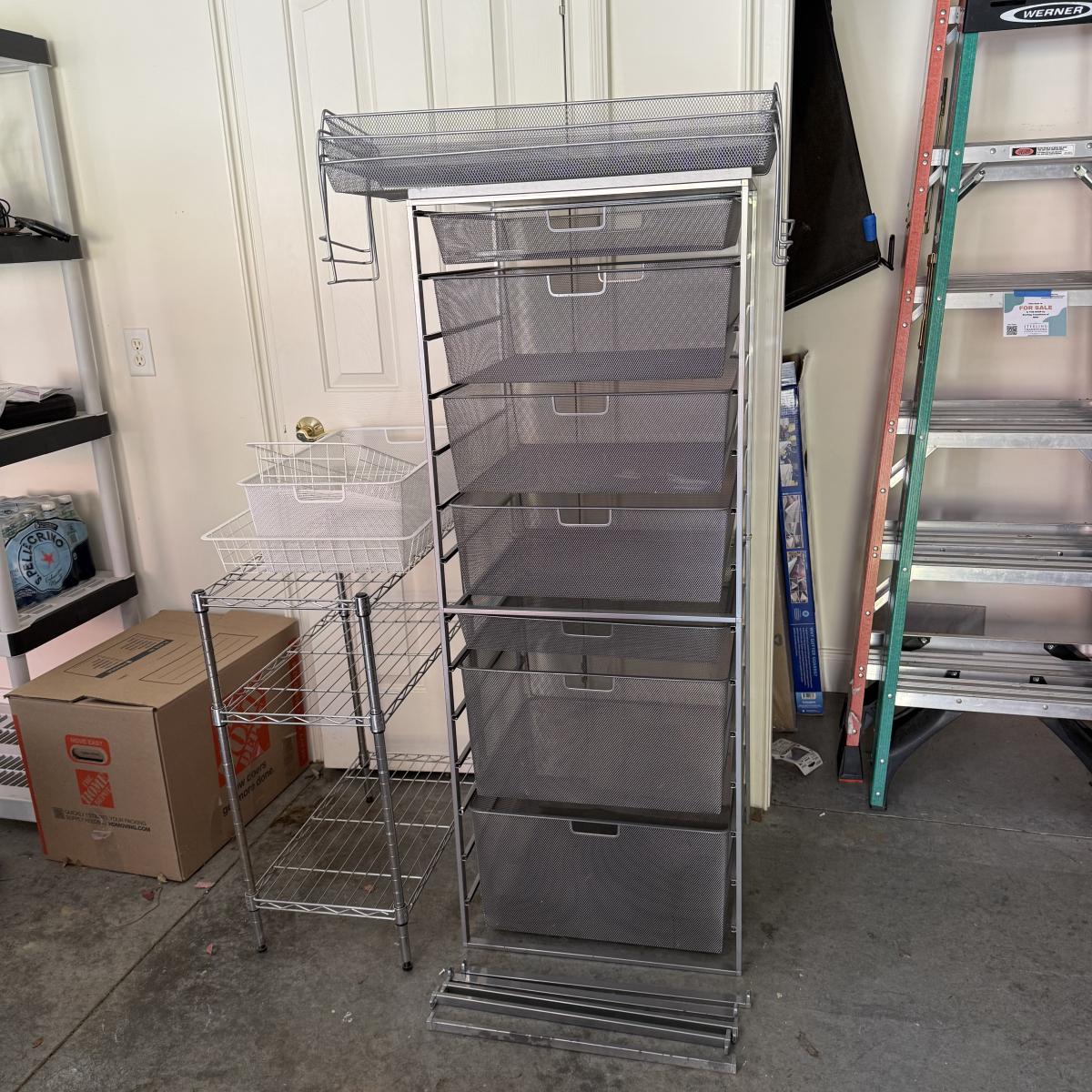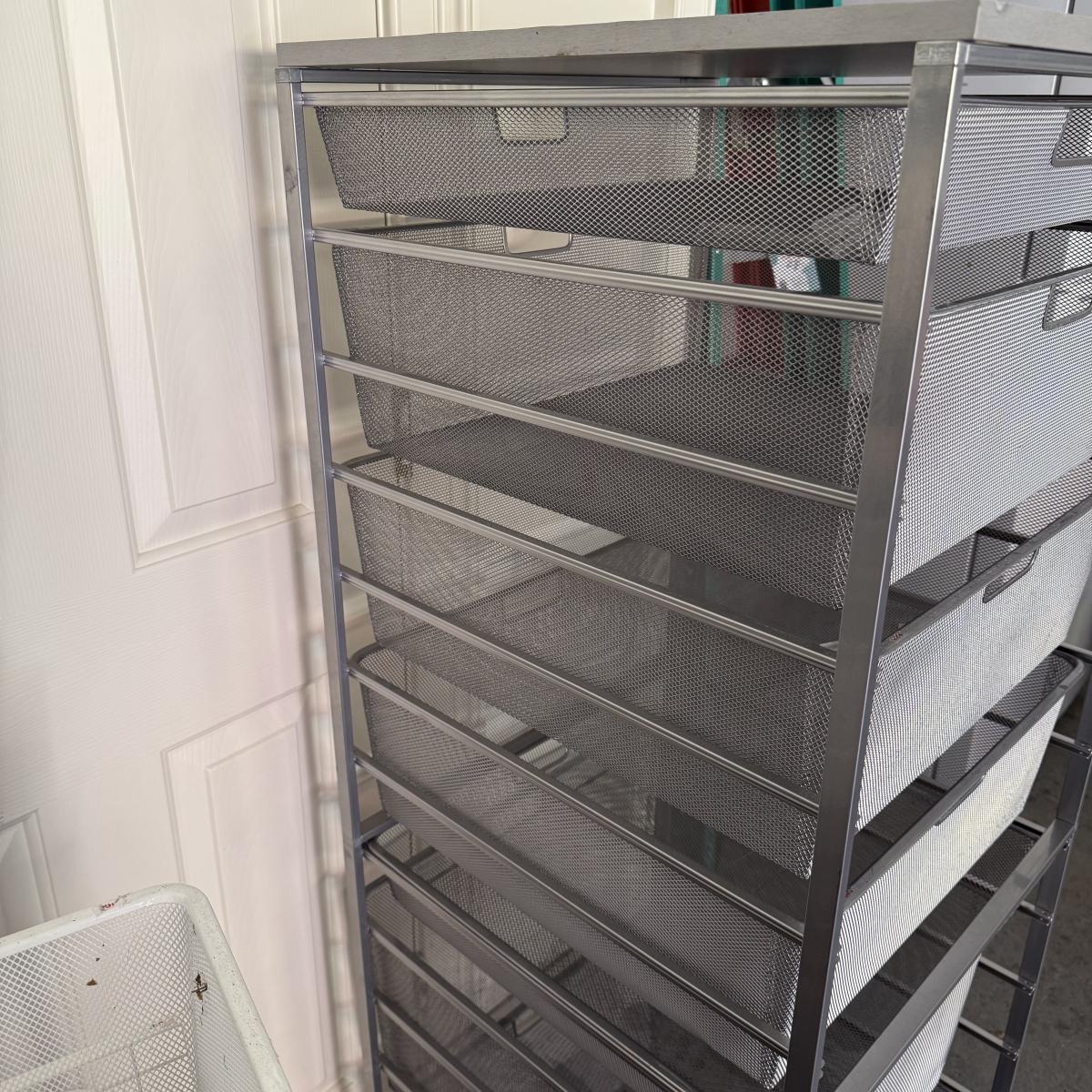 Elfa silver mesh, seven drawer storage unit with three additional white Elfa baskets and extra feet. Lot also features a compact NSF silver metal shelf and three silver metal mesh single shelf organizers. The tall Elfa unit is 21.75” x 21.25” x 57.25”, it needs some cleaning and some baskets may be stained, see images. The NSF shelf measure 23” x 13.25” x 30.5”H, this shelf shows rust on its legs. Ladders and the Home Dept box in the photos are not included.
