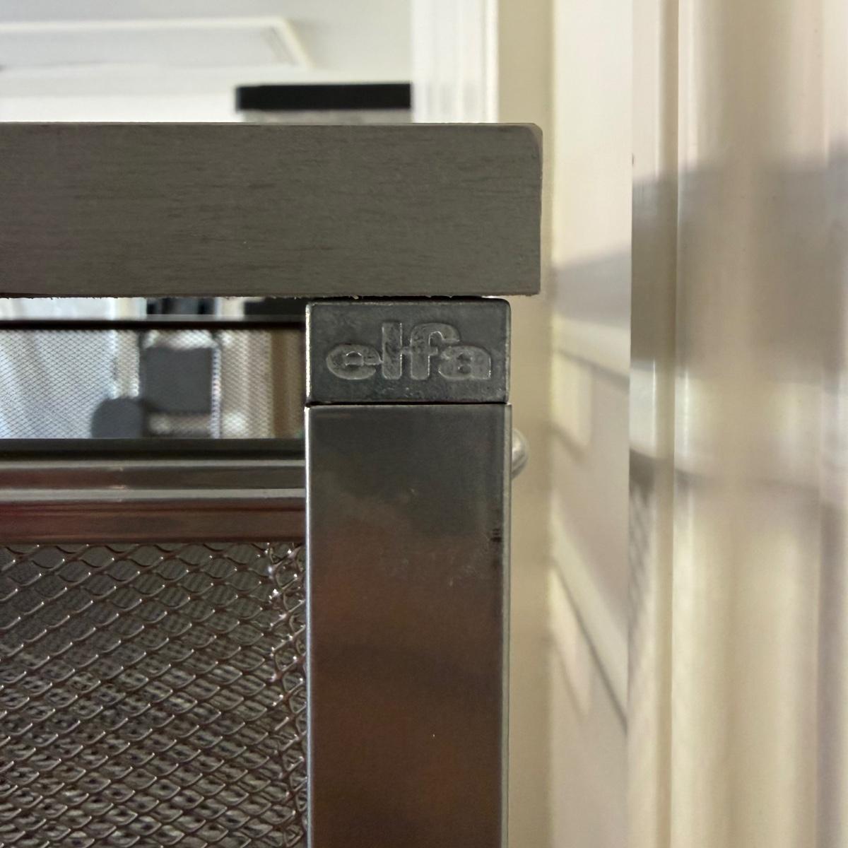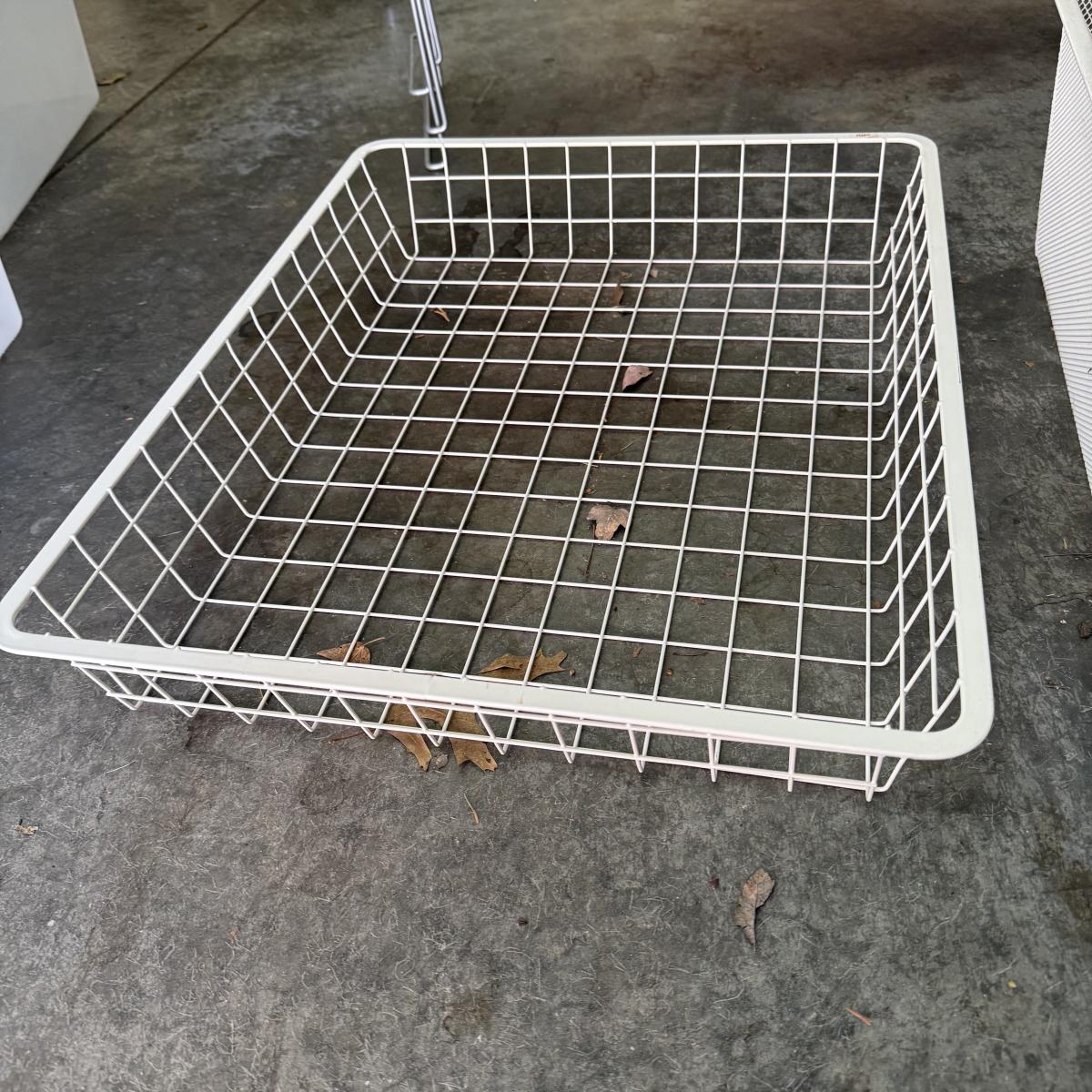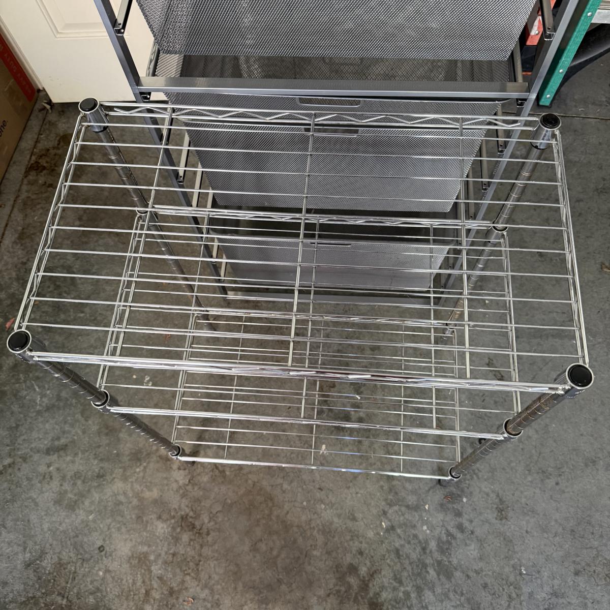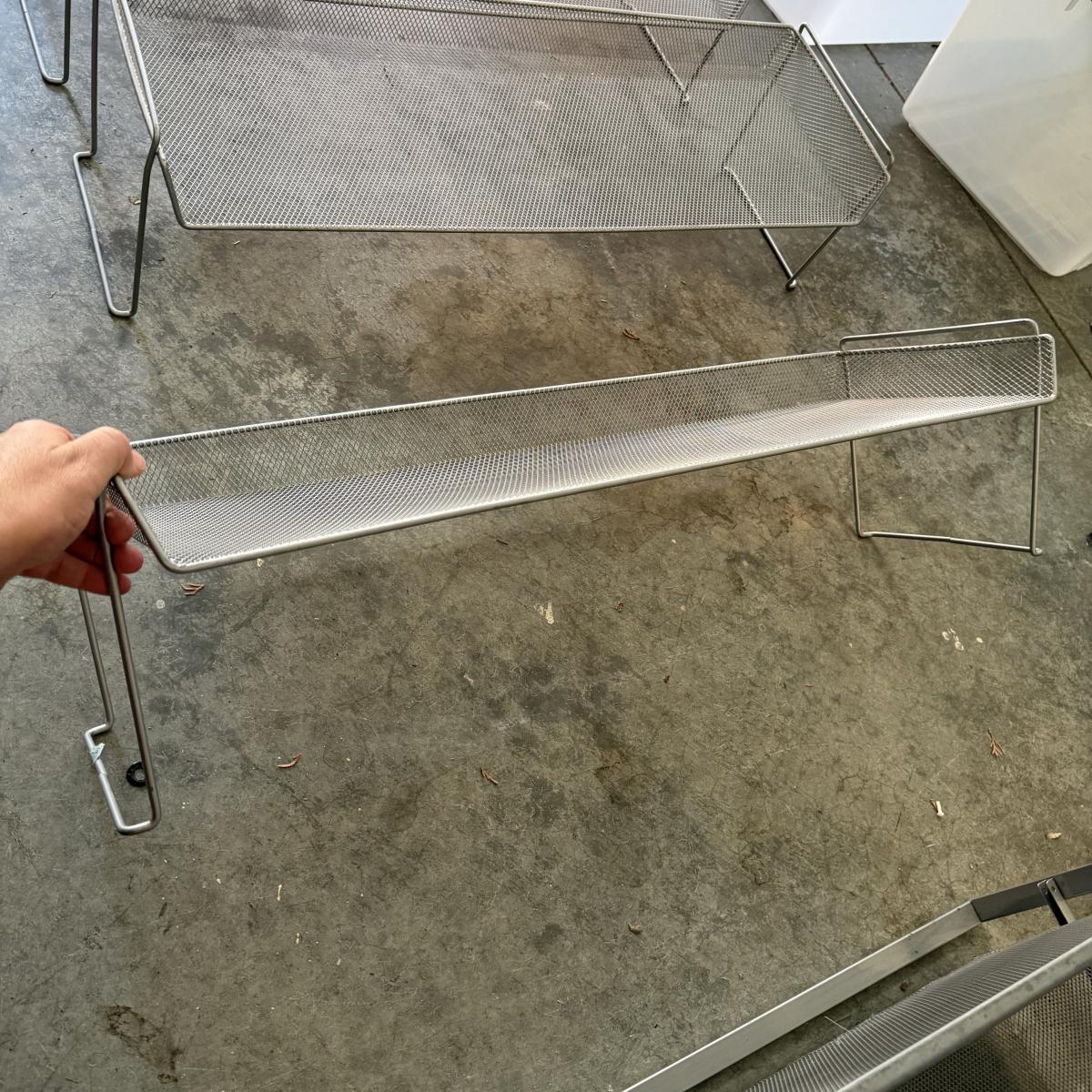 Elfa silver mesh, seven drawer storage unit with three additional white Elfa baskets and extra feet. Lot also features a compact NSF silver metal shelf and three silver metal mesh single shelf organizers. The tall Elfa unit is 21.75” x 21.25” x 57.25”, it needs some cleaning and some baskets may be stained, see images. The NSF shelf measure 23” x 13.25” x 30.5”H, this shelf shows rust on its legs. Ladders and the Home Dept box in the photos are not included.