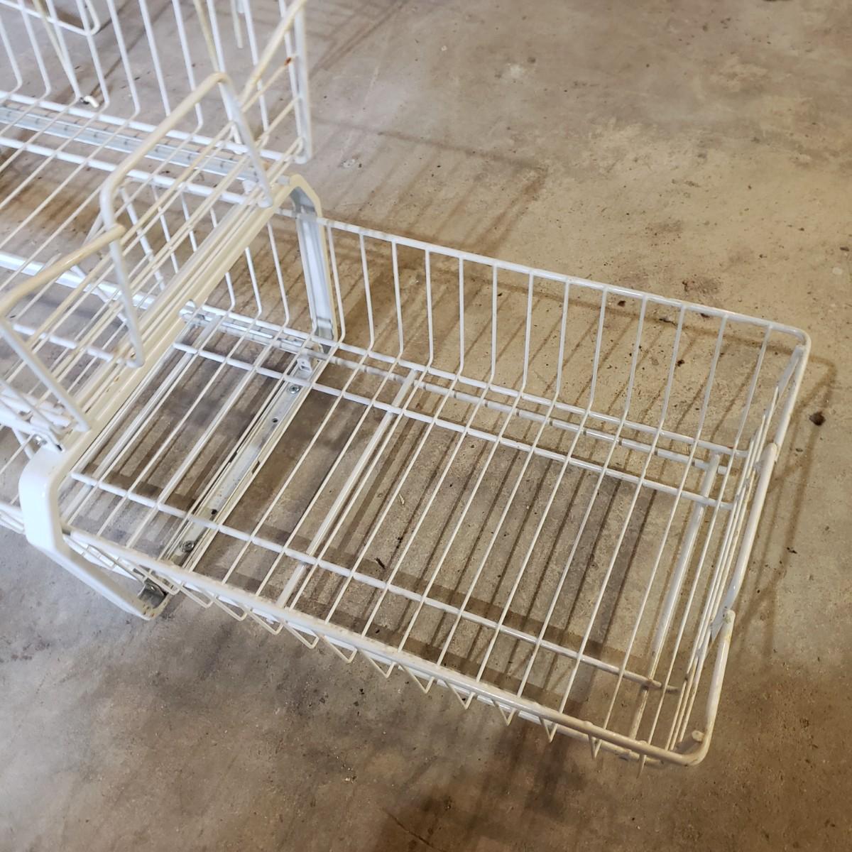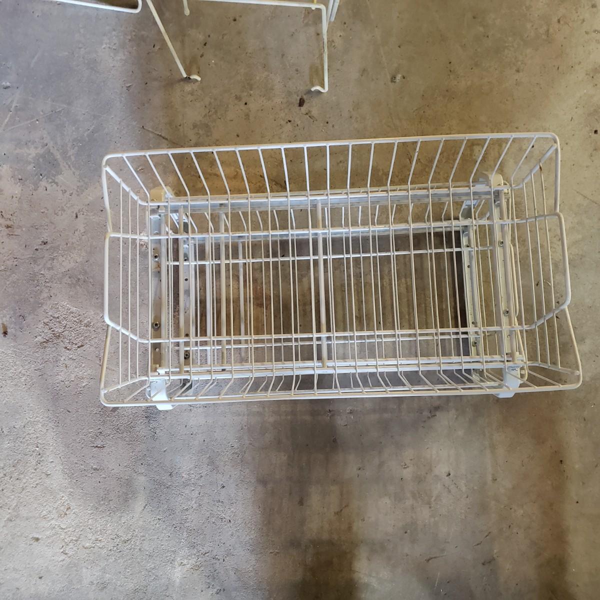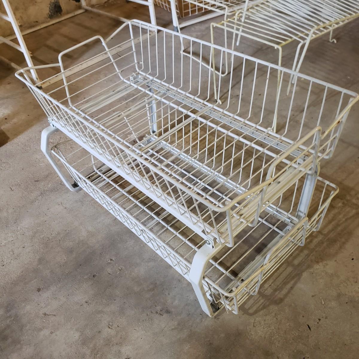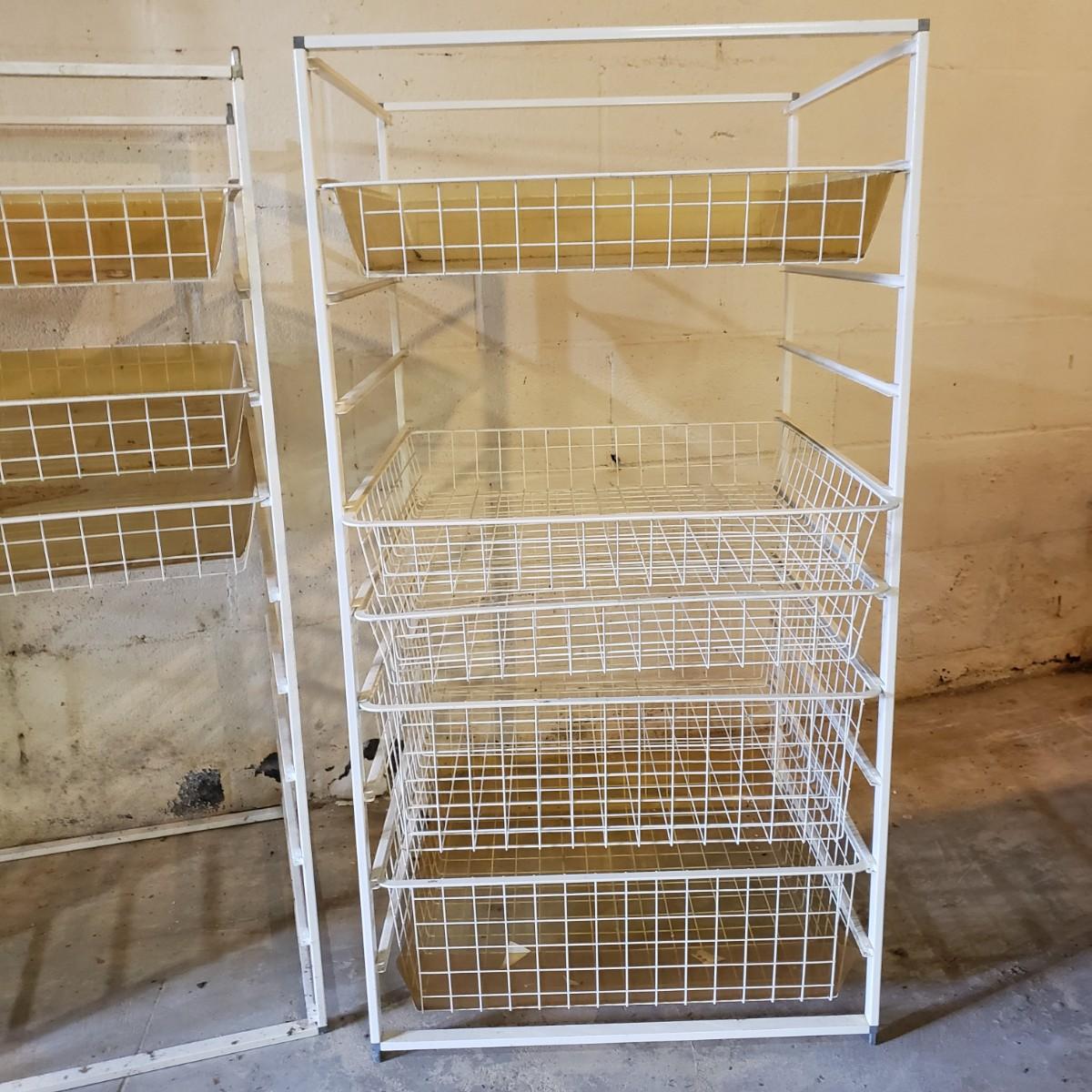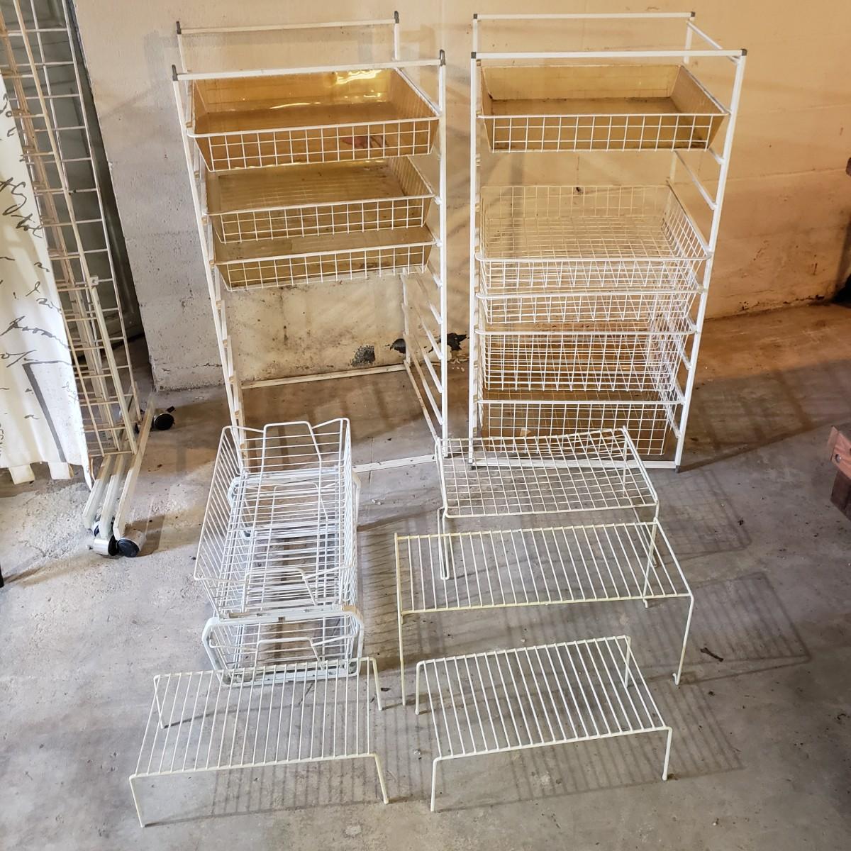 These two Elfa wire rack systems measure 22" x 21" x 41"H. The two racks can be stacked and fitted together, see photos. One rack has five wire baskets, the other has three baskets. Some baskets have a tan clear thick liner so items do not fall through. The four in cabinet wire racks help in utilizing large cabinets. The largest one measures 18" x 12" x 9"H. The two tired wire cabinet insert can be mounted inside a cabinet.