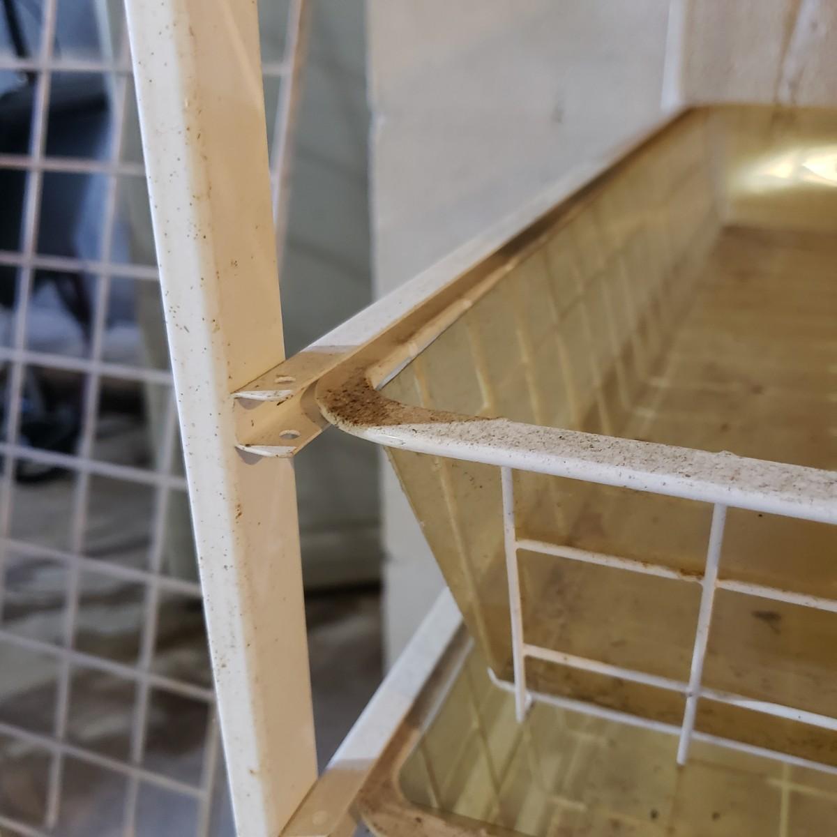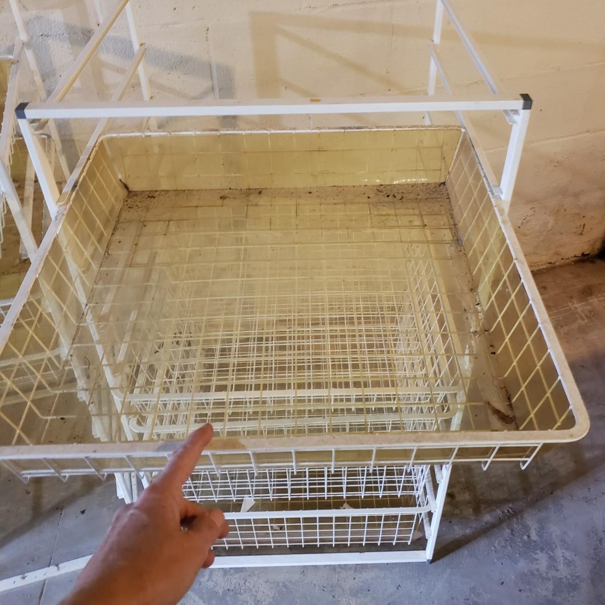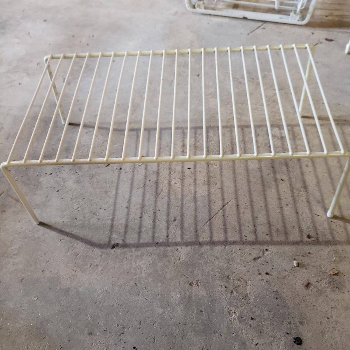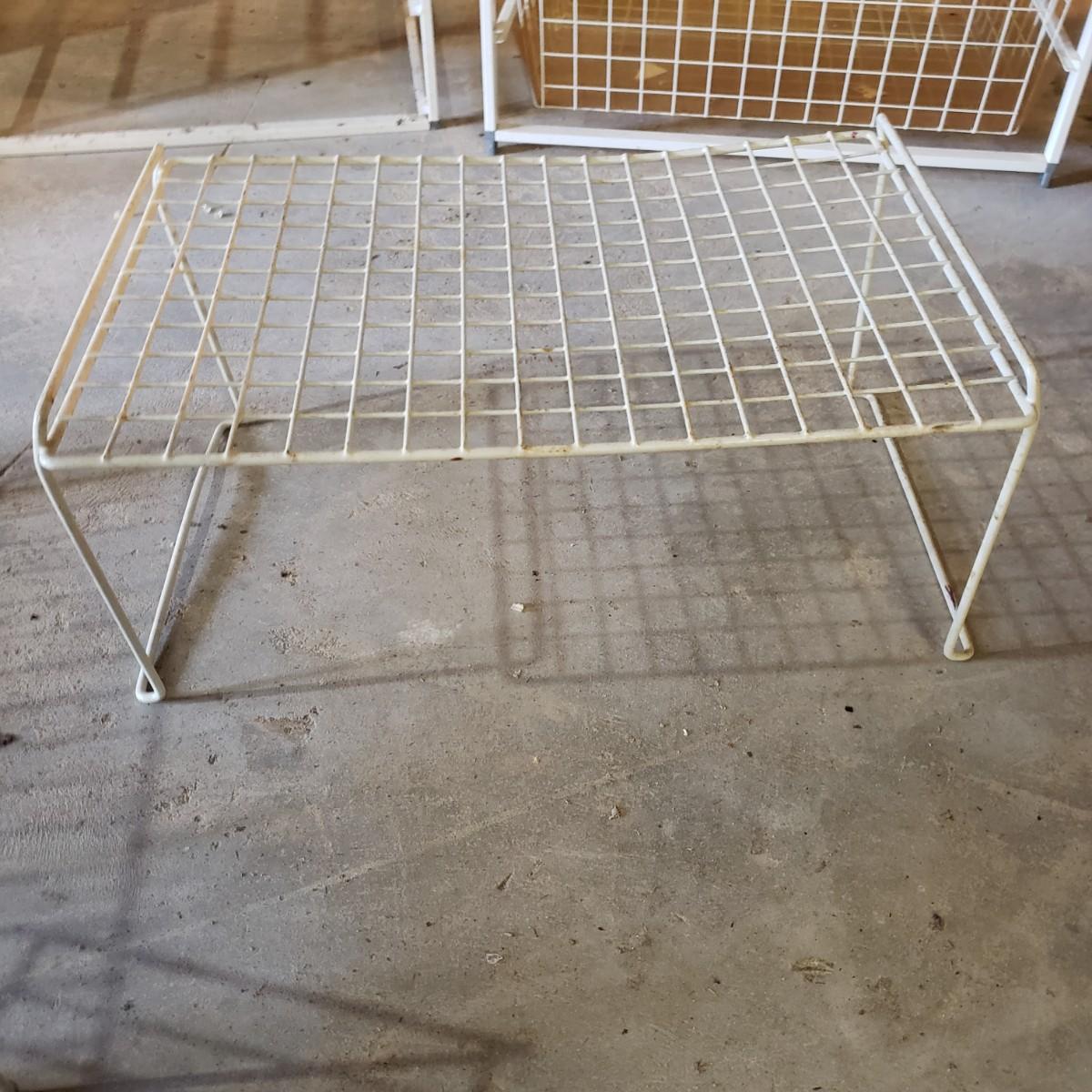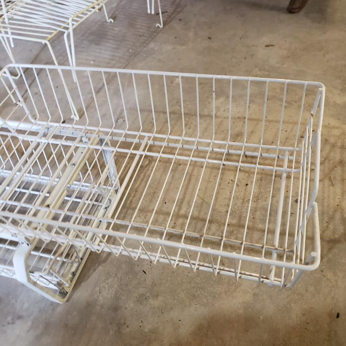 These two Elfa wire rack systems measure 22" x 21" x 41"H. The two racks can be stacked and fitted together, see photos. One rack has five wire baskets, the other has three baskets. Some baskets have a tan clear thick liner so items do not fall through. The four in cabinet wire racks help in utilizing large cabinets. The largest one measures 18" x 12" x 9"H. The two tired wire cabinet insert can be mounted inside a cabinet.