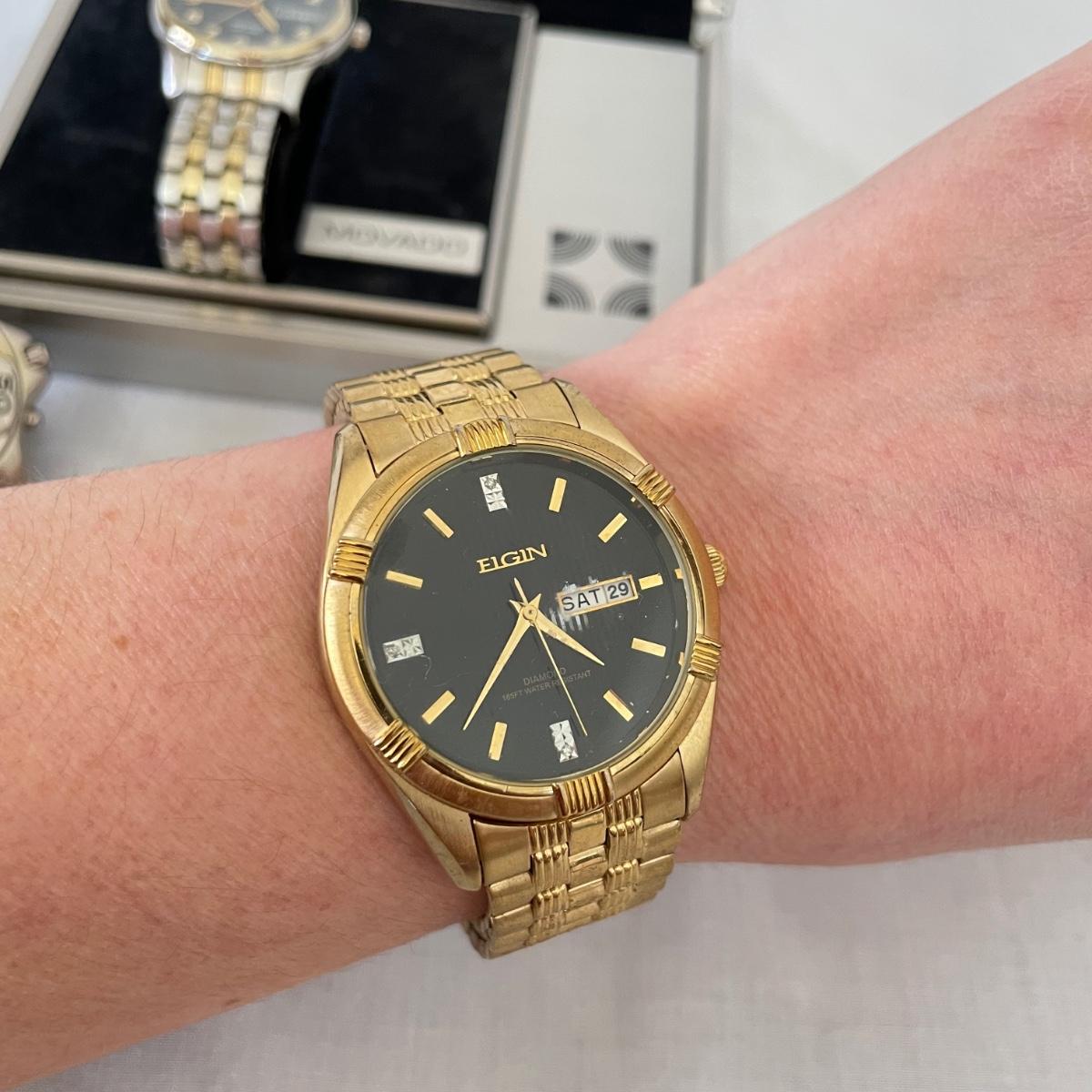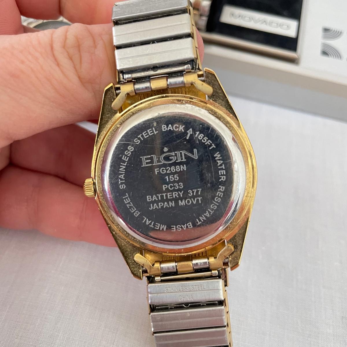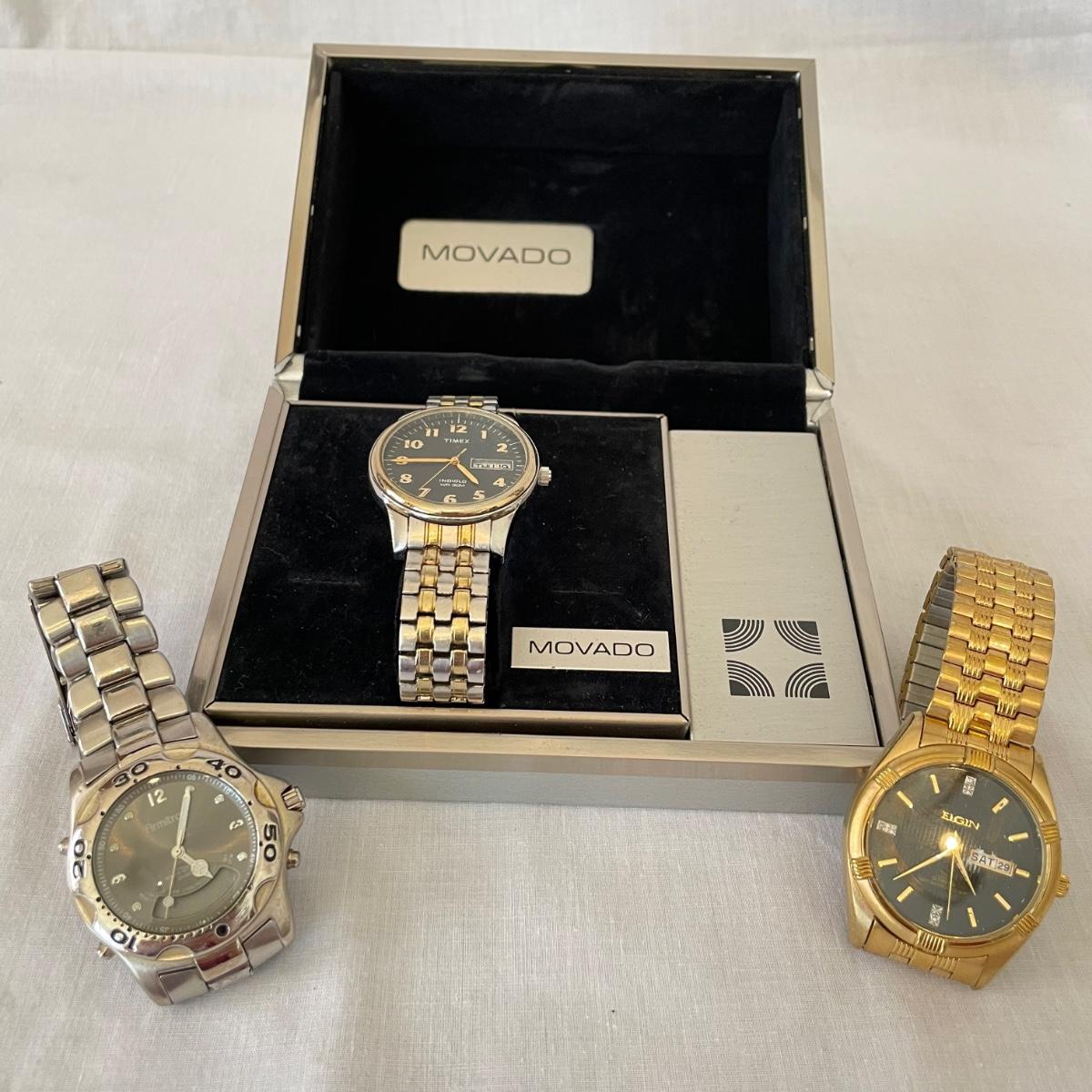 Three watches with one Movado watch box. The Elgin and Armitron are both water resistant, the Armitron is analog with a digital screen. Both the Elgin and Timex have date/day windows. All watches likely need new batteries and could not be tested. Shipping available. All sales are final. No returns or refunds. Please bid accordingly.