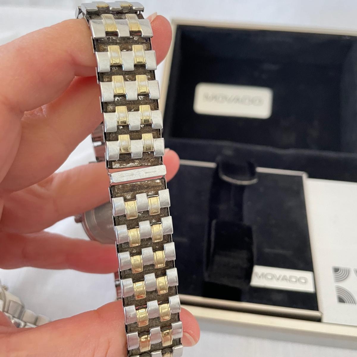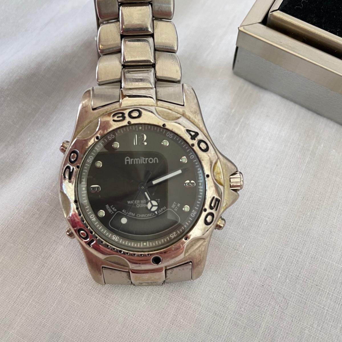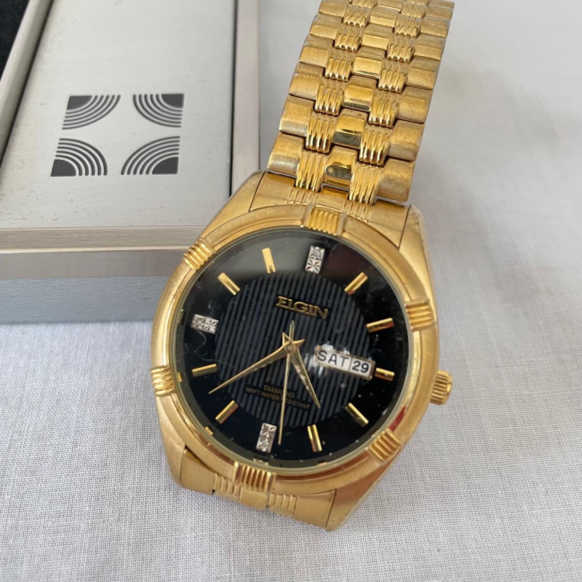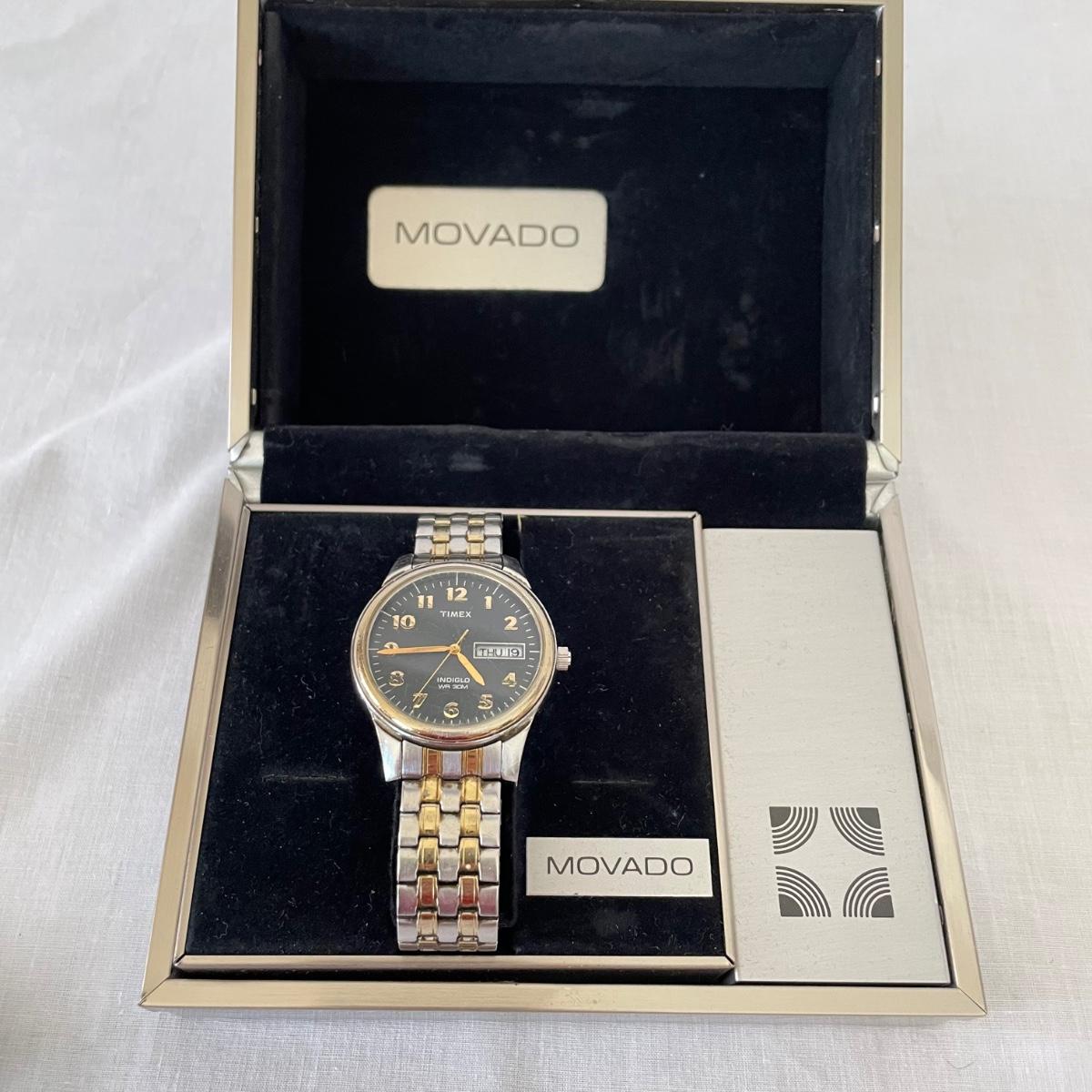 Three watches with one Movado watch box. The Elgin and Armitron are both water resistant, the Armitron is analog with a digital screen. Both the Elgin and Timex have date/day windows. All watches likely need new batteries and could not be tested. Shipping available. All sales are final. No returns or refunds. Please bid accordingly.