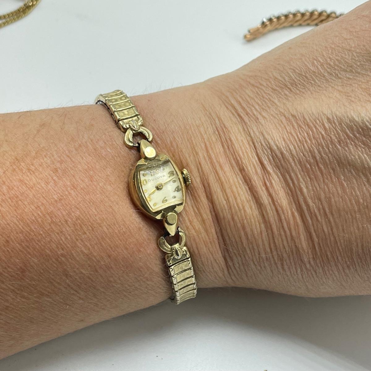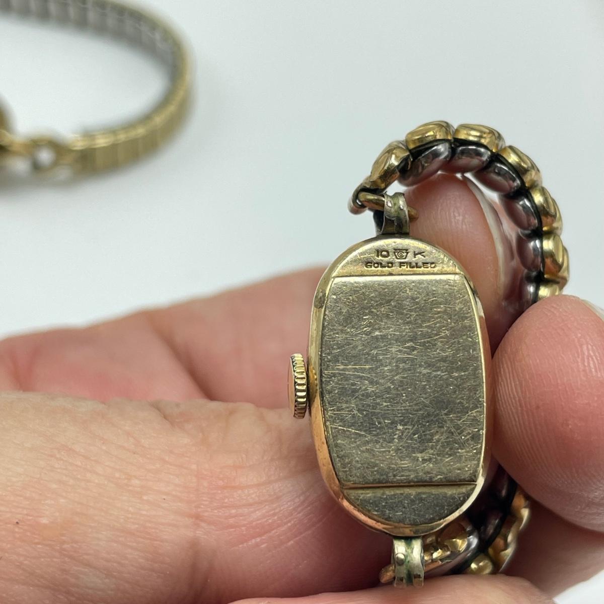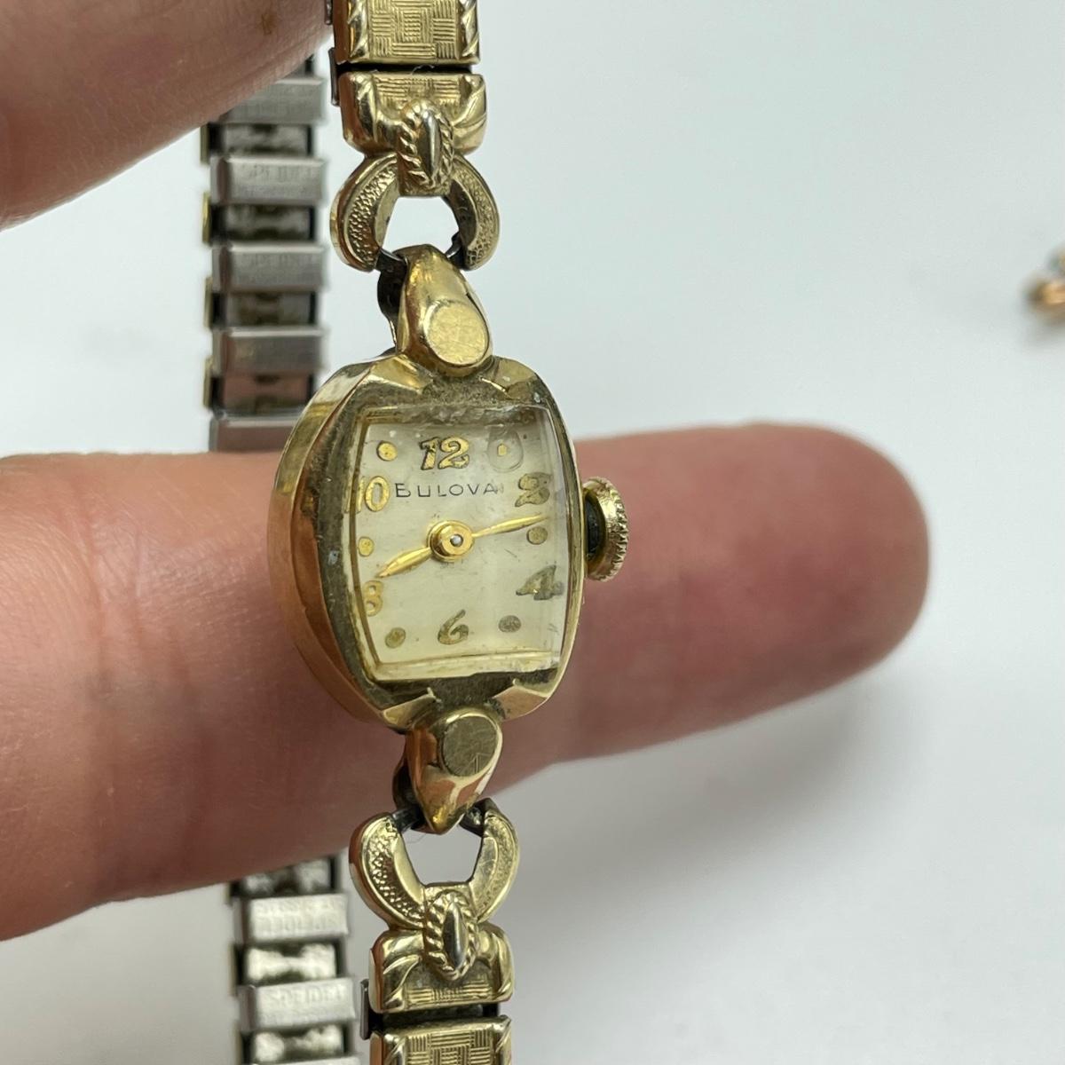 Nice selection of ladies wrist watches including Elgin, Hallmark, and two Bulova. The Hallmark watch and the Bulova on a chain are both without bands, 24” chain marked 12K GF and an elastic rose colored band are included in the lot. The Quartz watch has a beautiful opal-like face, but also what appears to be oxidation on the hinges with some missing rhinestones. The South Bend watch is 2.5” with handle. See images. All sales are final. No returns or refunds. Please bid accordingly.