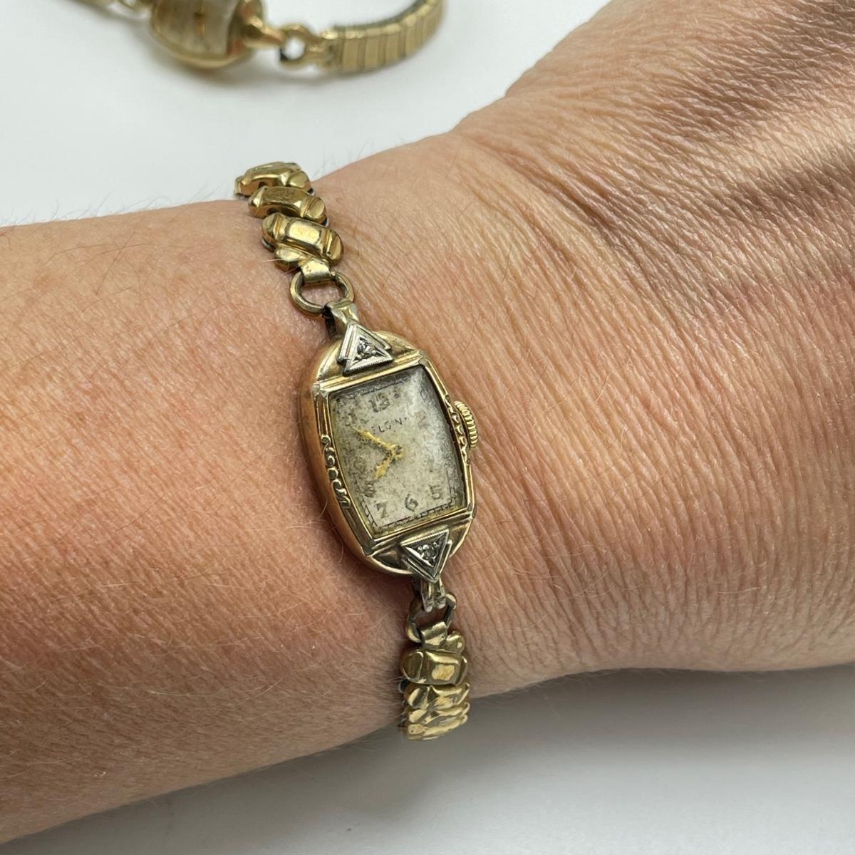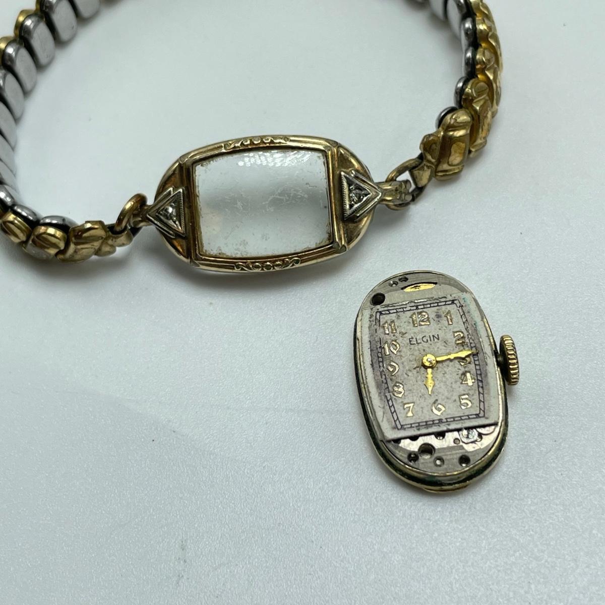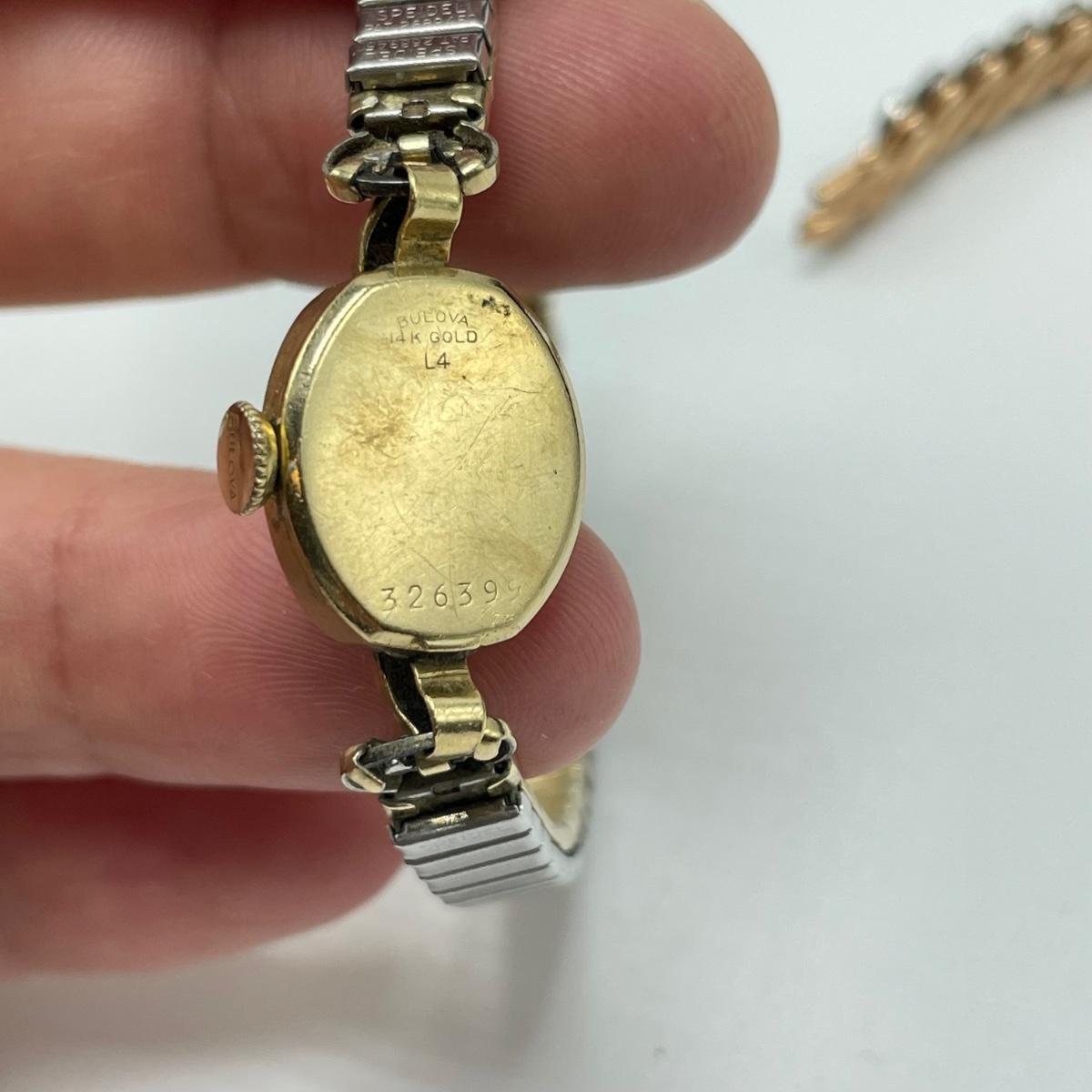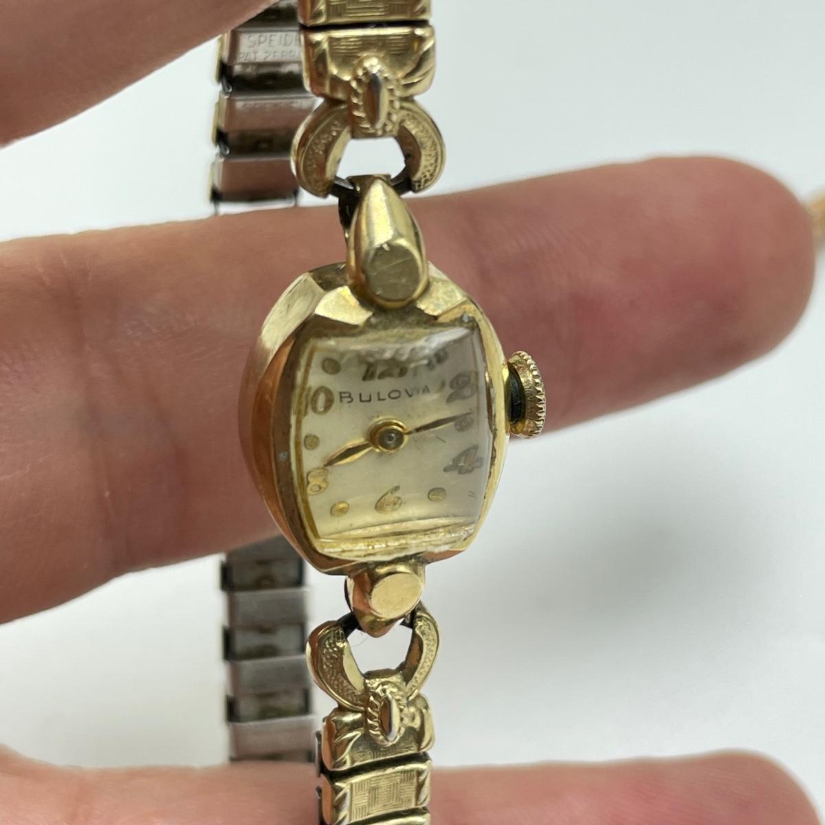 Nice selection of ladies wrist watches including Elgin, Hallmark, and two Bulova. The Hallmark watch and the Bulova on a chain are both without bands, 24” chain marked 12K GF and an elastic rose colored band are included in the lot. The Quartz watch has a beautiful opal-like face, but also what appears to be oxidation on the hinges with some missing rhinestones. The South Bend watch is 2.5” with handle. See images. All sales are final. No returns or refunds. Please bid accordingly.