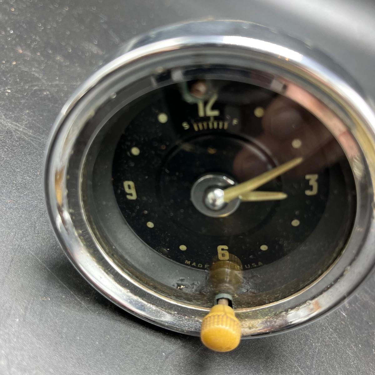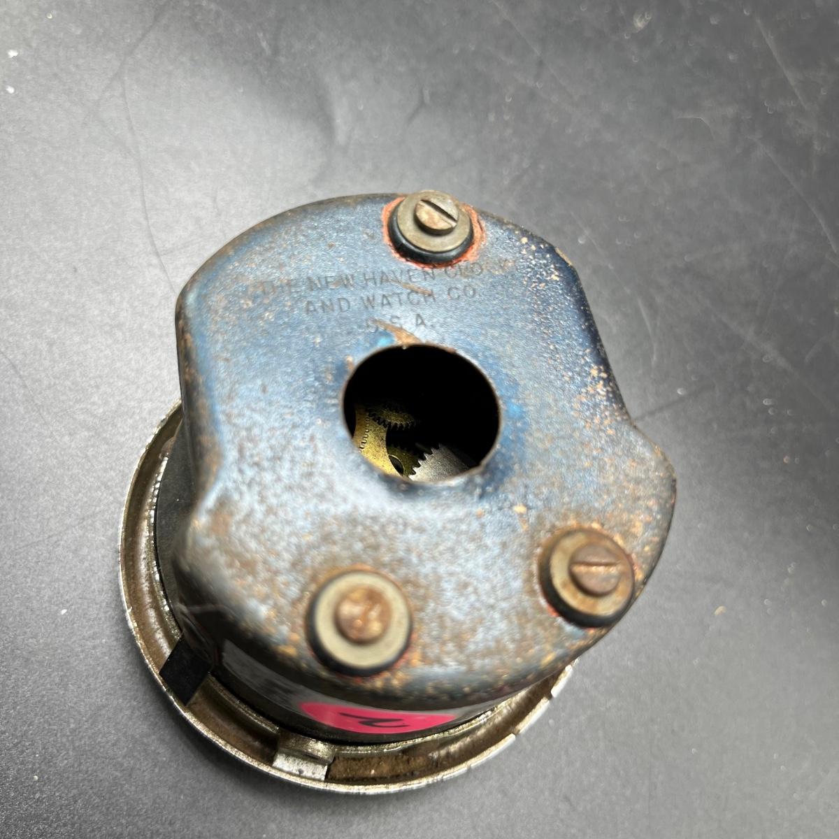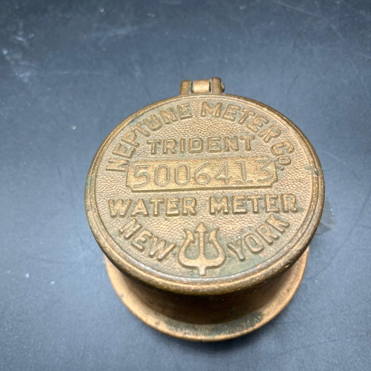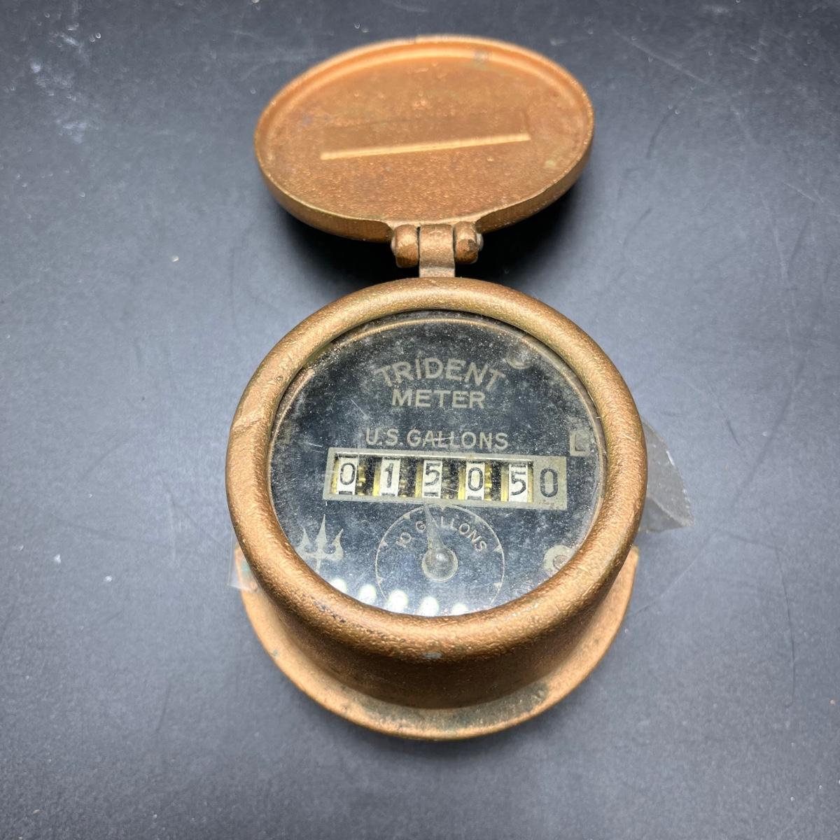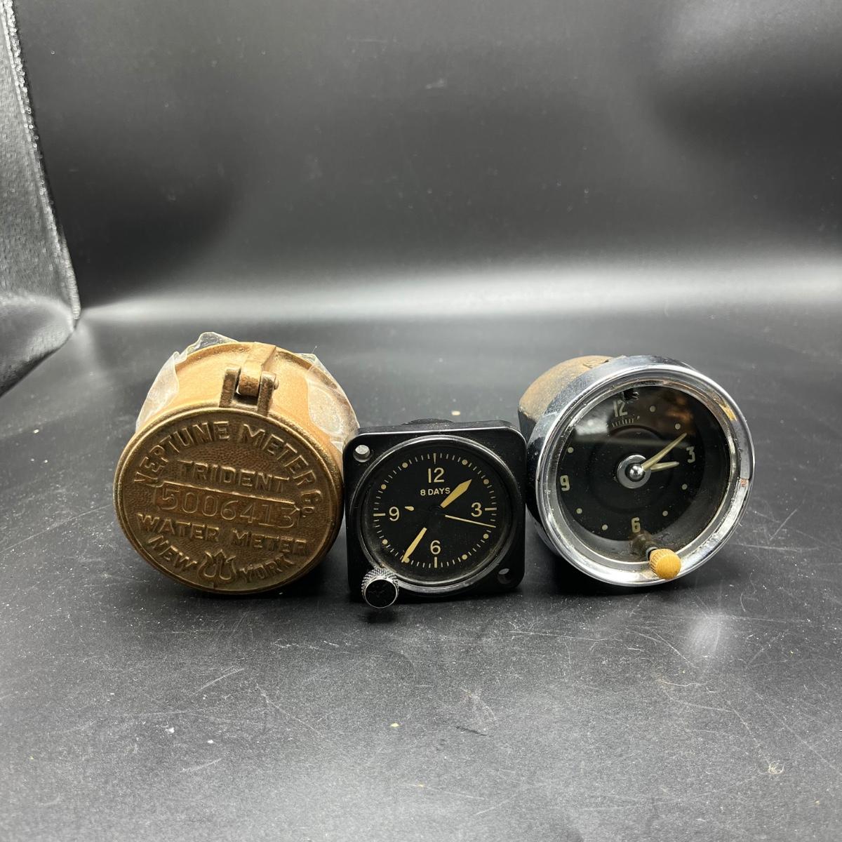 Lot includes a Elgin cockpit Clock part # 1776, Trident Water Meter and a New Haven Clock and Watch Co. automobile clock. All pieces have not been tested. Water meter measures 3.25”D x 2.25”.