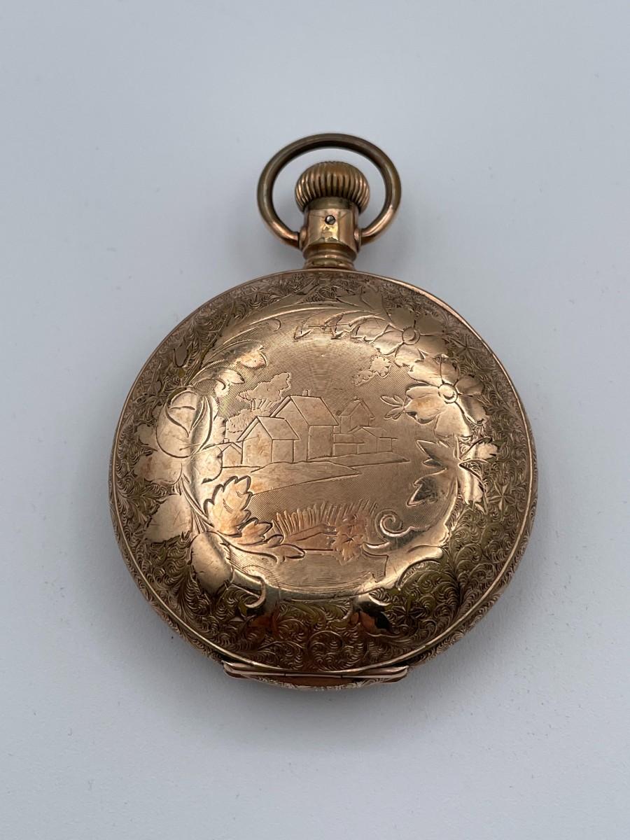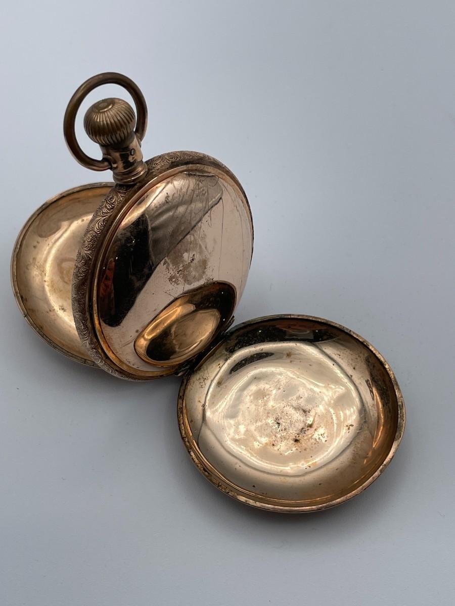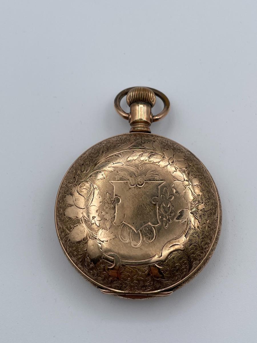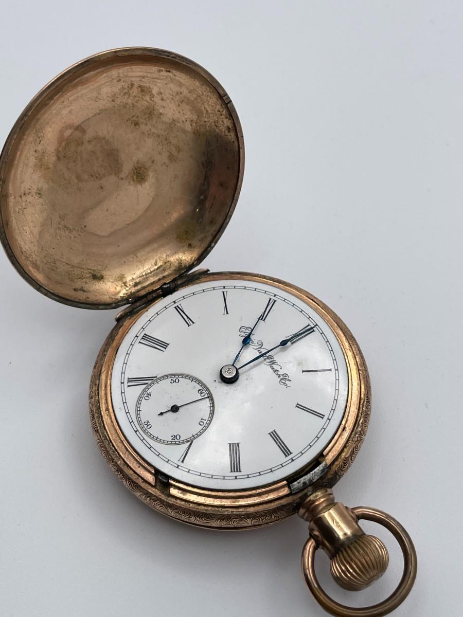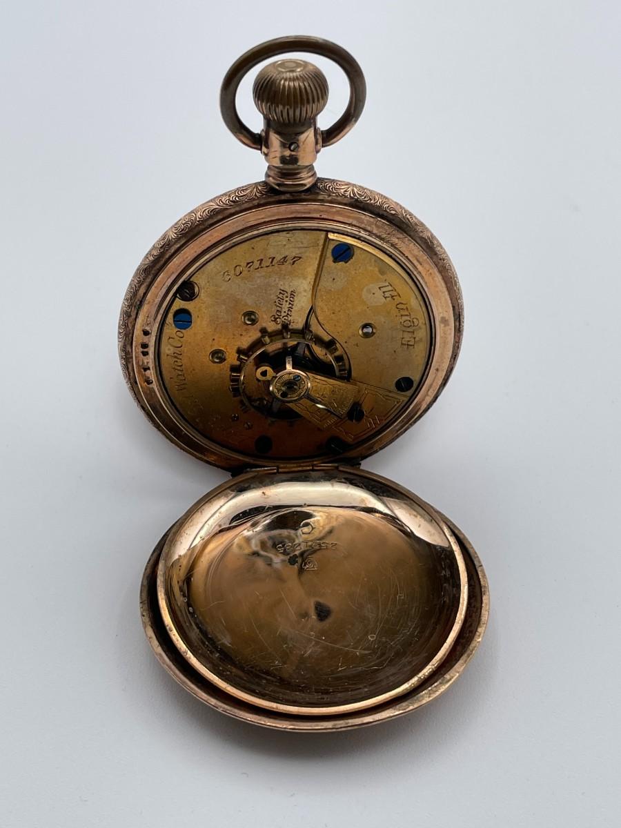 Elgin - Gold Tone - Watch number (6071147) - Size 18S - Gold Tone Holder (2531235) - There is No glass. Condition - Winder & watch are in working order. This is not a guarantee that all parts are original nor is the watch autheniticated. Estimated Value $175 - $235. Year 1896