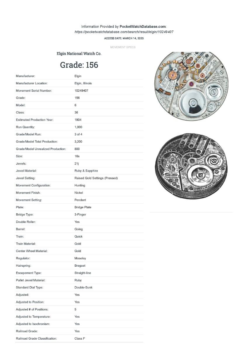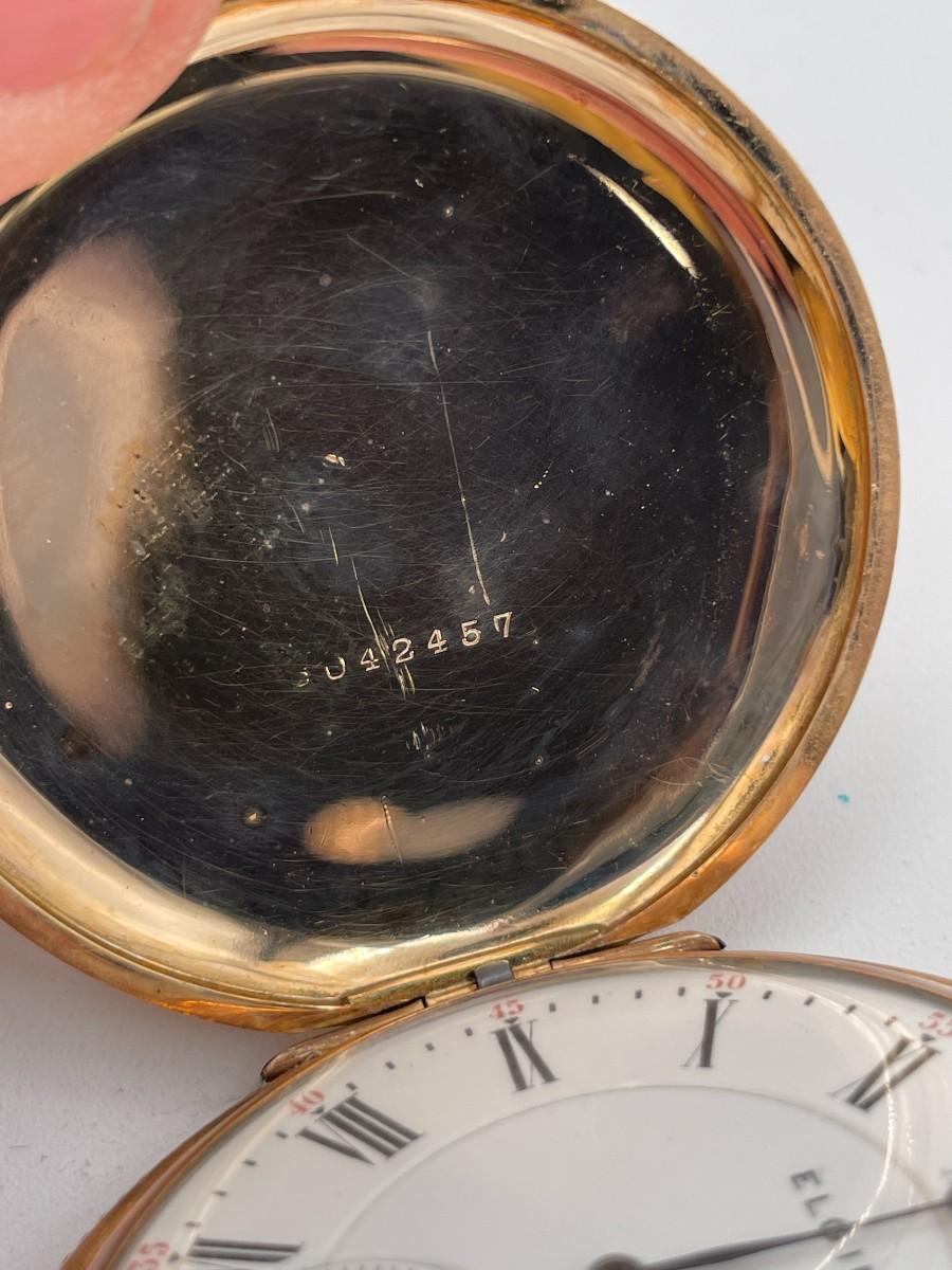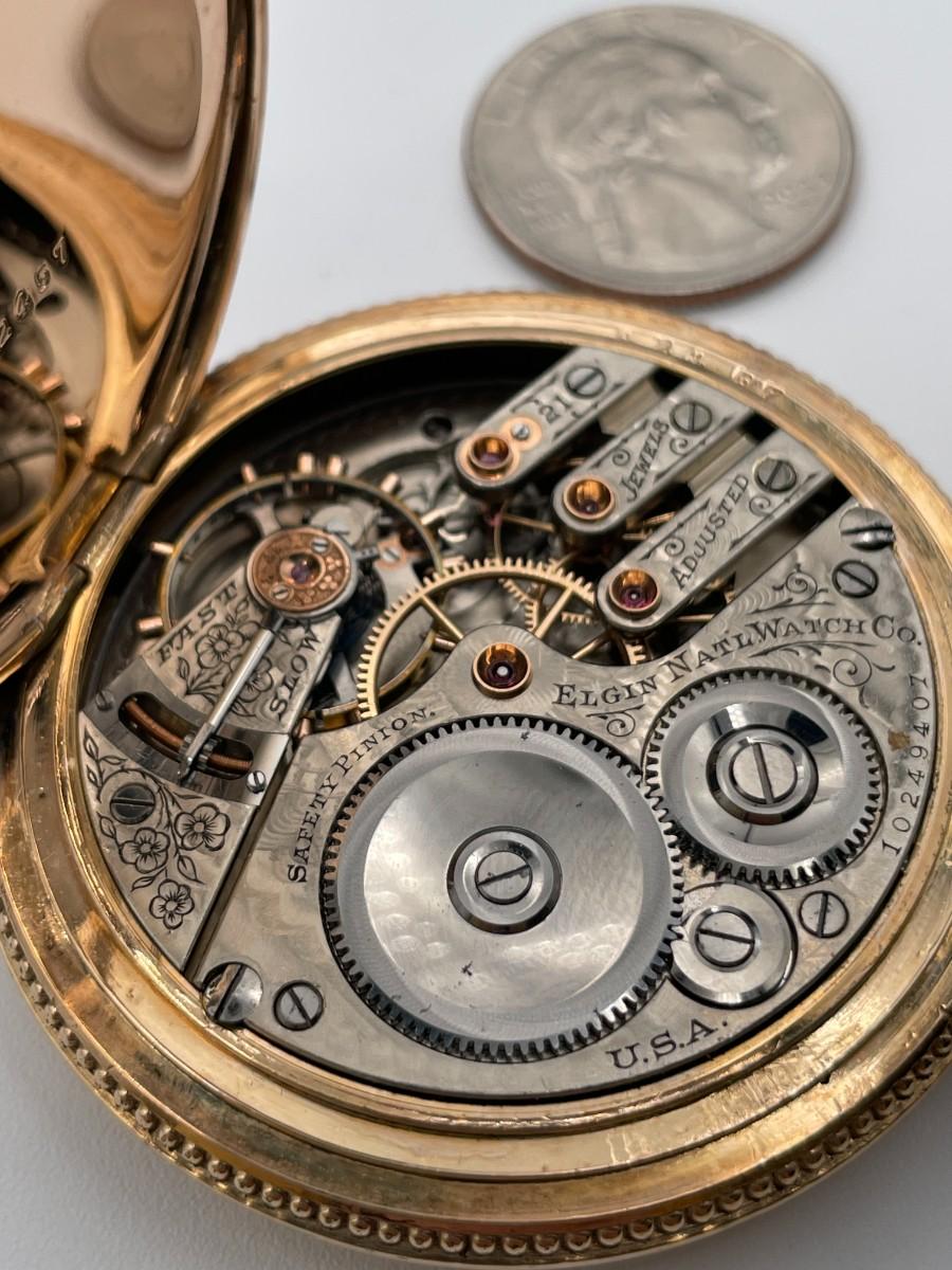 Elgin Pocket Watch, No. (10249407), Size 16s, Prod yr 1904, 21 Jewels. Case: No. 6042457, Jboss 14k, 24 yrs. Condition - Winder & watch are in working order. This is not a guarantee that all parts are original nor is the watch autheniticated.
