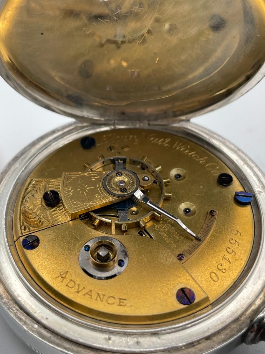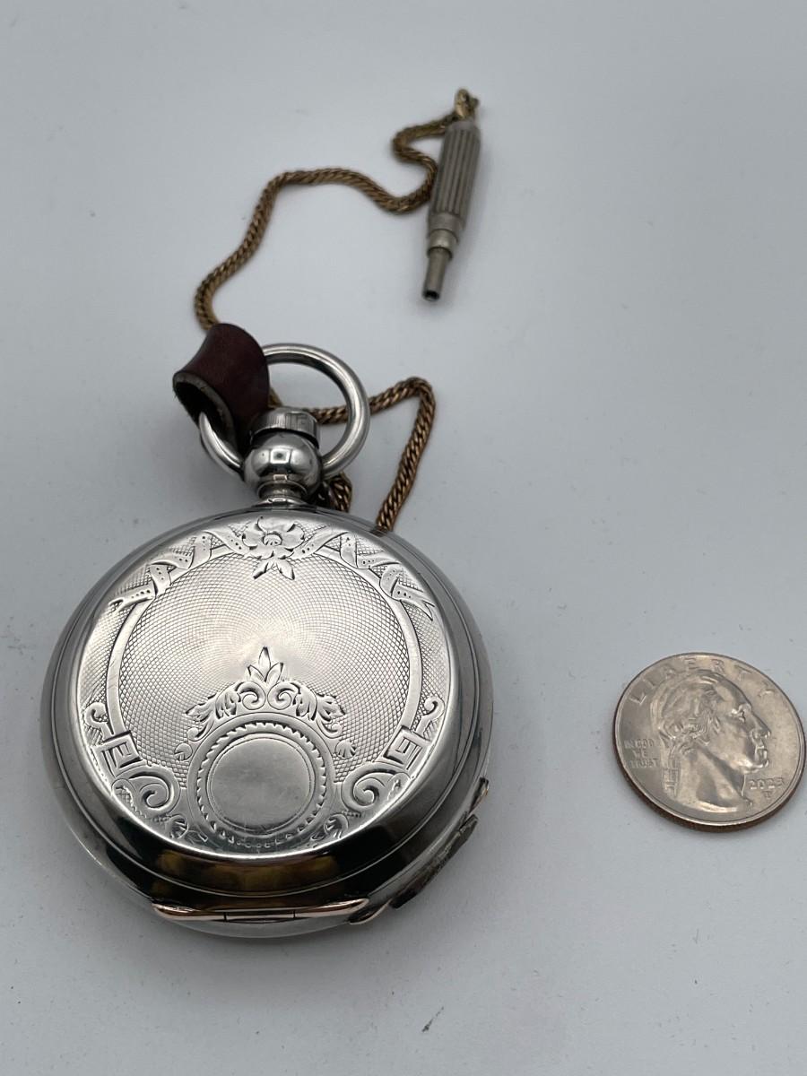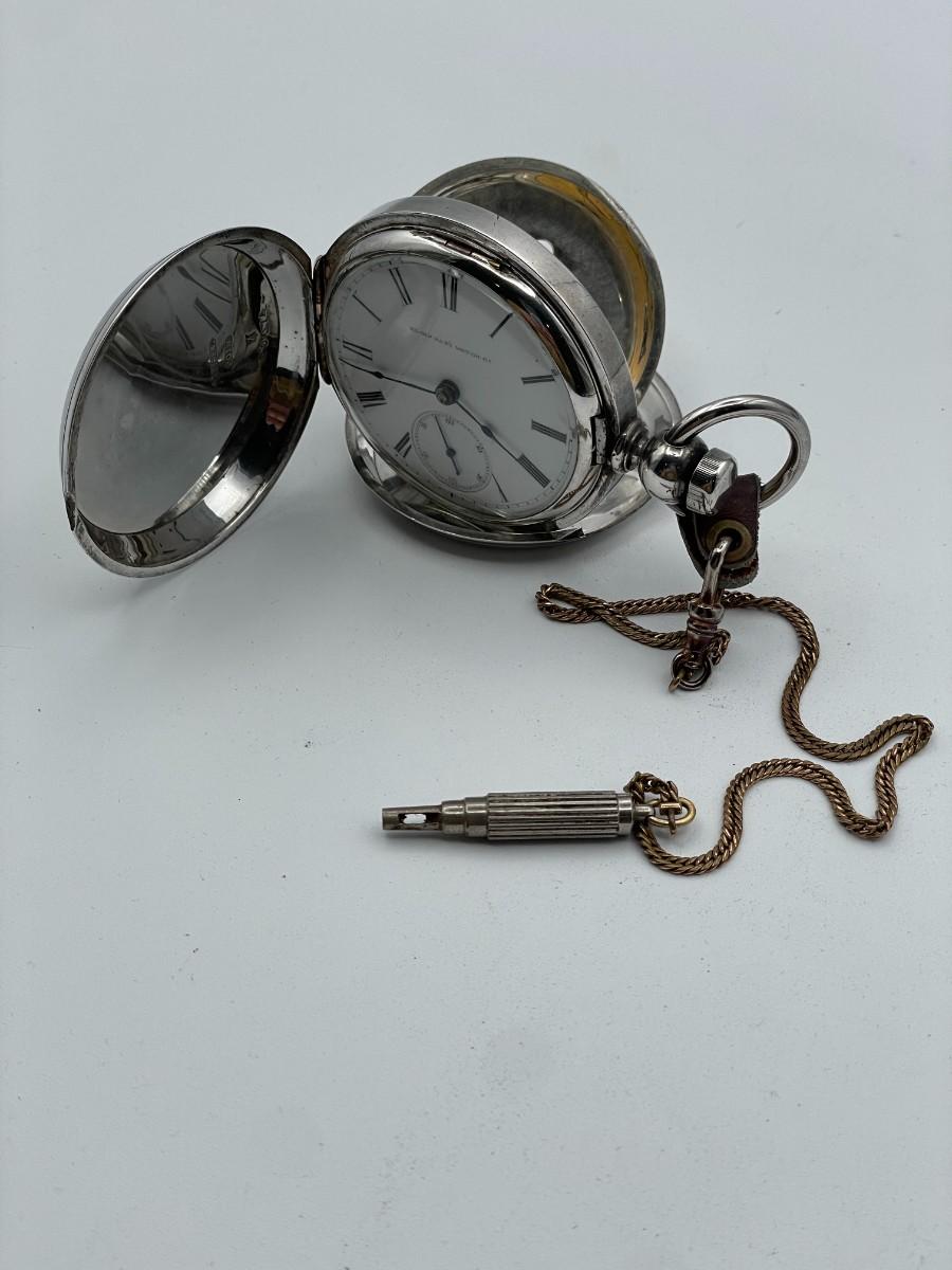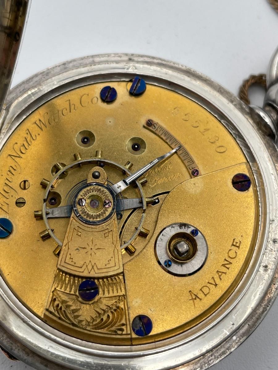 Elgin Natl Watch Co. Advance Pocket Watch, No. (555130), Size 18s, Prod Yr. 1878. Case: No. 80074, Dueber Coin; Chain with winding key attached. Condition - Winder & watch are in working order. This is not a guarantee that all parts are original nor is the watch autheniticated.