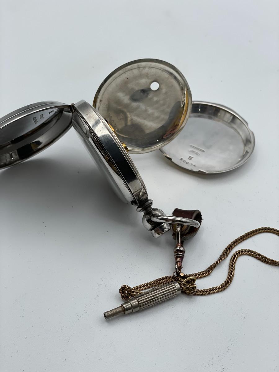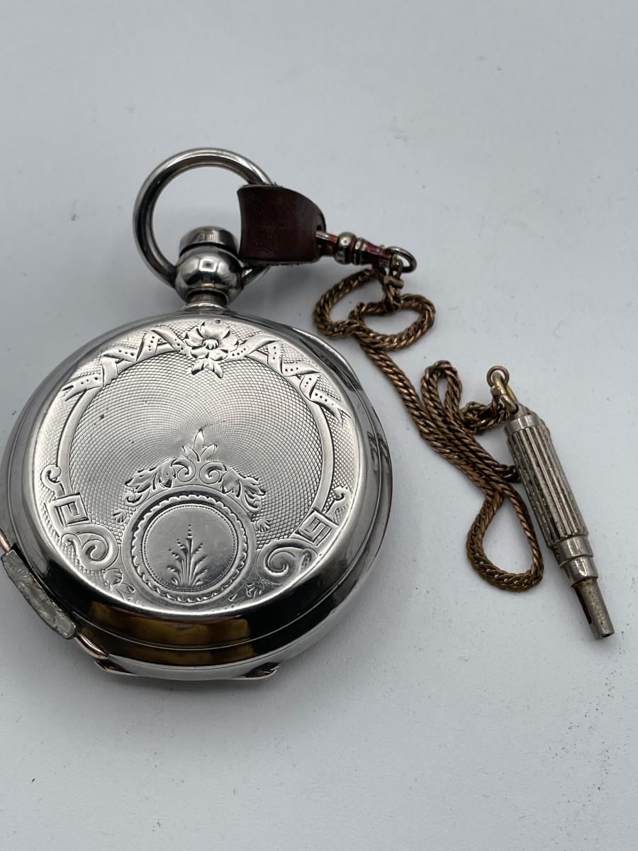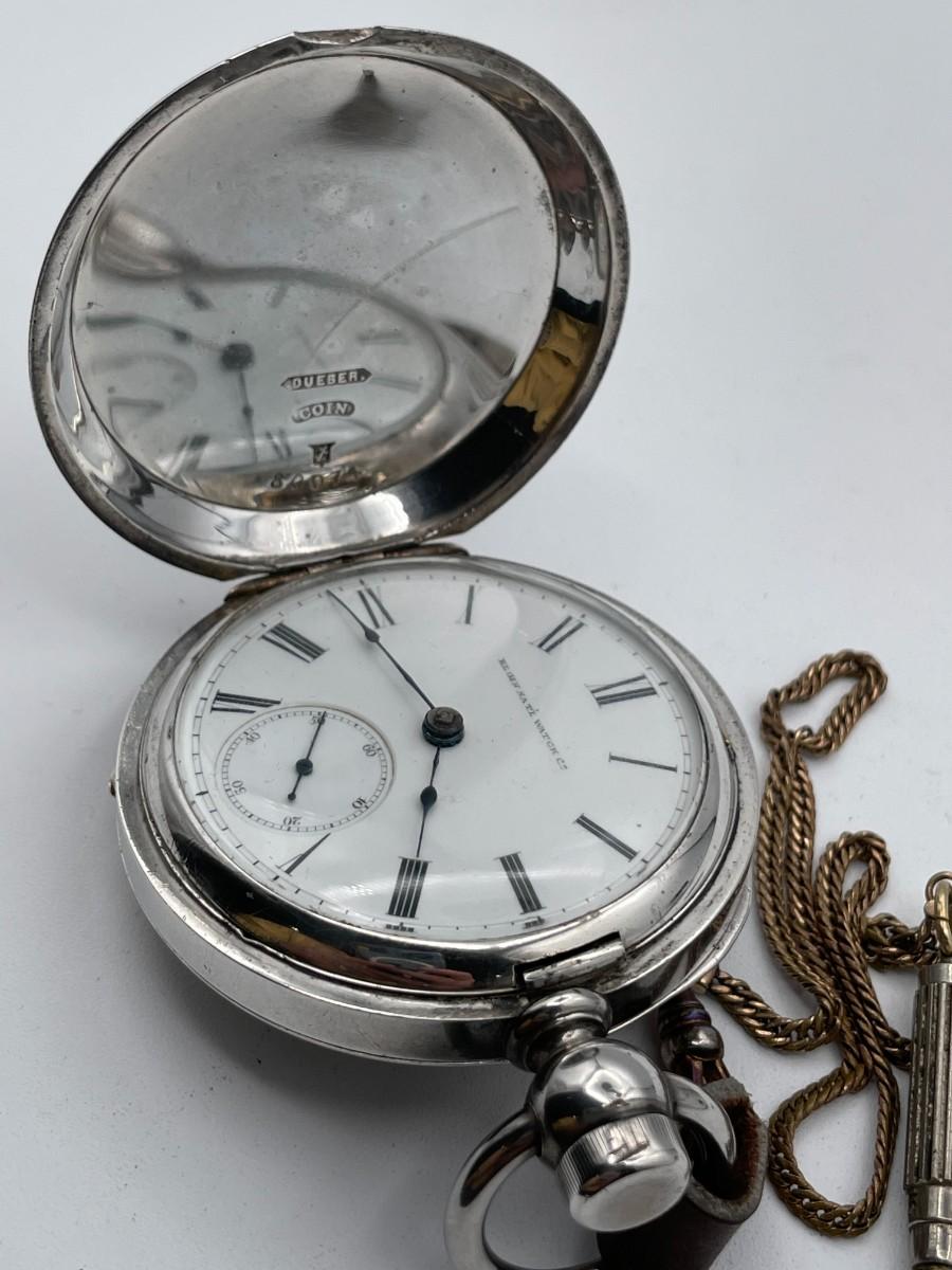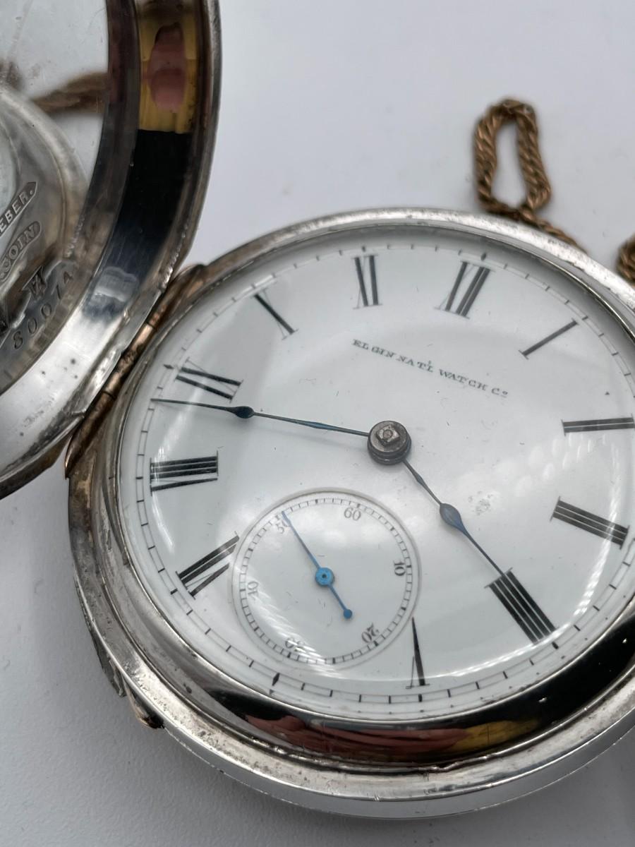 Elgin Natl Watch Co. Advance Pocket Watch, No. (555130), Size 18s, Prod Yr. 1878. Case: No. 80074, Dueber Coin; Chain with winding key attached. Condition - Winder & watch are in working order. This is not a guarantee that all parts are original nor is the watch autheniticated.
