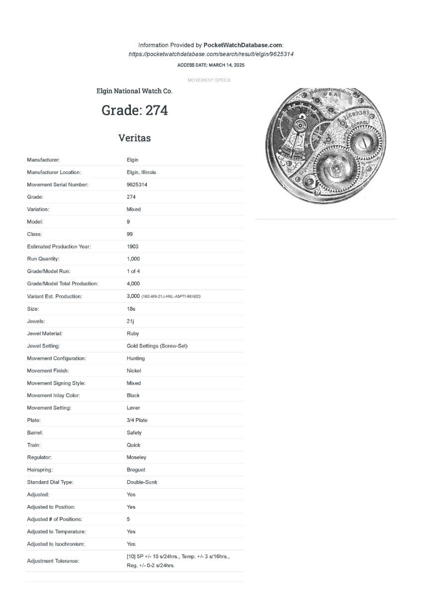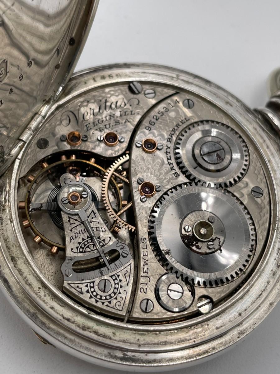Elgin Watch Co. Veritas Pocket Watch, No. (9625314), Size 18s, Prod Yr. 1903. Case: Keystone No. 61459, Coin. Condition - Winder & watch are in working order. This is not a guarantee that all parts are original nor is the watch autheniticated.