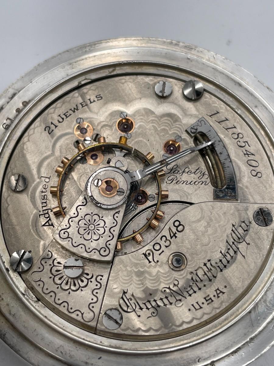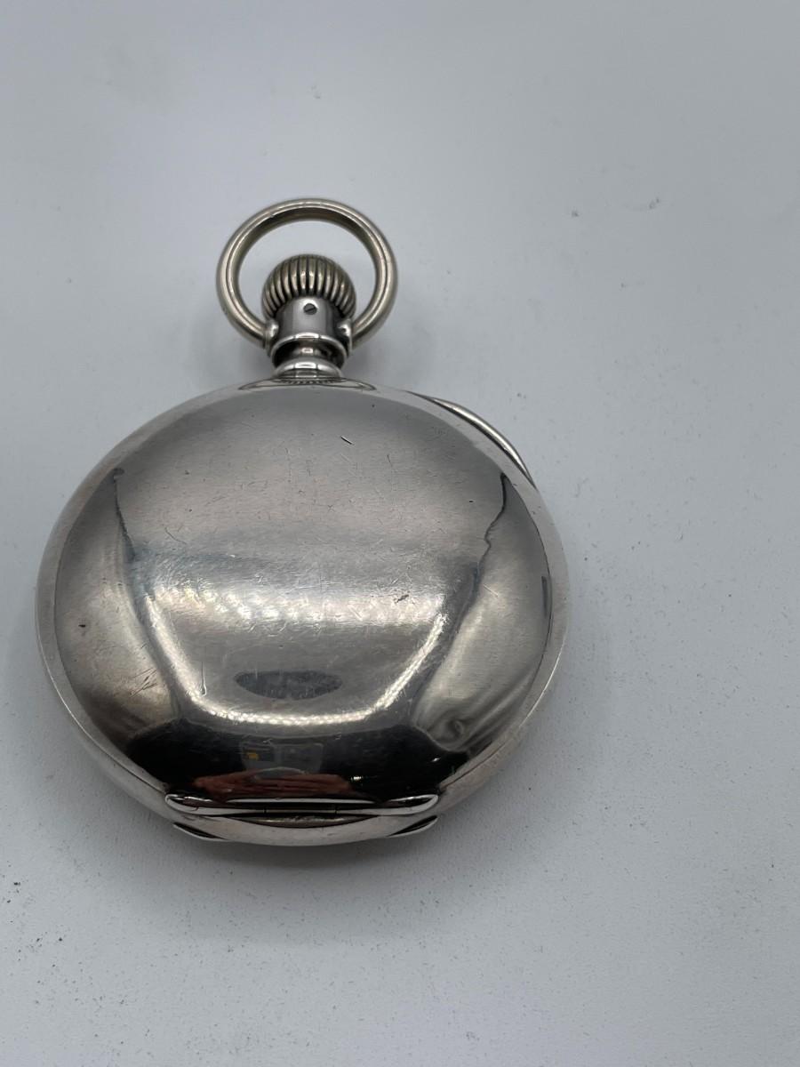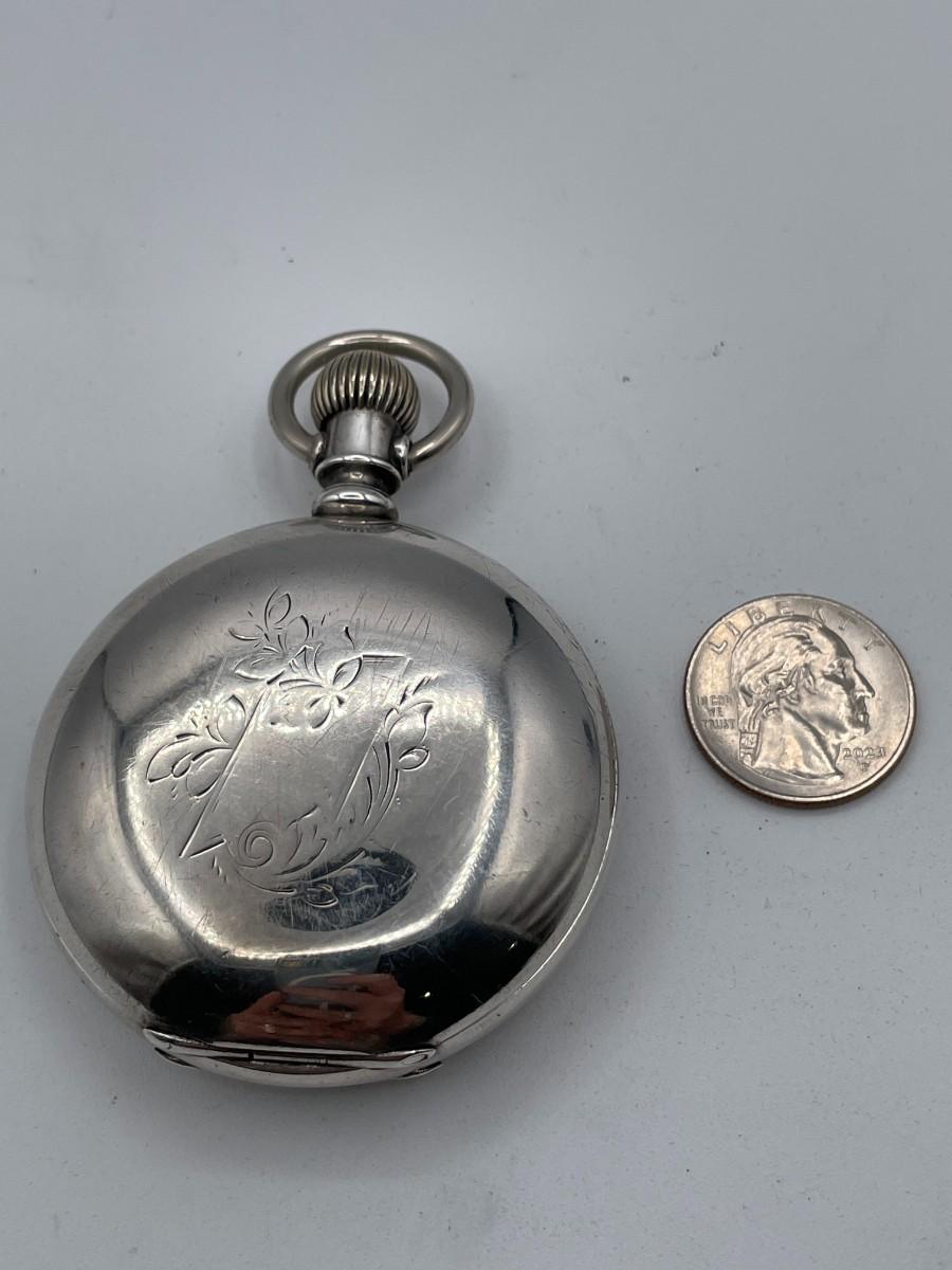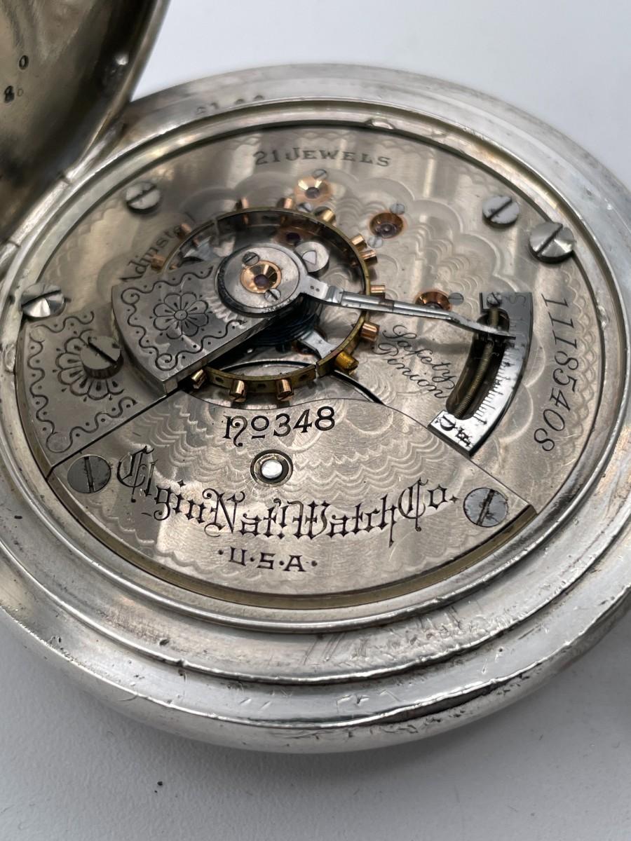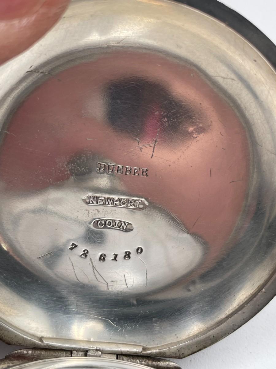 Elgin Pock watch no. (11185408), Size 18S, Production Yr. 1883. Case: Duebert Newpoint Coin, No. 726180, Solid with Emblem on the front case. Condition - Winder & watch are in working order. This is not a guarantee that all parts are original nor is the watch autheniticated.