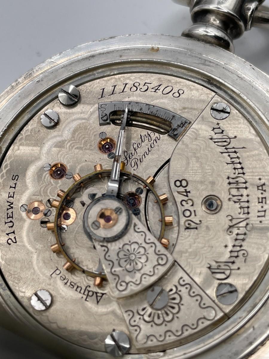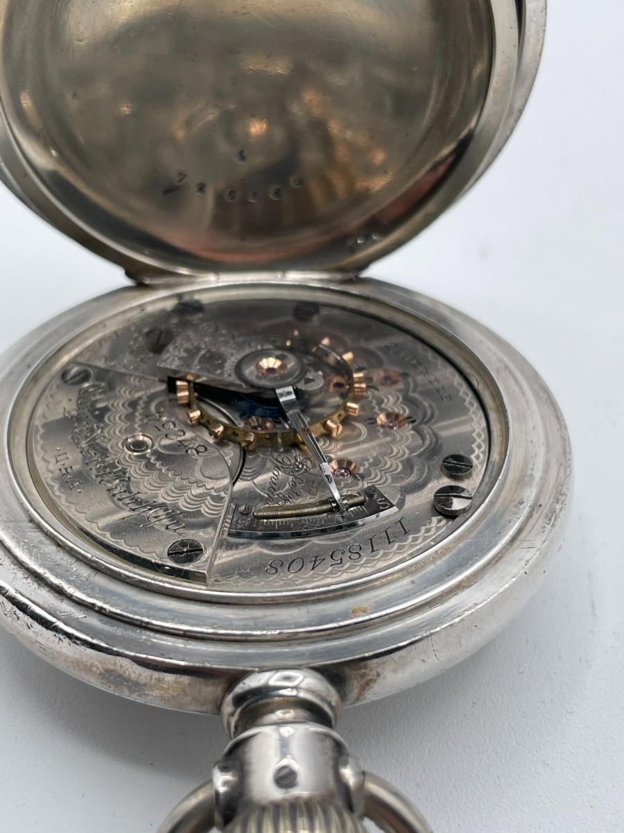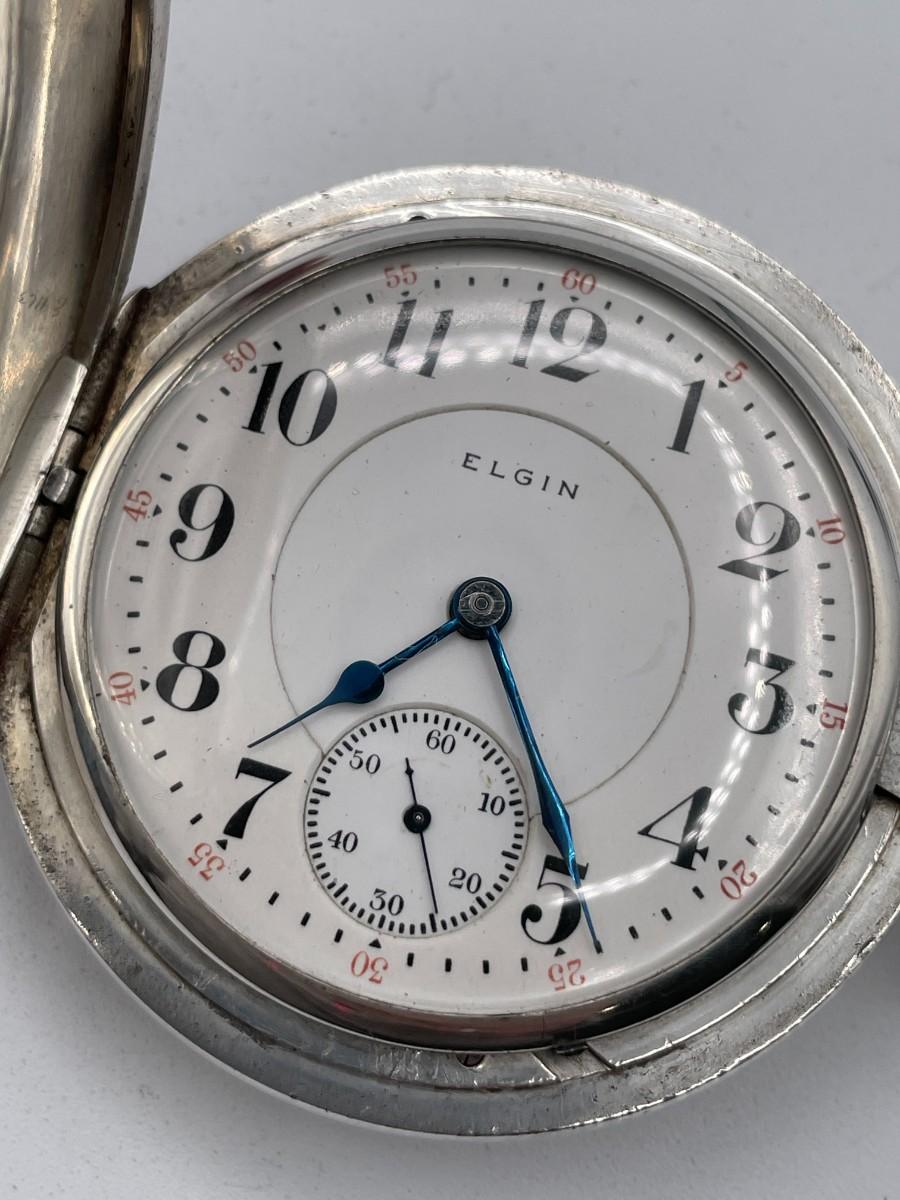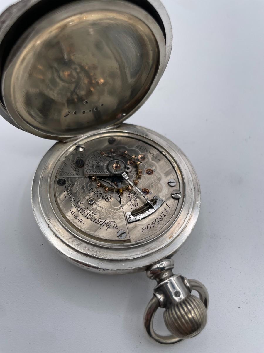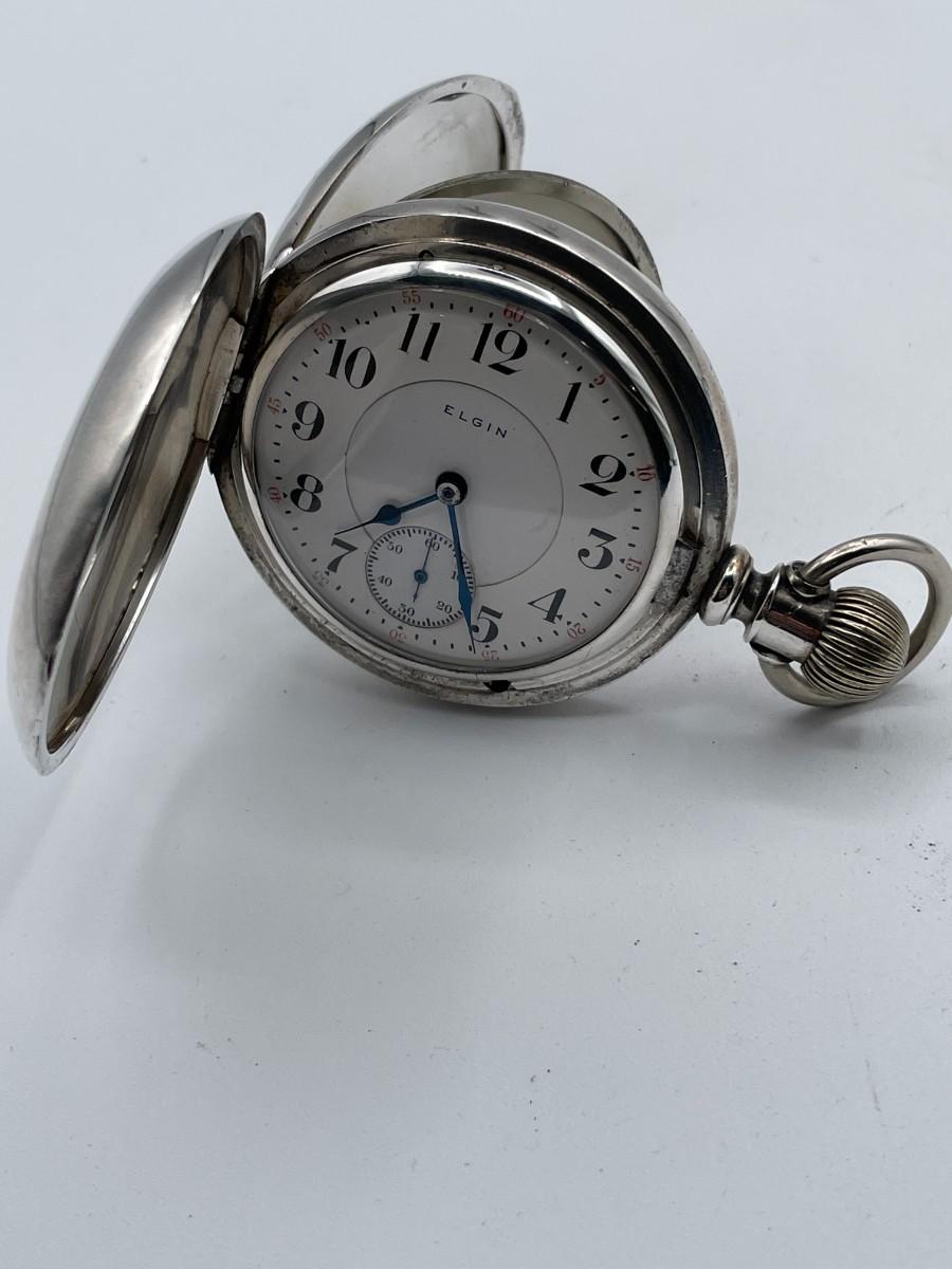Elgin Pock watch no. (11185408), Size 18S, Production Yr. 1883. Case: Duebert Newpoint Coin, No. 726180, Solid with Emblem on the front case. Condition - Winder & watch are in working order. This is not a guarantee that all parts are original nor is the watch autheniticated.