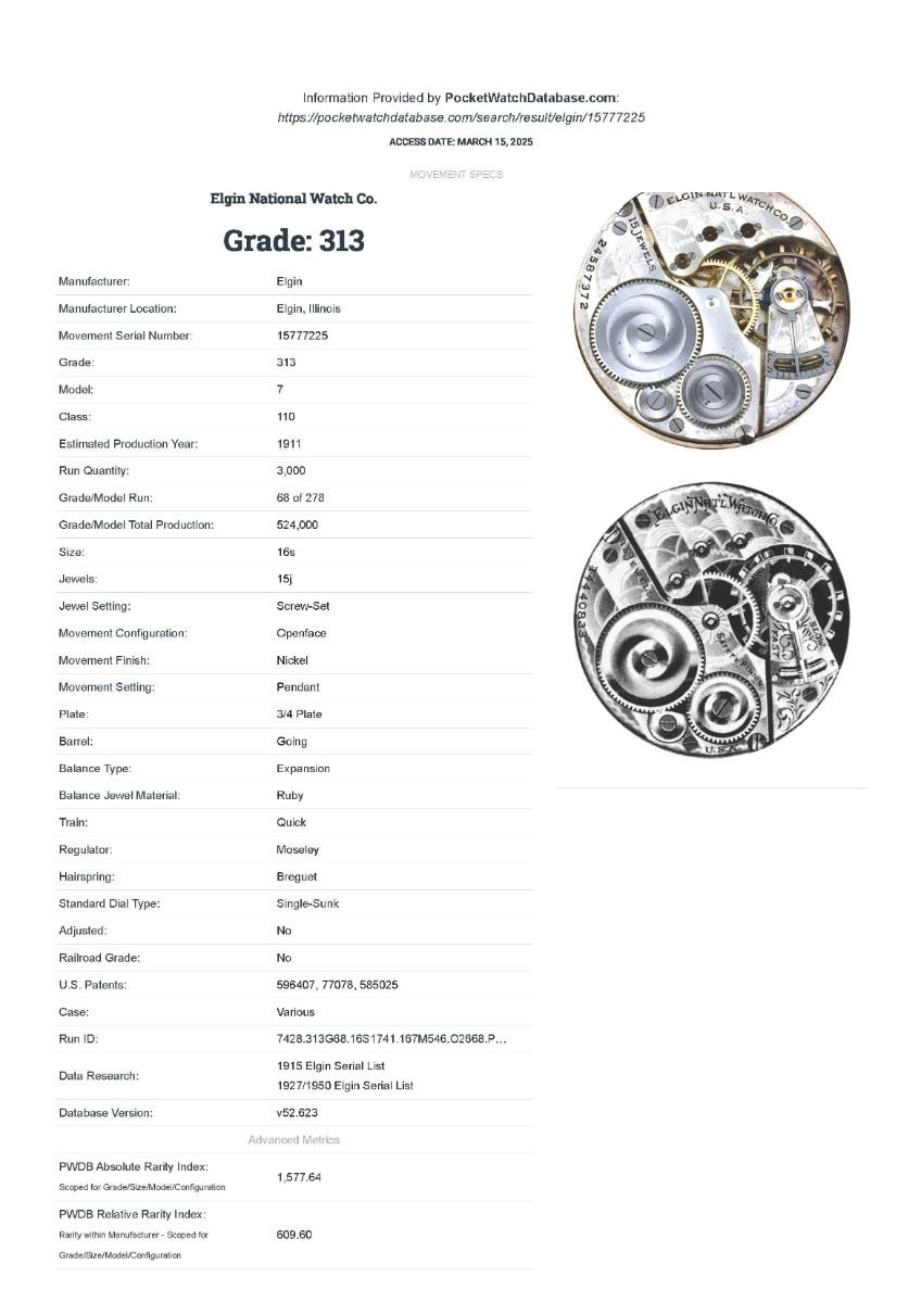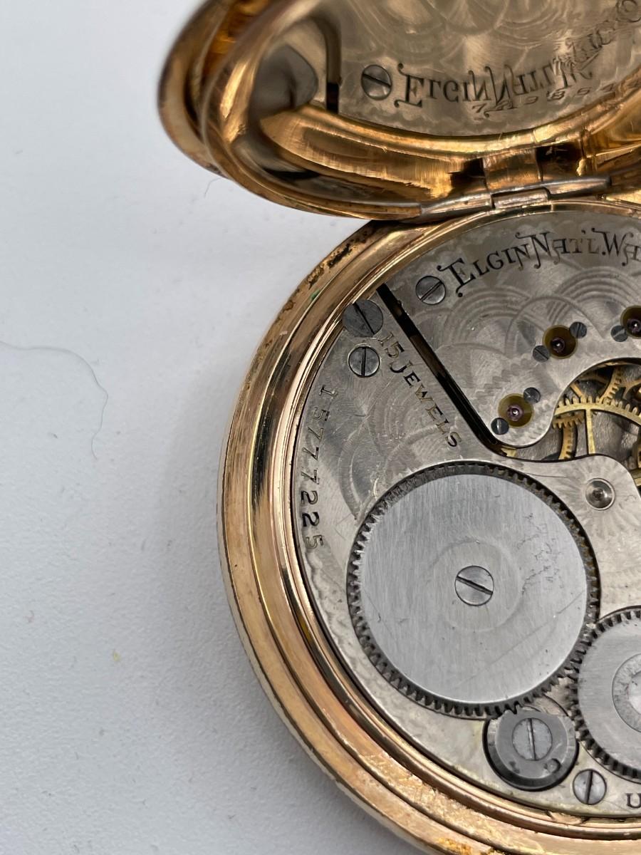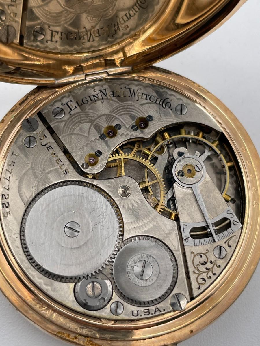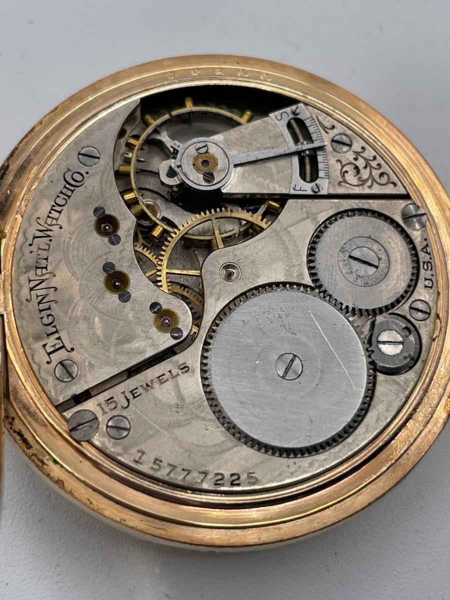 Elgin Pocket watch No. (15777225), Size 16S, Production Yr 1911, 15 Jewels. Case: Jboss Guaranteed 25 years No. 7298644. Condition - Winder & watch are in working order. This is not a guarantee that all parts are original nor is the watch autheniticated.
