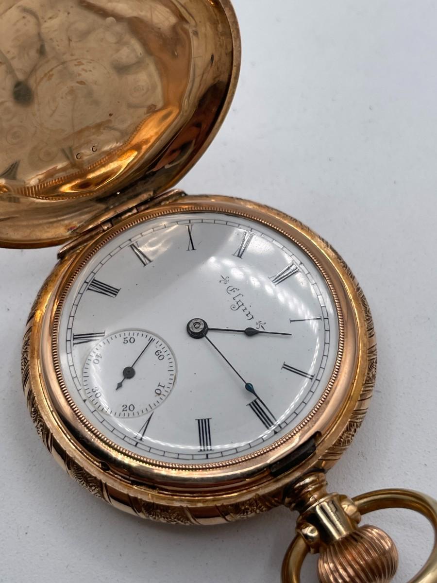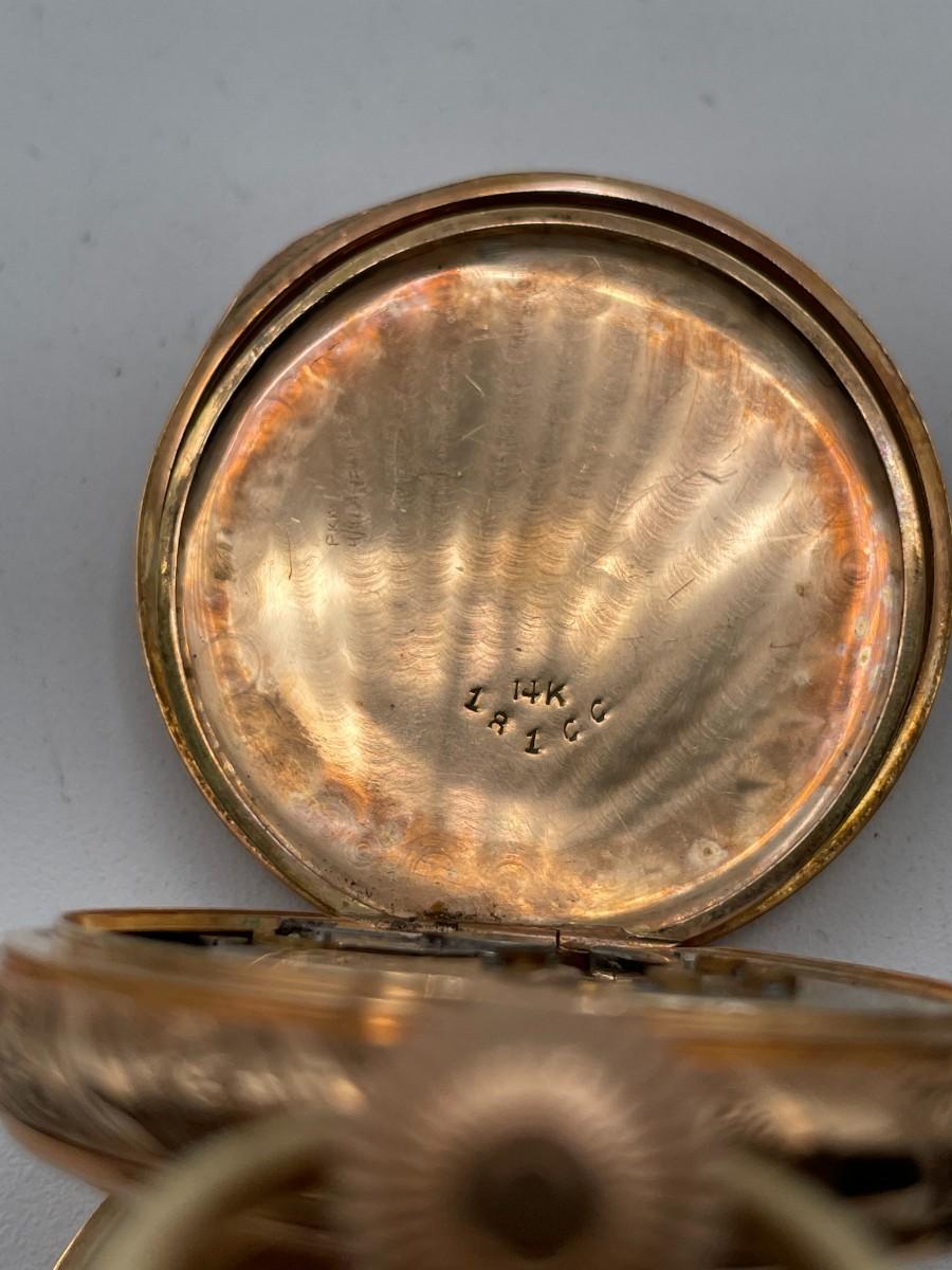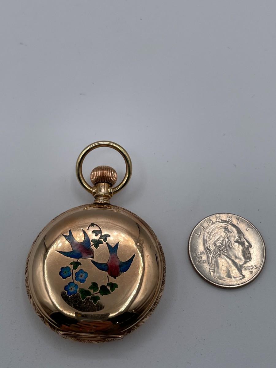 Elgin Pocket watch No. (6705289), Size 6S, Production Yr. 1897. Case: US Assay 14K warrantied, No. 181cc. Colorful birds on front case. Condition - Winder & watch are in working order. This is not a guarantee that all parts are original nor is the watch autheniticated.