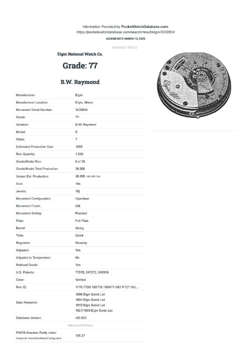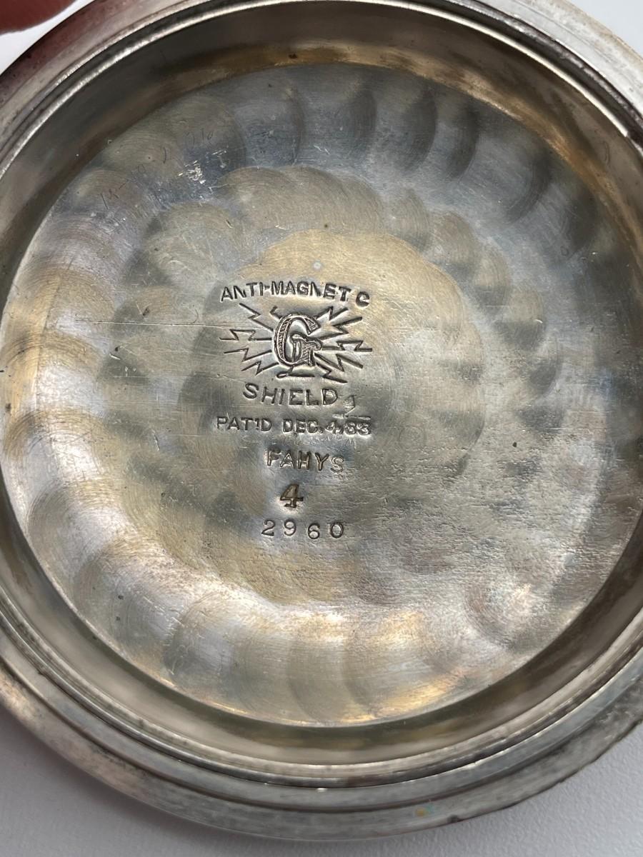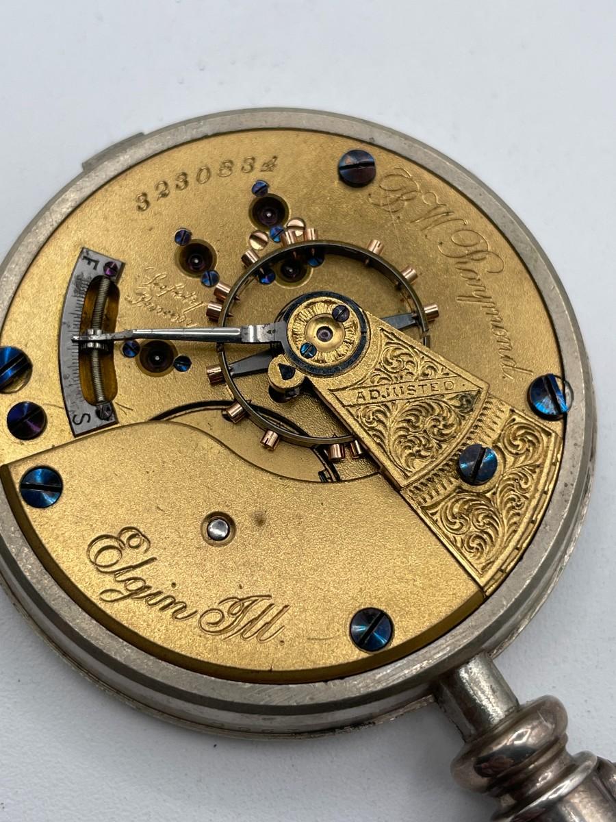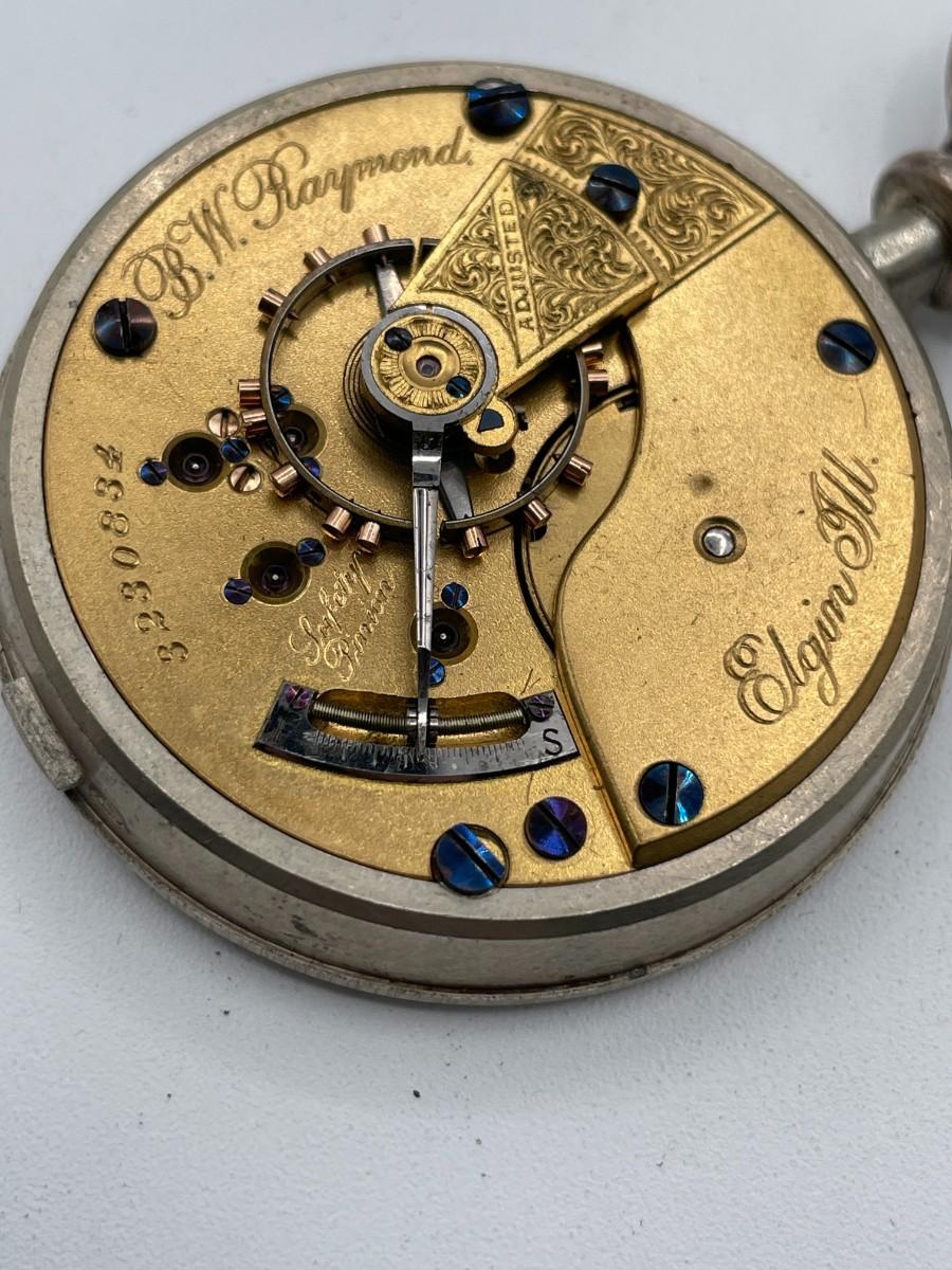 Elgin Nat'l Watch, BW Raymond, No. 3230834, Size 18s, Prod Yr. 1889. Case: Anti-Magnetic Shield, Fahys 4, No. 2960. Condition - Winder & watch are in working order. This is not a guarantee that all parts are original nor is the watch autheniticated.
