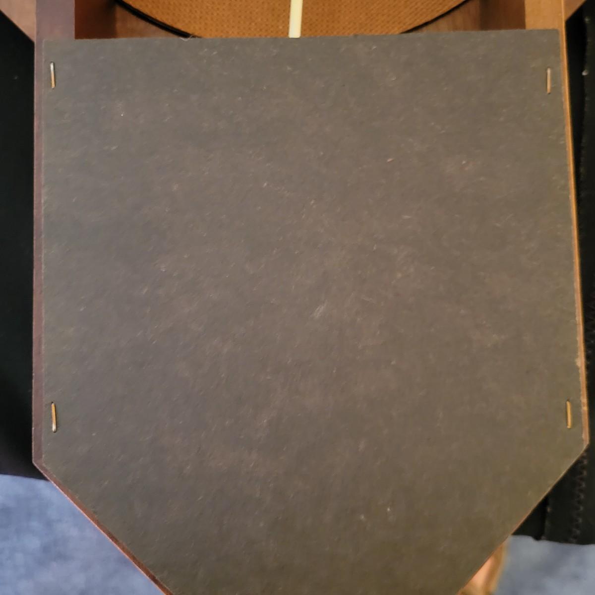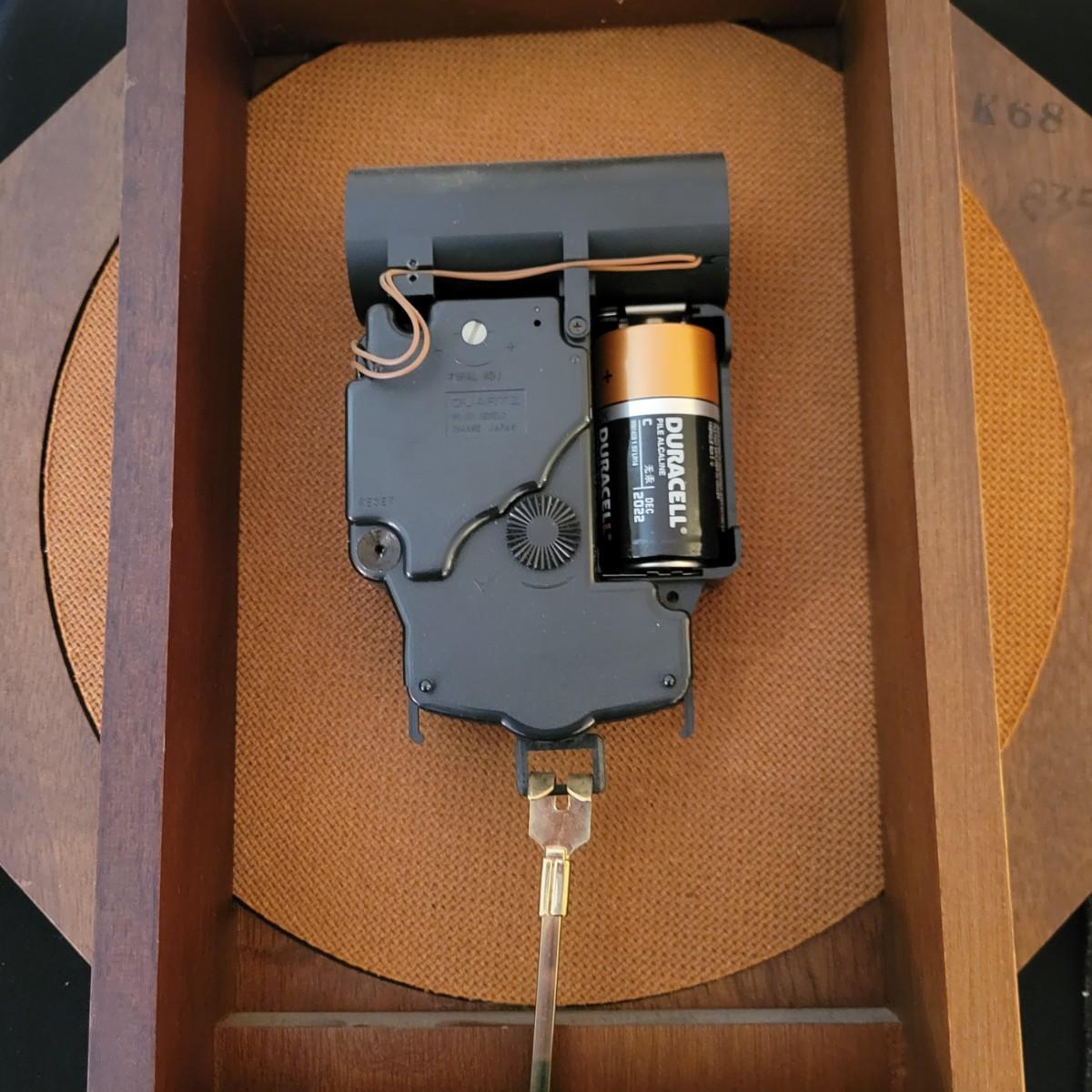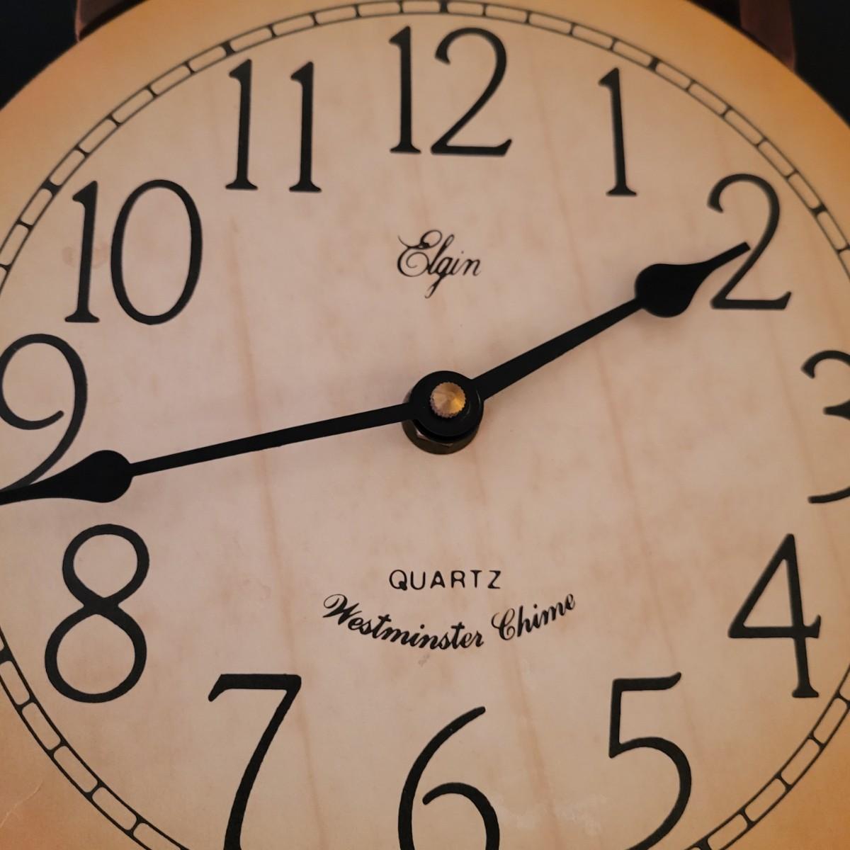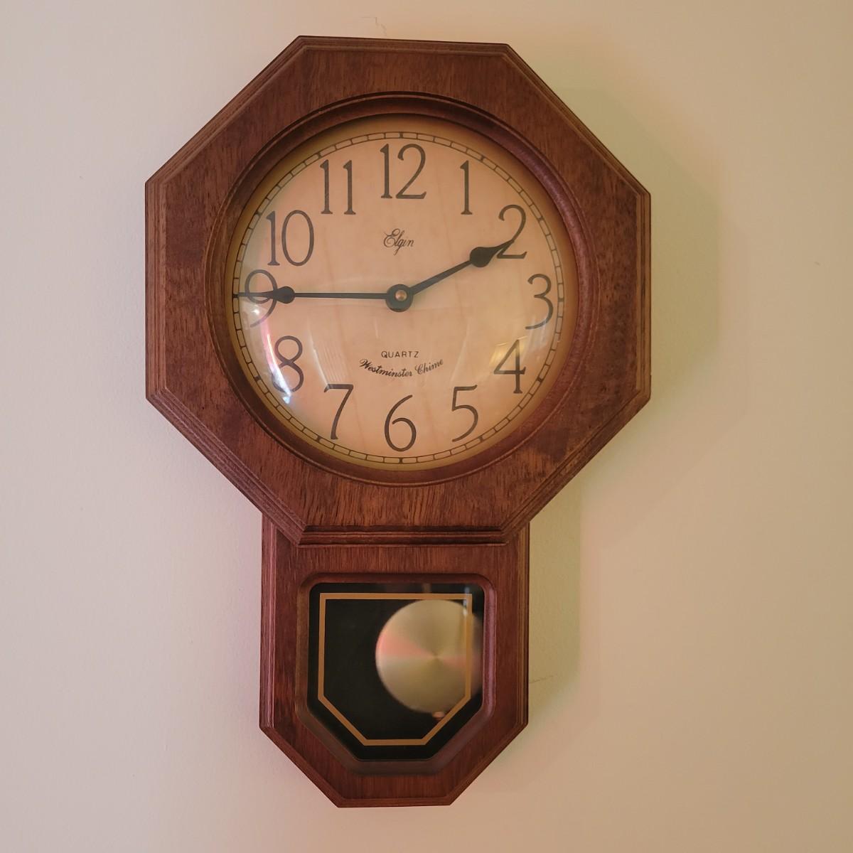 An Elgin wall clock that powered on when a battery was installed. It features a solid wood frame with a battery powered quartz clock. It measures approximately 11" x 3" x 17.5"H. Shipping available