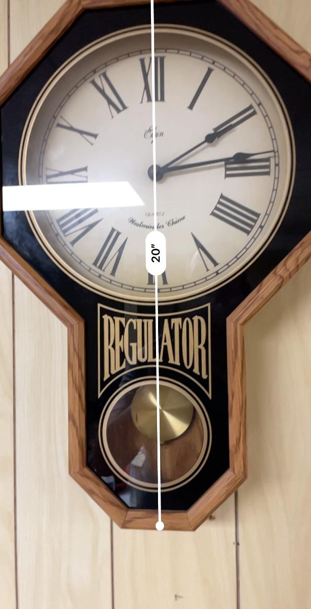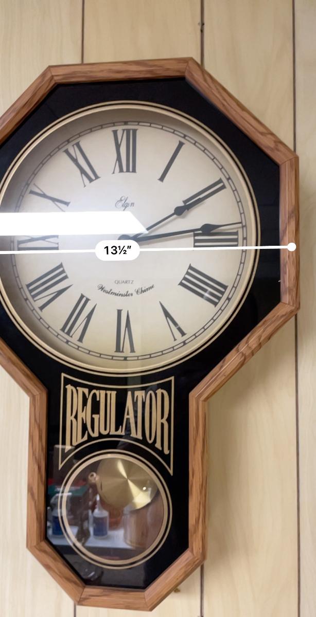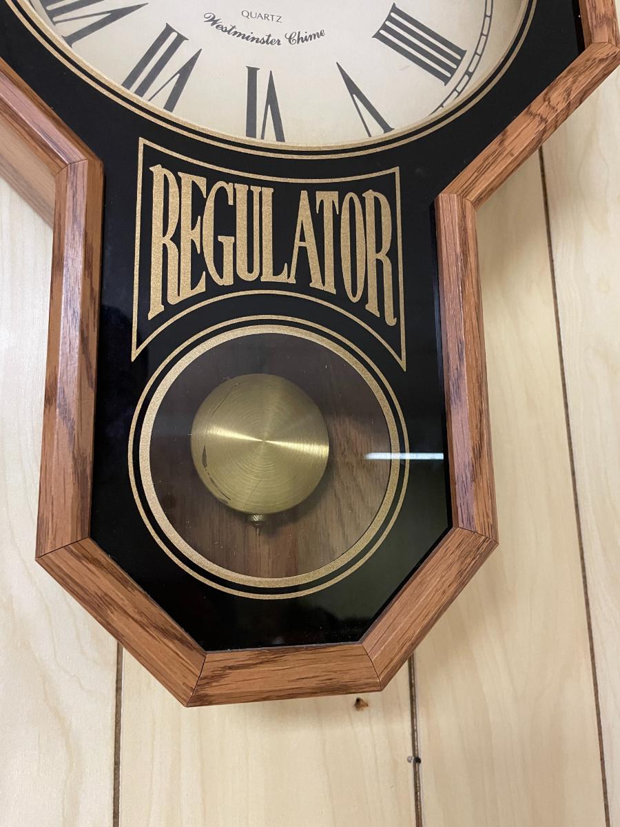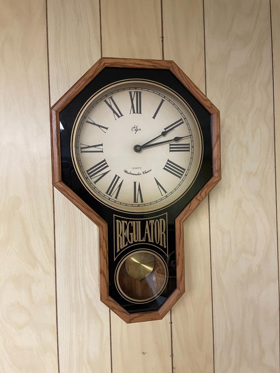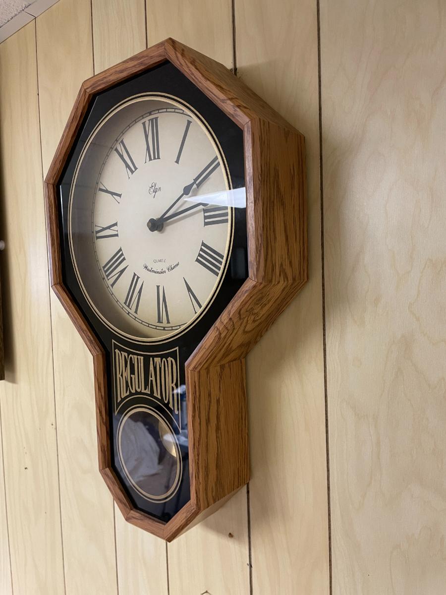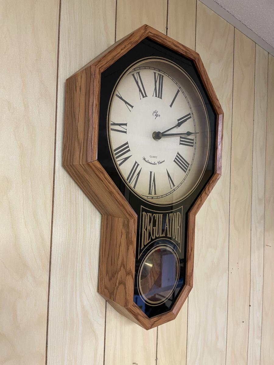 Elgin battery operated wall clock with quartz movement and Westminster chime. Features an octagonal oak frame, with 'Regulator' text and an inset pendulum behind glass. The clock's face displays Roman numerals and measures approximately 13.5 inches in diameter, with the entire piece being 27 inches tall and 3 inches deep. Overall construction appears sturdy.