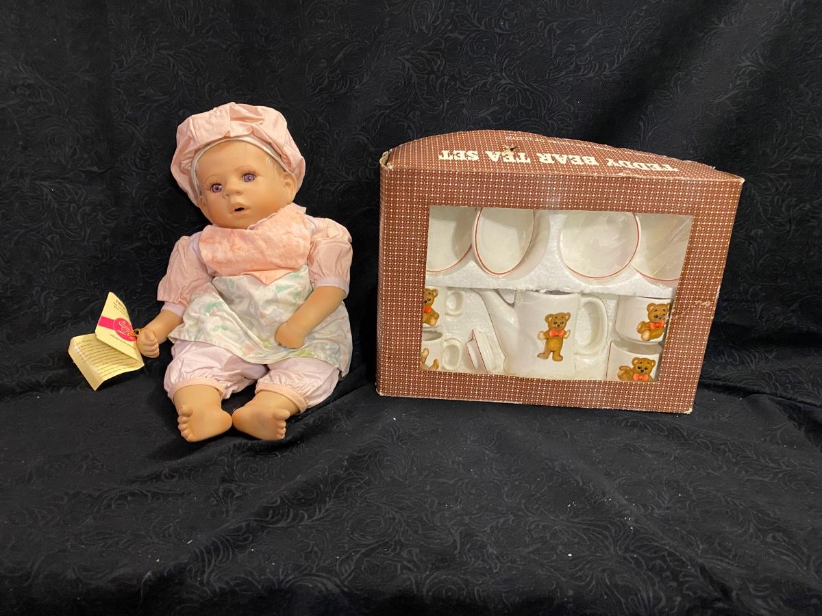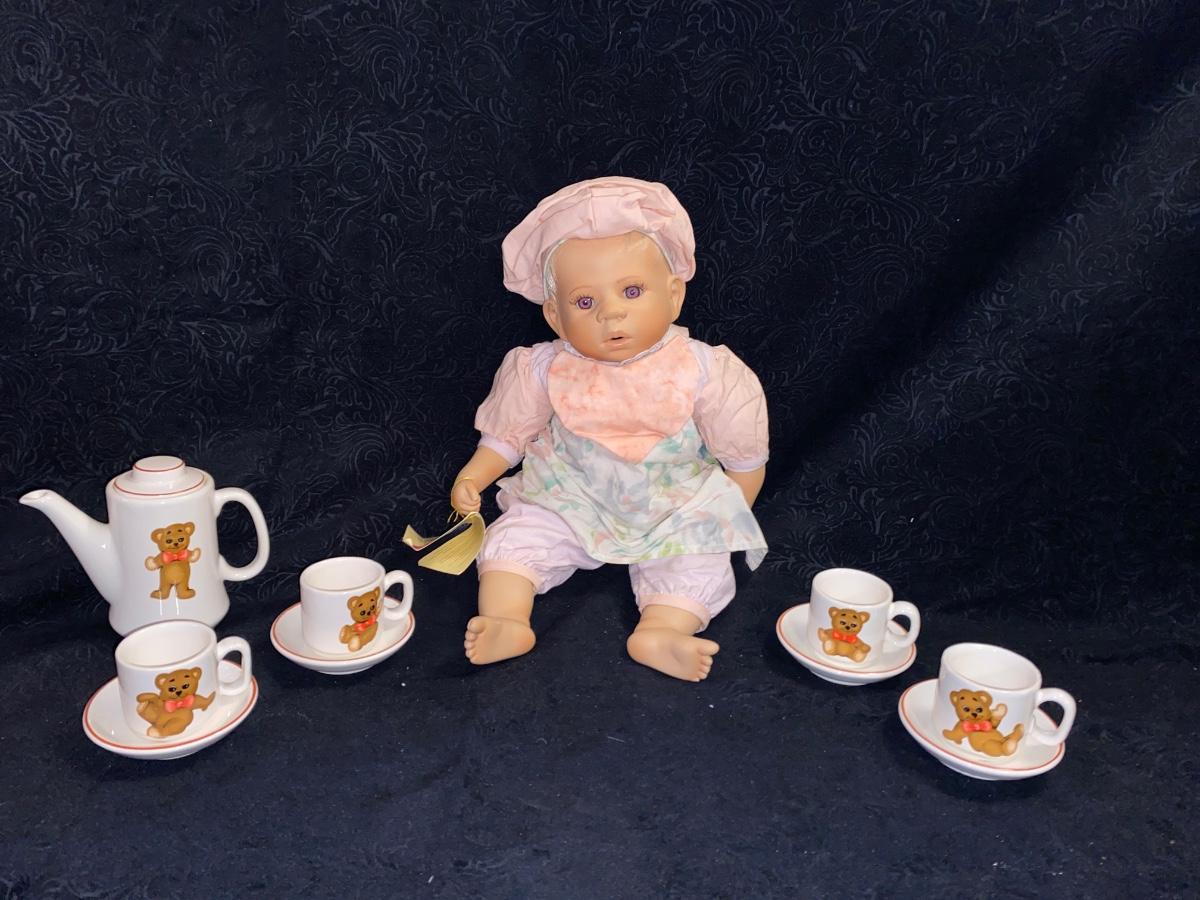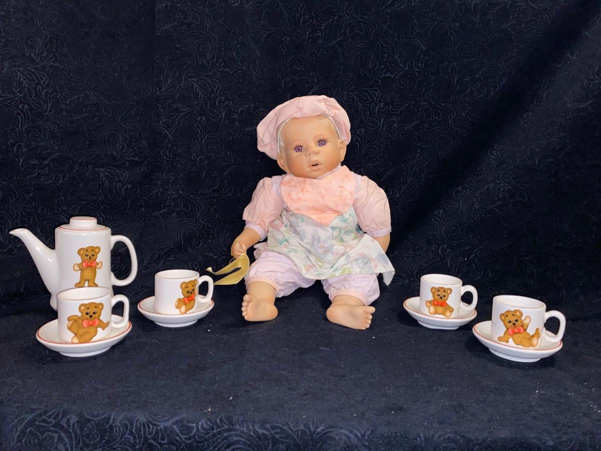 ELITE DOLLS PORCELAIN BABY ZACHARY AND TEDDY BEAR CHILD TEA SET