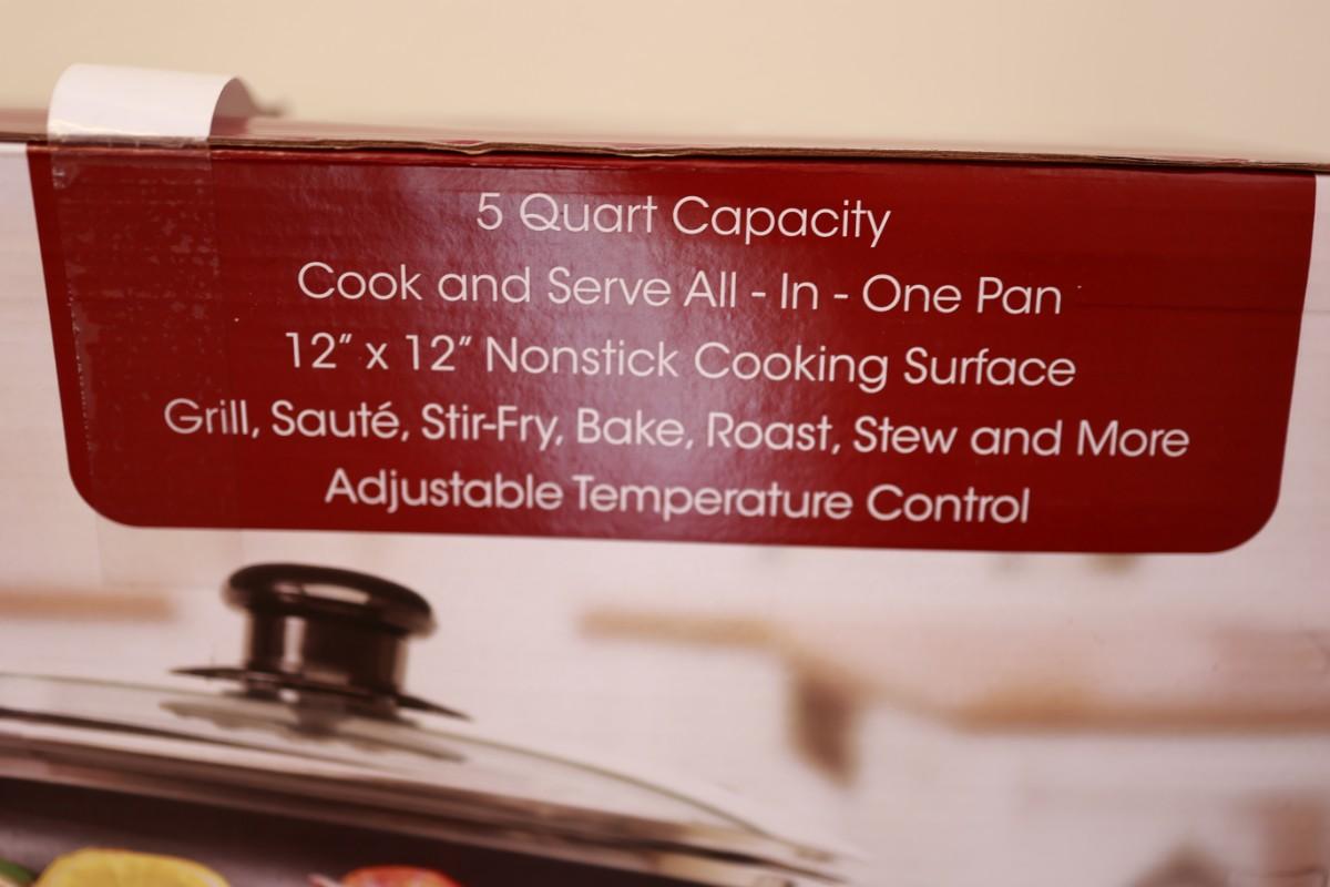 It boasts a 5-quart capacity, a 12" x 12" nonstick cooking surface, and adjustable temperature control.