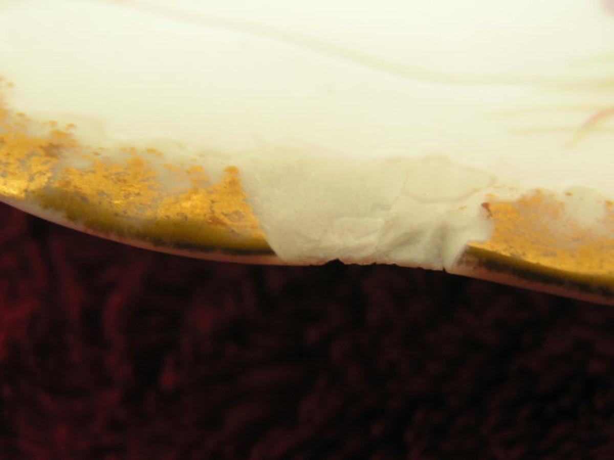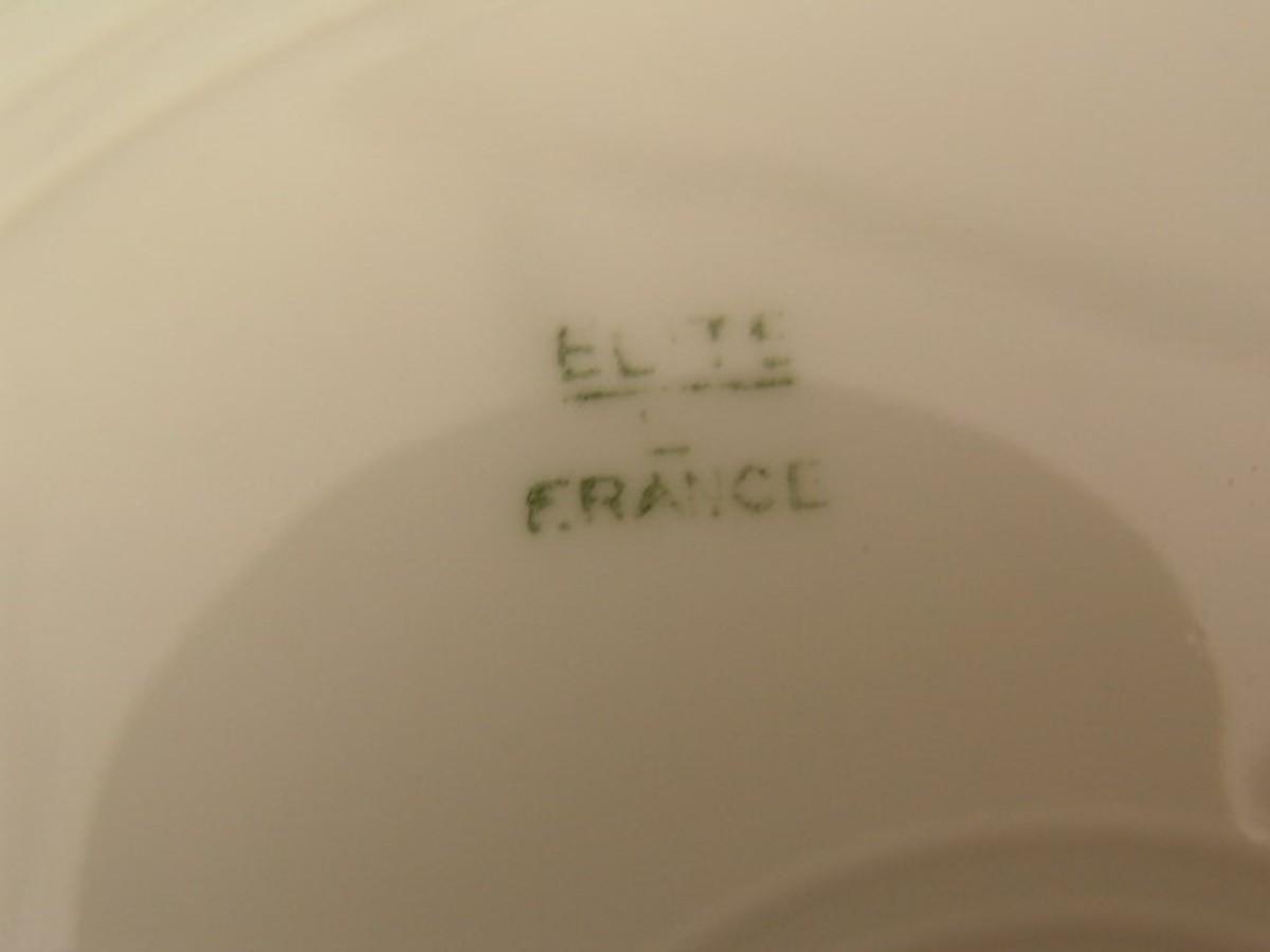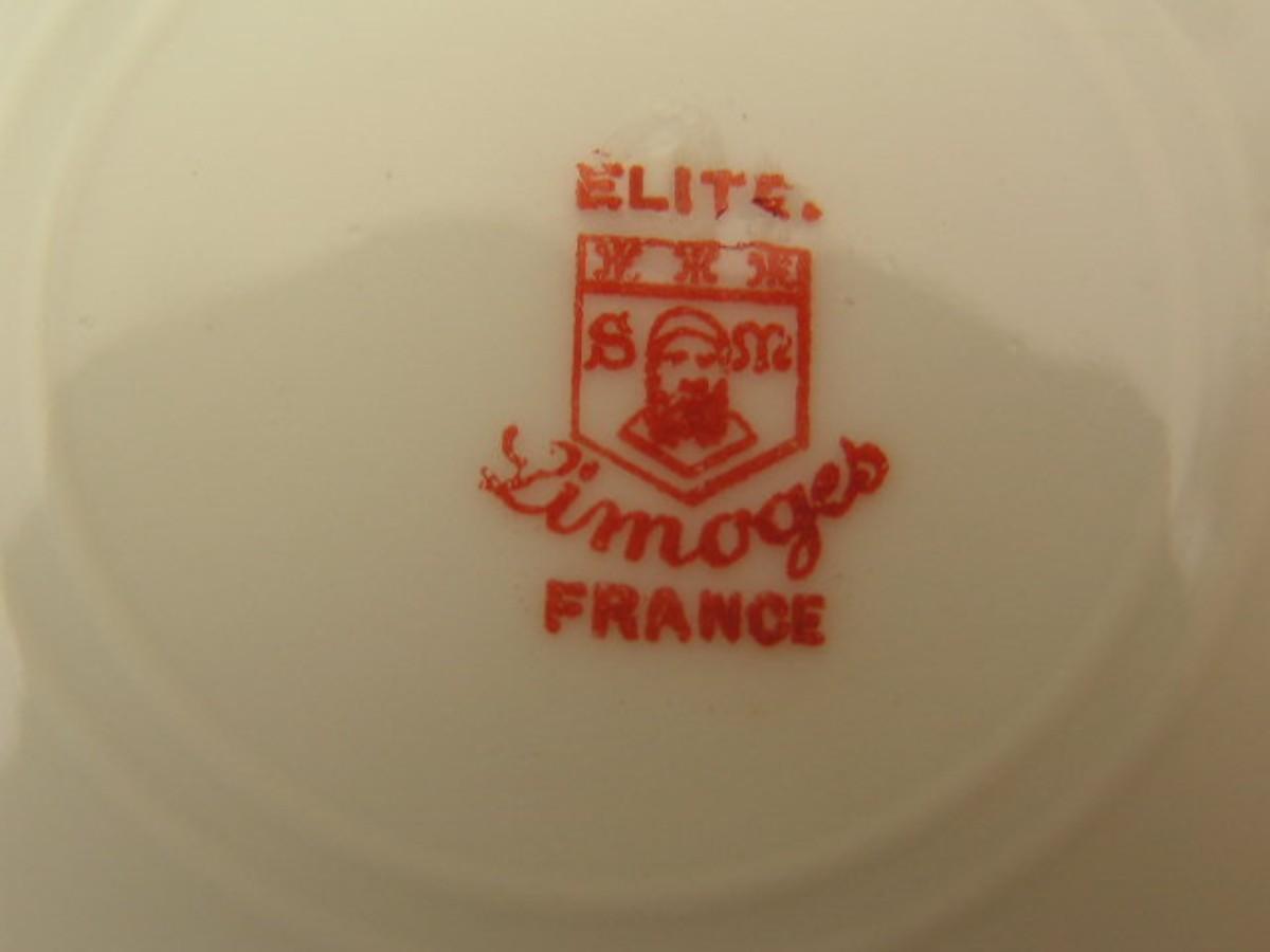 Elite Limoges, France. Vintage/antique hand painted porcelain plate w/floral designs and gold trim. About 10-1/4" diameter. The S M symbols inside the shield logo on the back indicates it was made between 1896 & 1900. Rare, hard to find in any conditon. This one unfortunately has a chip on the edge but is still quite valuable.