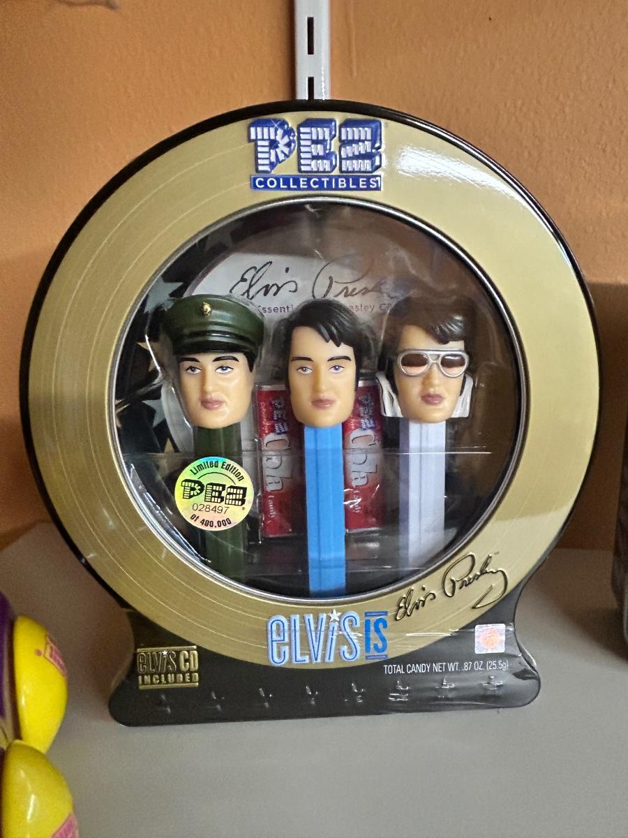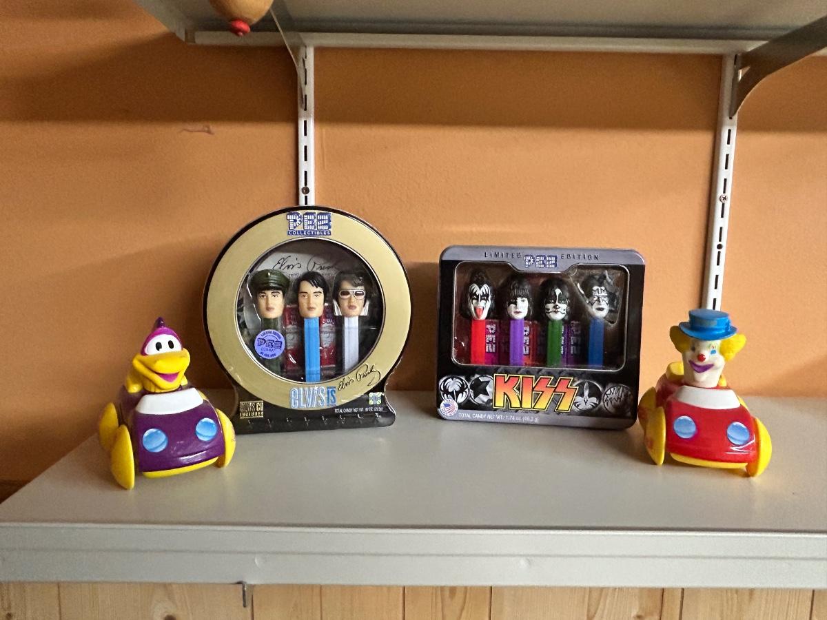 ELIVIS AND KISS COLLECTIBLE PEZ TINS & DINO AND BOZO PEZ CARS